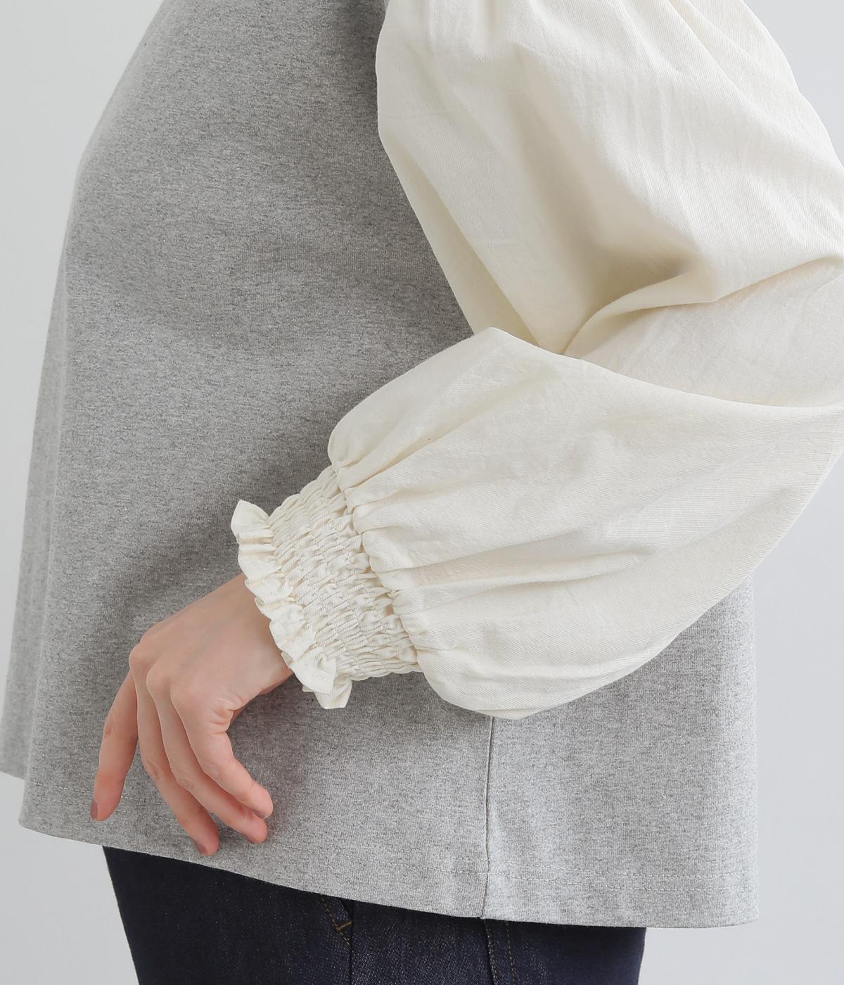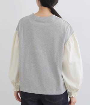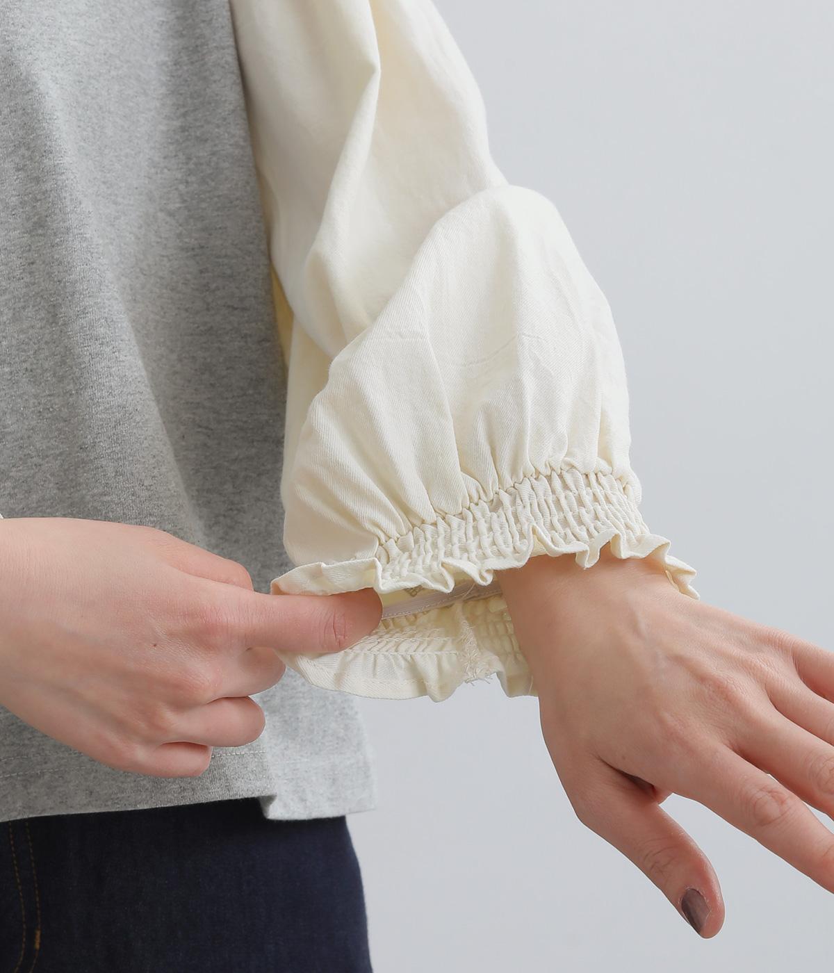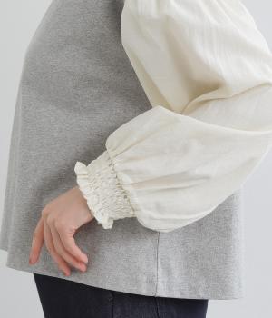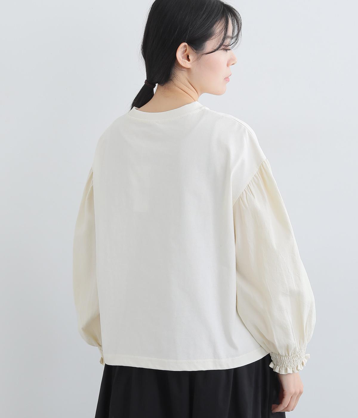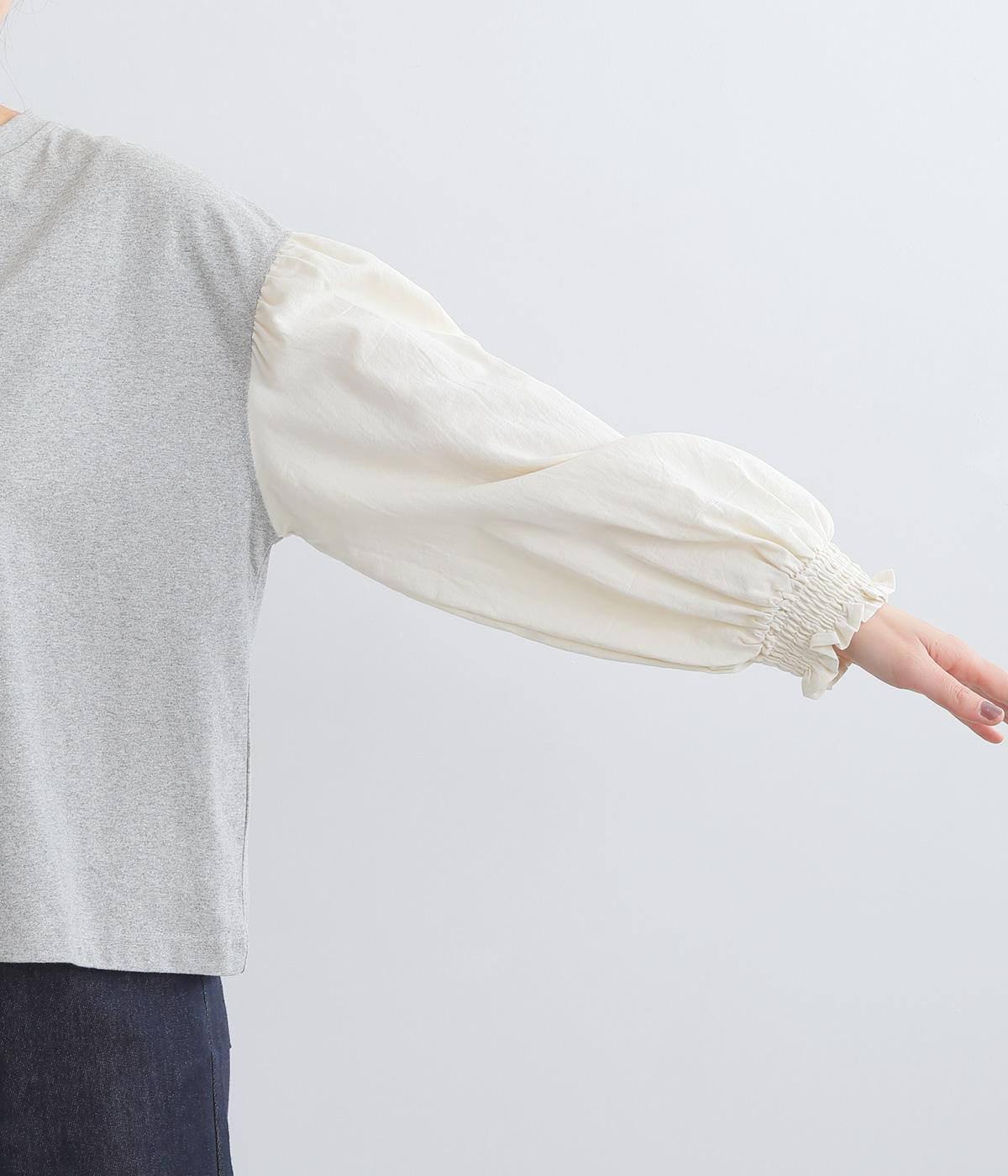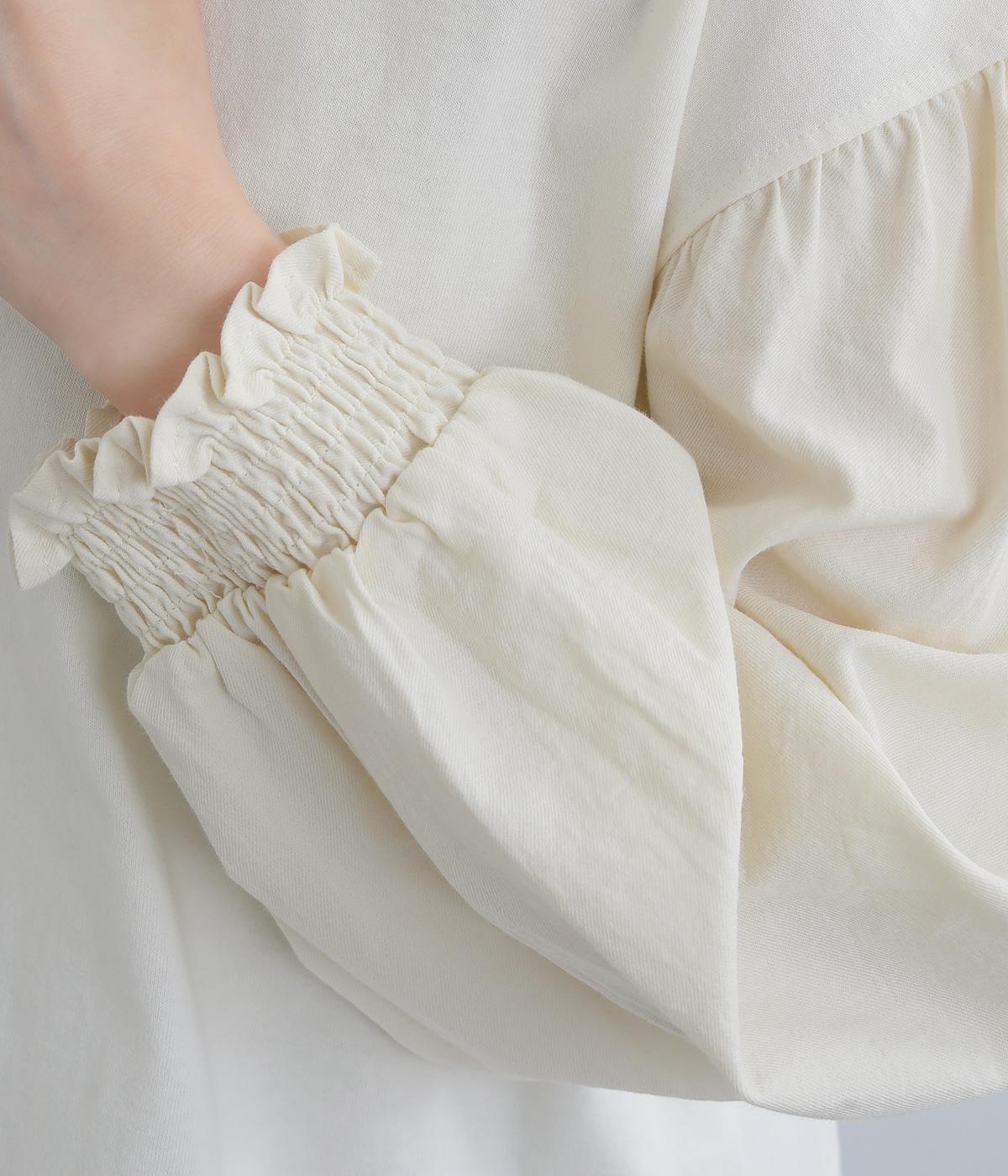 身頃はコットン天竺、袖はシャツ素材に切り替えた異素材プルオーバー。袖口はギャザーゴムとフリルで華やかさを添えました。やや短めの丈でロングスカートやボリュームのあるボトムスとも合わせやすいデザインです。