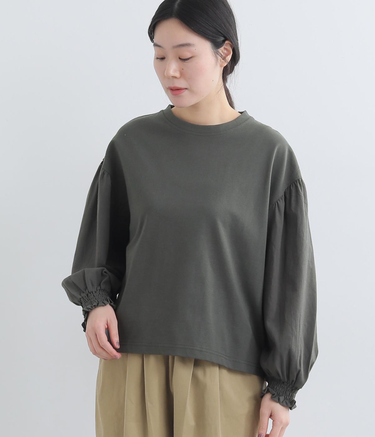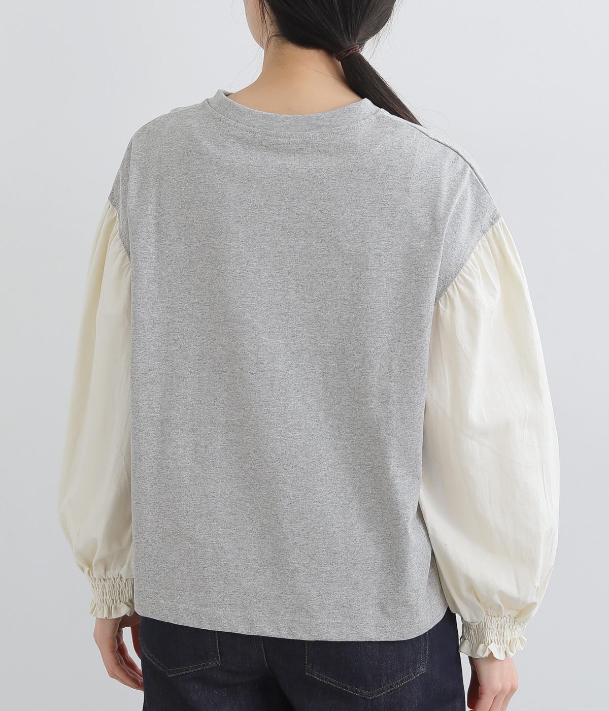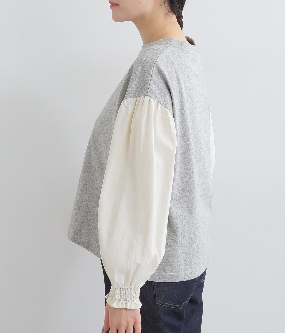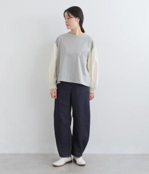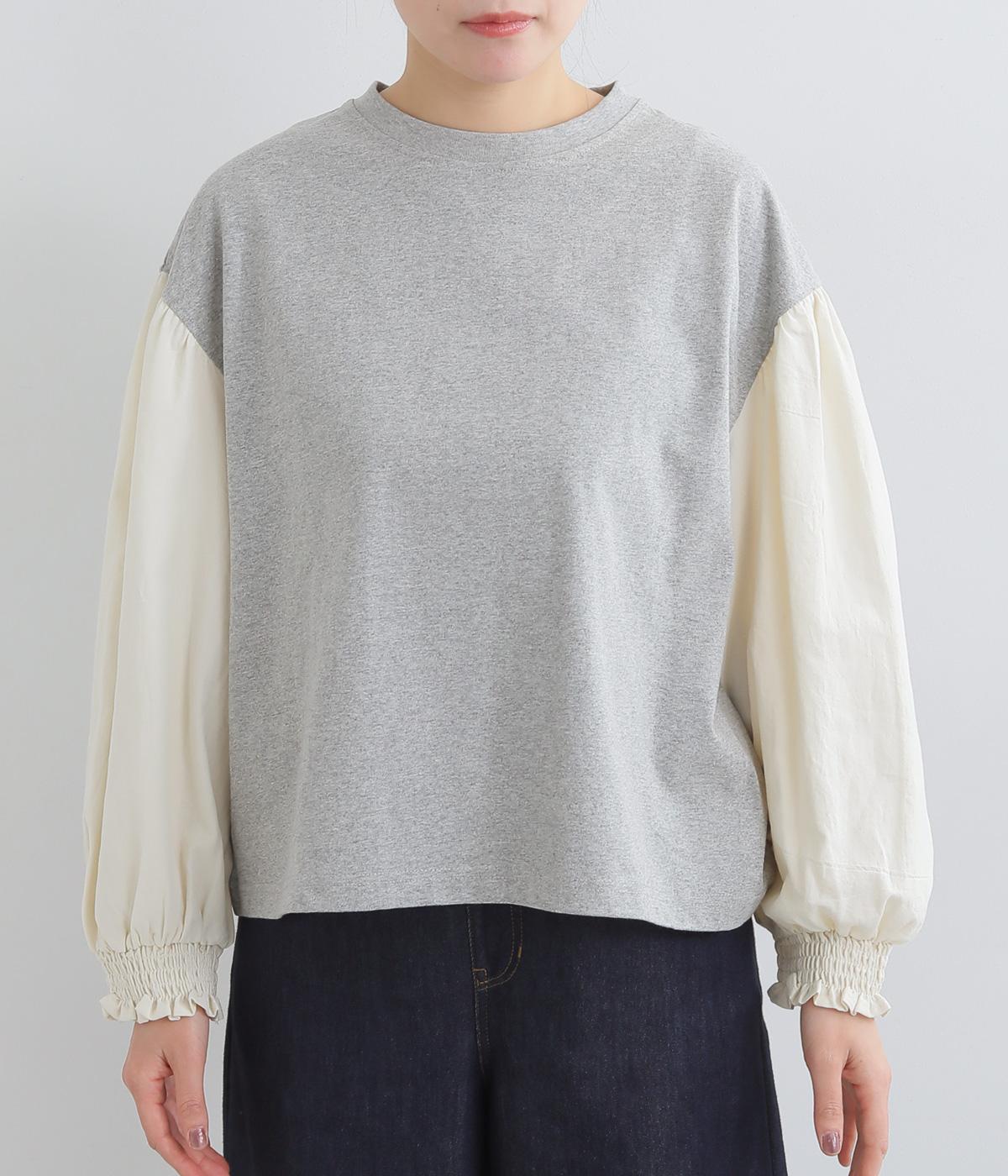 身頃はコットン天竺、袖はシャツ素材に切り替えた異素材プルオーバー。袖口はギャザーゴムとフリルで華やかさを添えました。やや短めの丈でロングスカートやボリュームのあるボトムスとも合わせやすいデザインです。