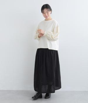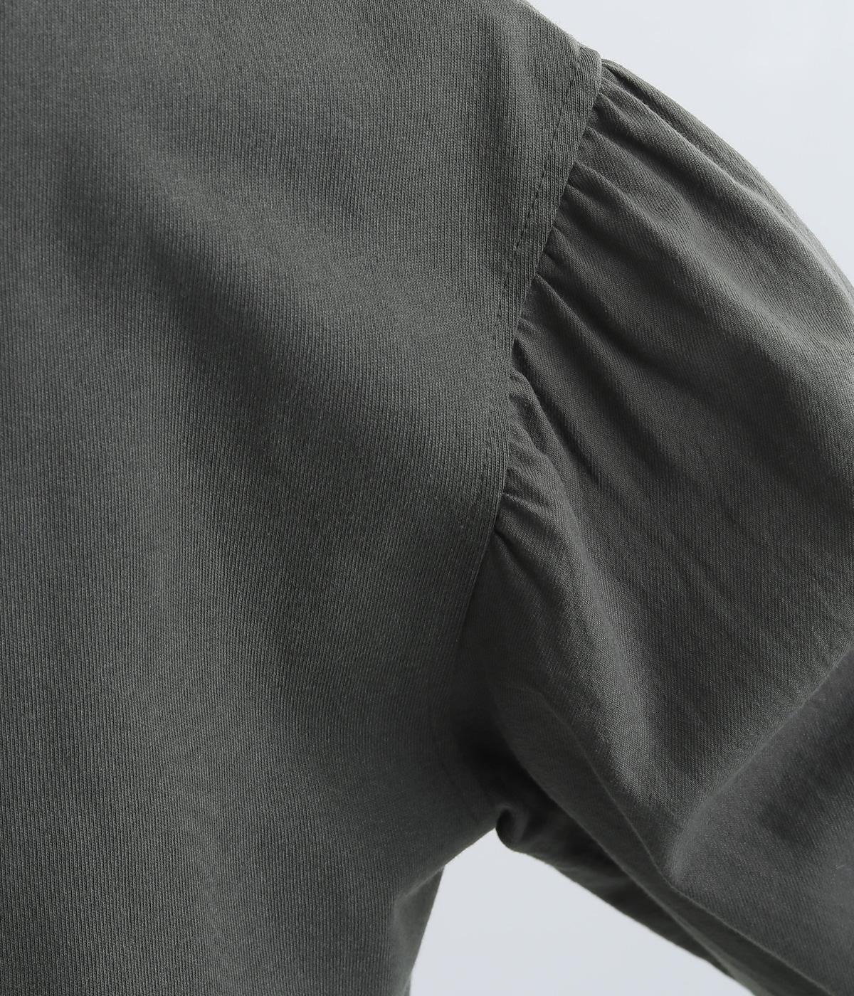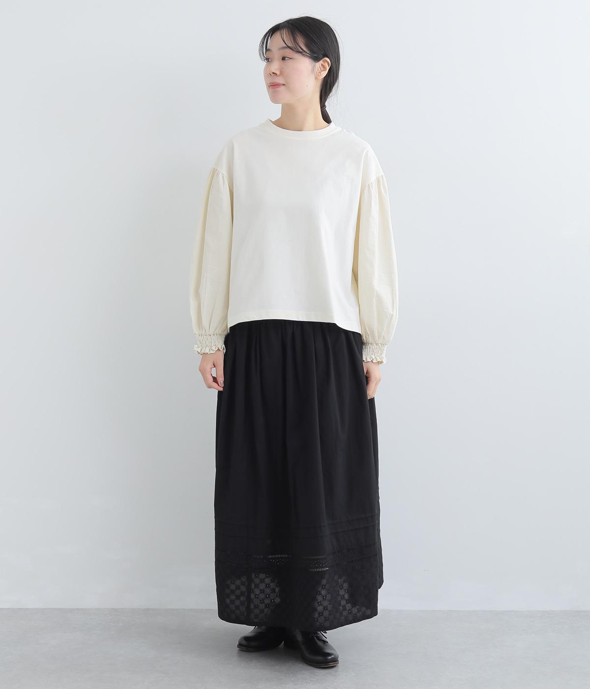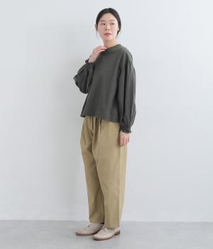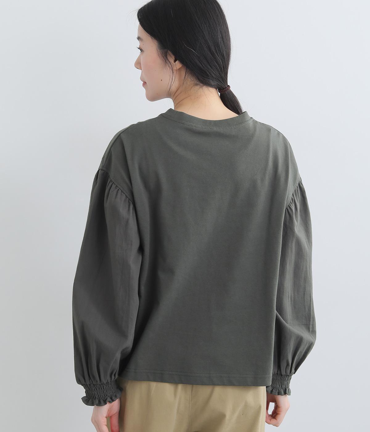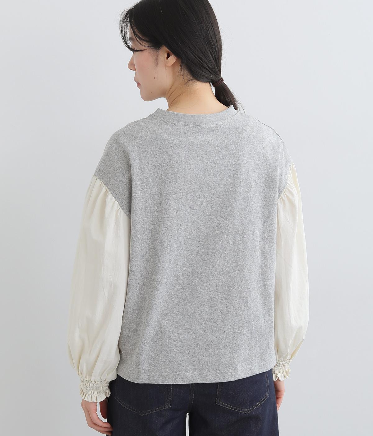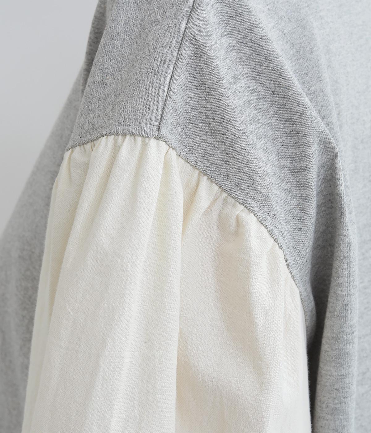 身頃はコットン天竺、袖はシャツ素材に切り替えた異素材プルオーバー。袖口はギャザーゴムとフリルで華やかさを添えました。やや短めの丈でロングスカートやボリュームのあるボトムスとも合わせやすいデザインです。