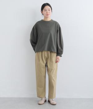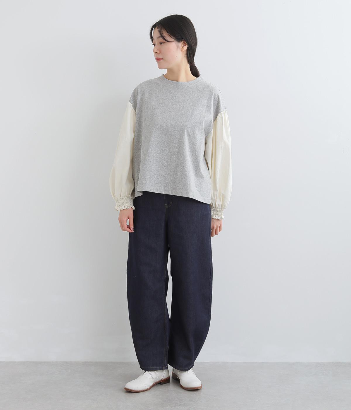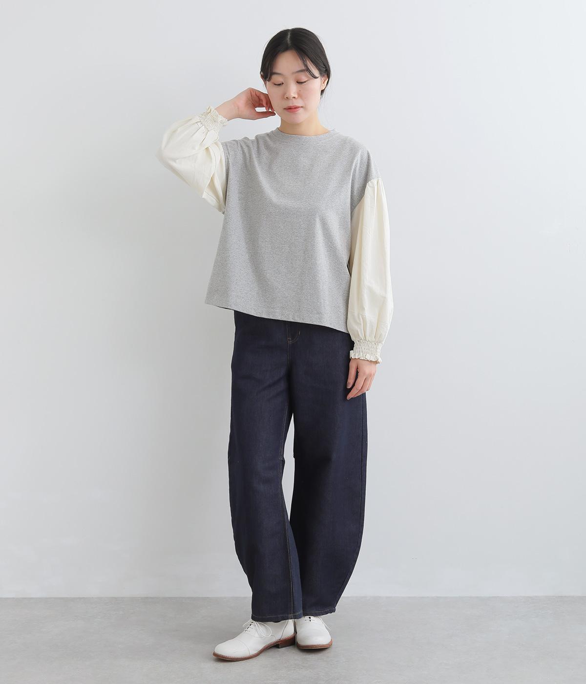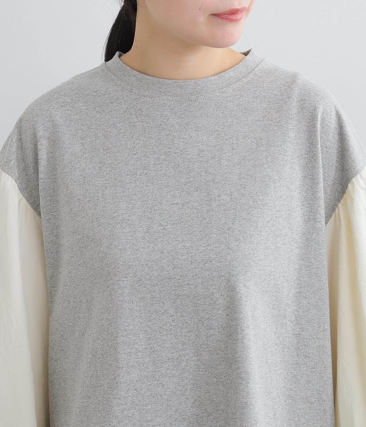 軽くてやわらかいコットン素材を使用しています。身頃部分はコットン天竺のプルオーバー、袖部分はシャツ素材に切り替えになっています。さらりと心地よい着用感が魅力です。