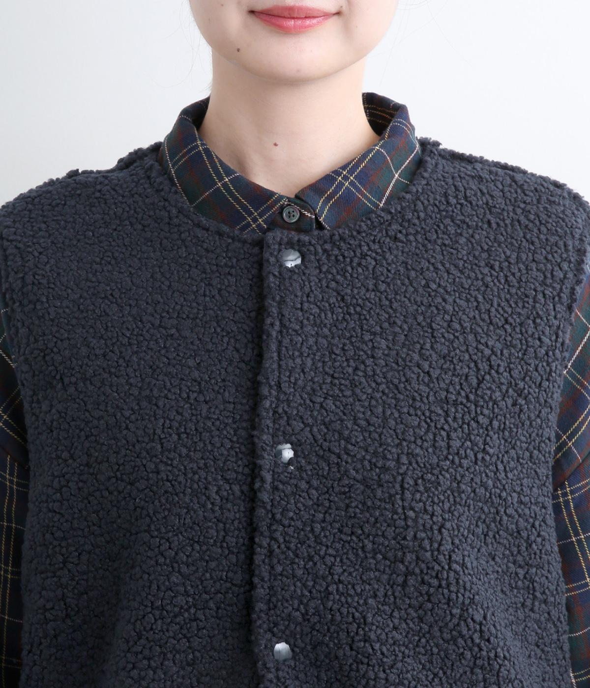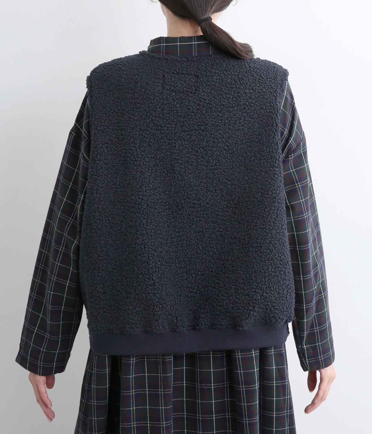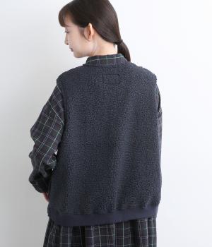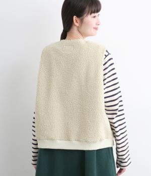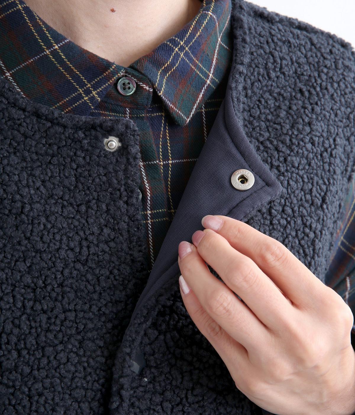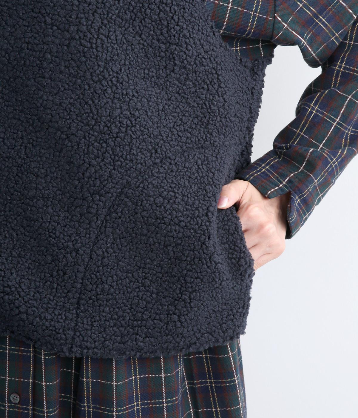 見た目にもあたたかみを感じるボアベスト。前ボタンの色味をベースカラーと統一して、シンプルに大人っぽく仕上げました。後ろ裾に配したリブがアクセントに。ボリュームが出すぎないのでアウターの中に着やすく防寒対策としても活躍します。