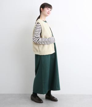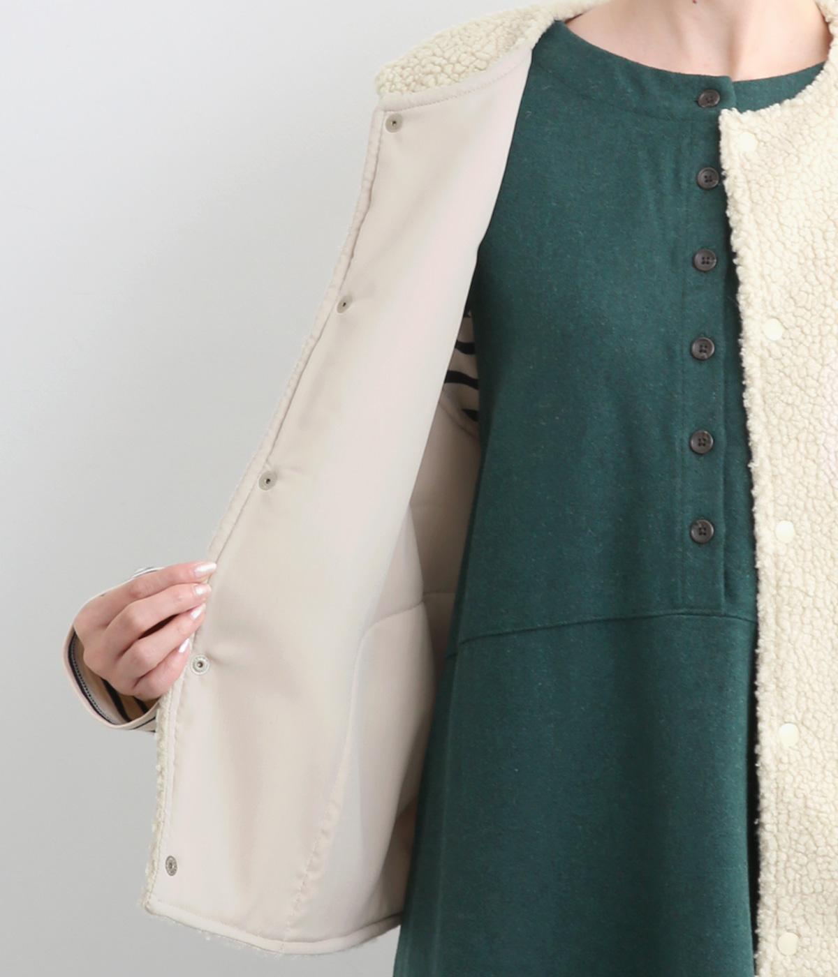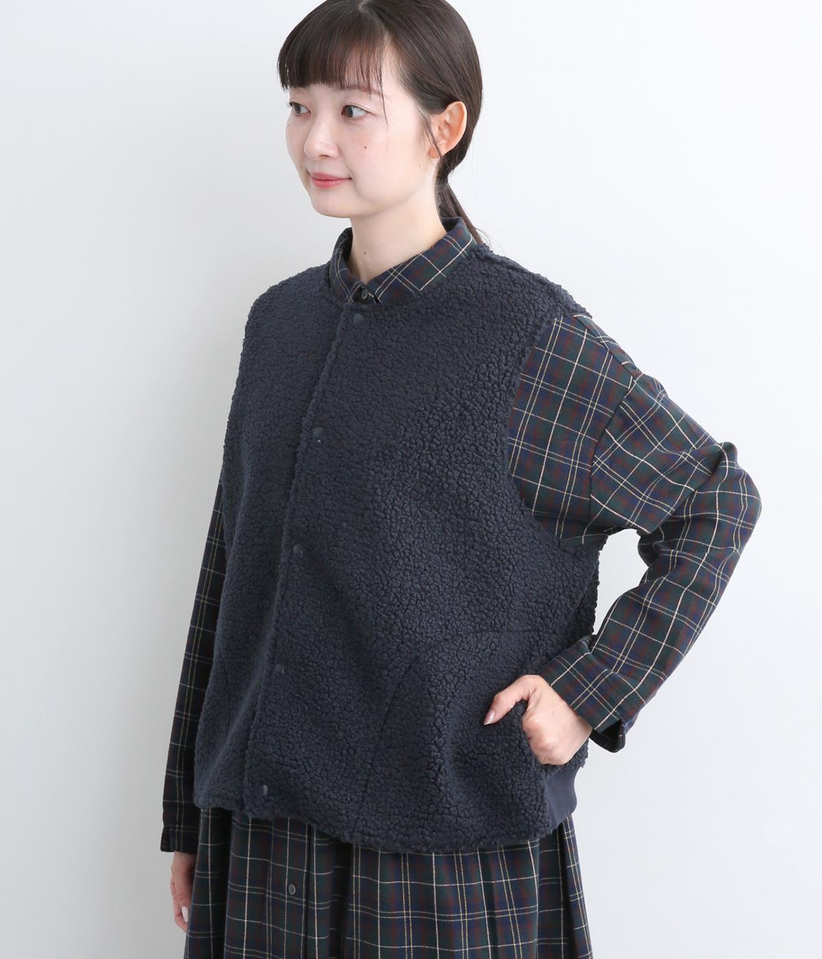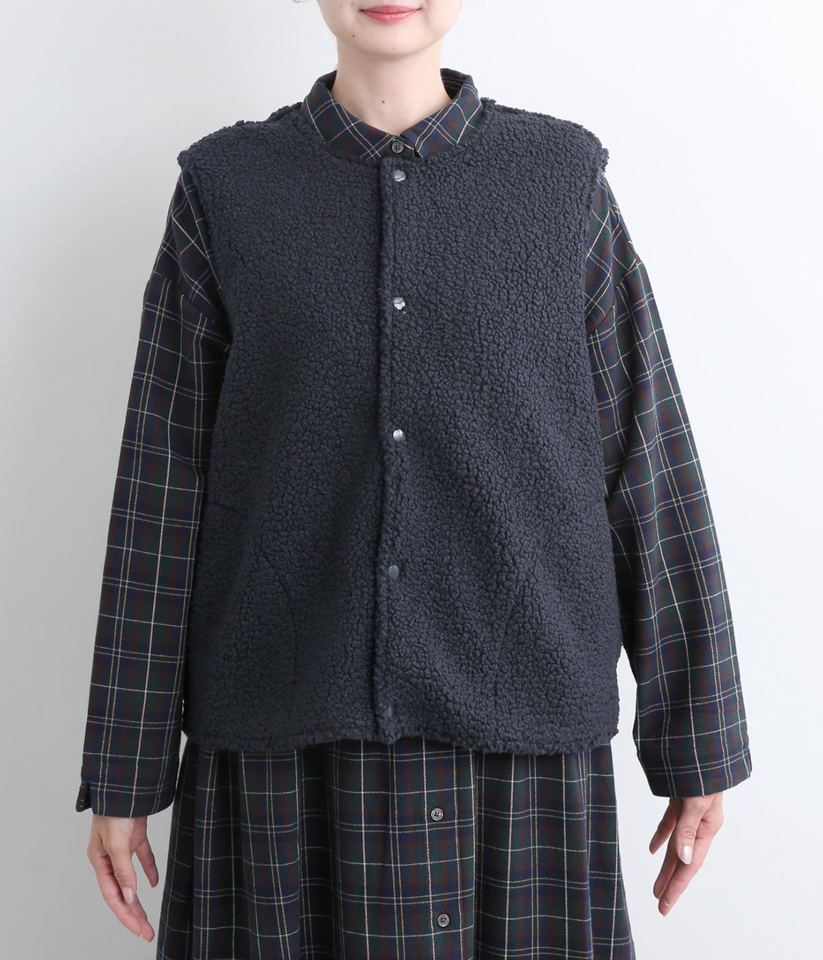 見た目にもあたたかみを感じるボアベスト。前ボタンの色味をベースカラーと統一して、シンプルに大人っぽく仕上げました。後ろ裾に配したリブがアクセントに。ボリュームが出すぎないのでアウターの中に着やすく防寒対策としても活躍します。