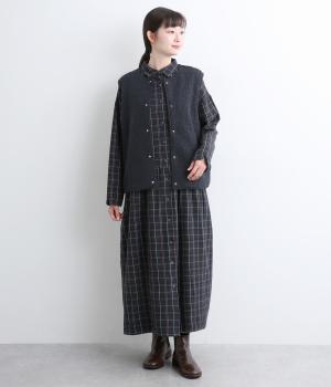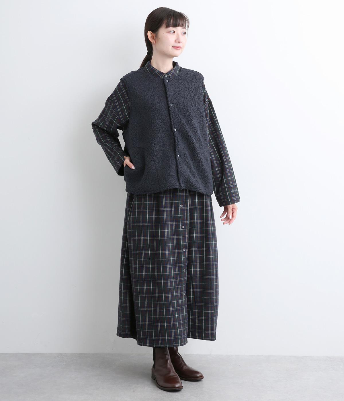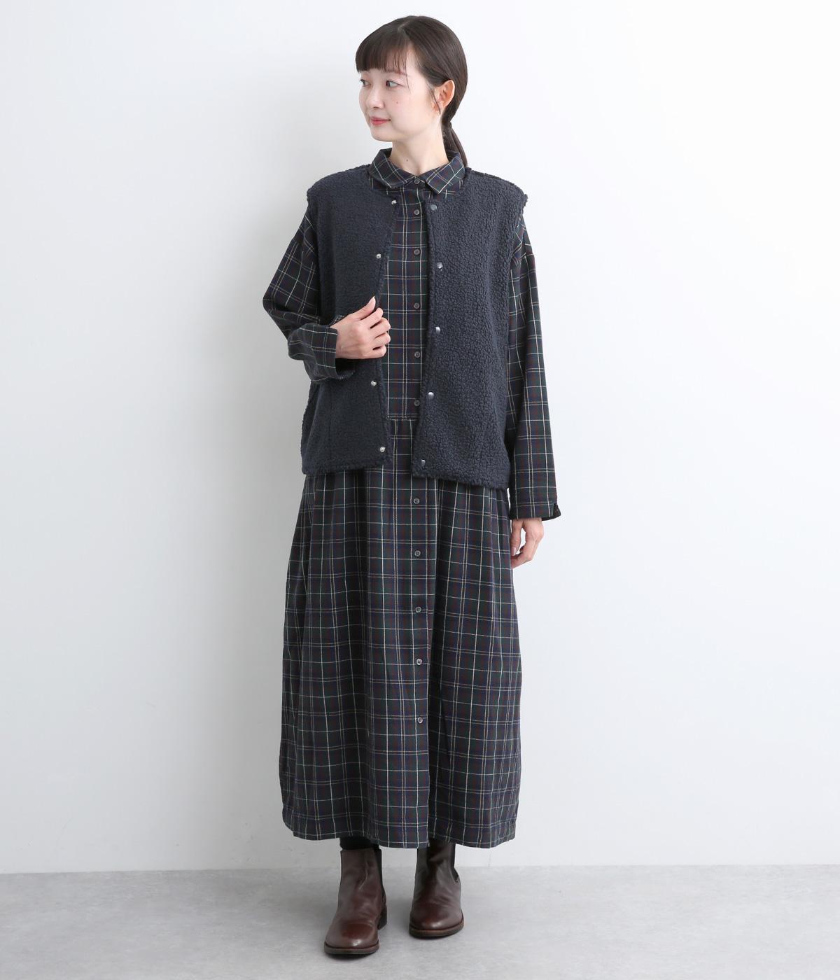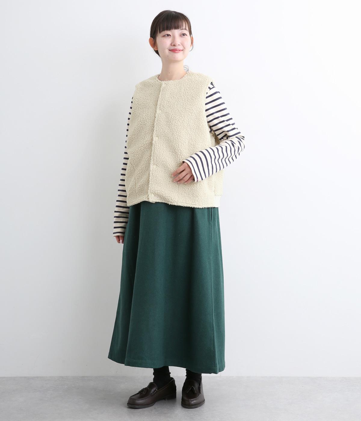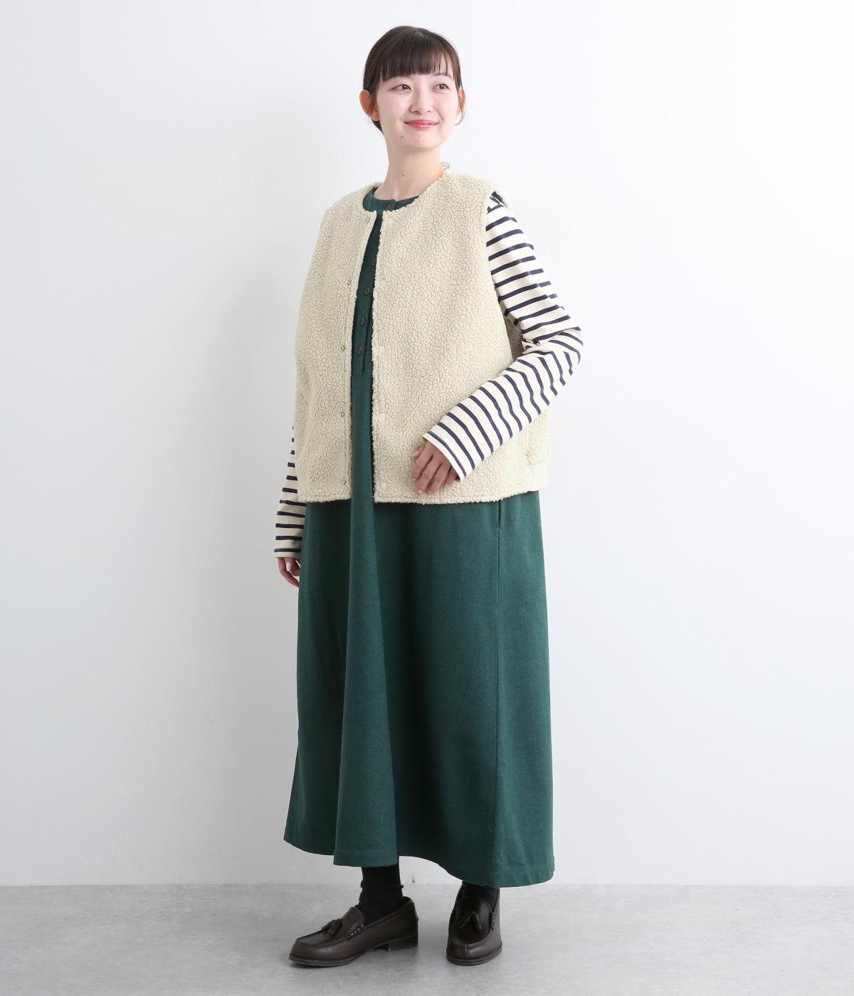 見た目にもあたたかみを感じるボアベスト。前ボタンの色味をベースカラーと統一して、シンプルに大人っぽく仕上げました。後ろ裾に配したリブがアクセントに。ボリュームが出すぎないのでアウターの中に着やすく防寒対策としても活躍します。