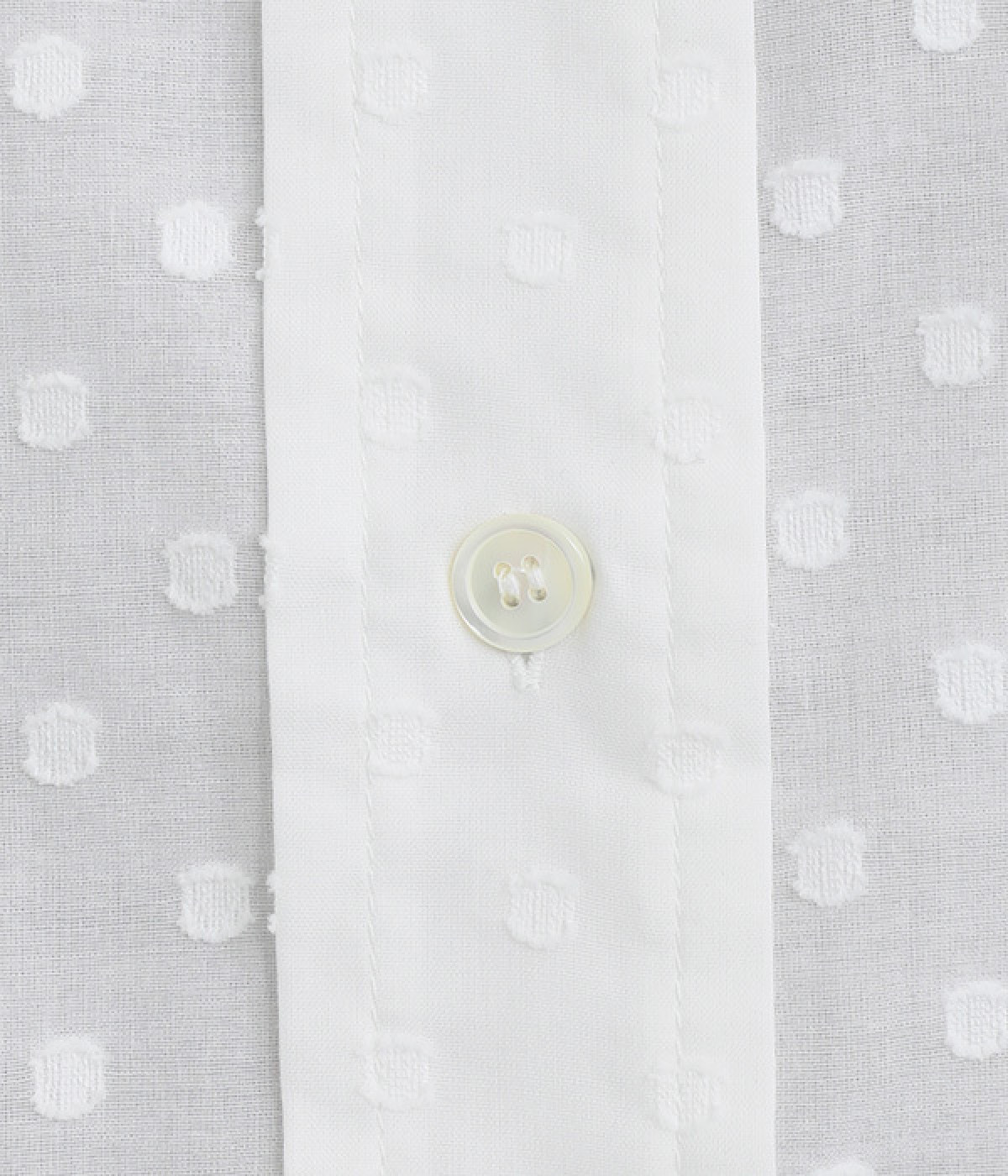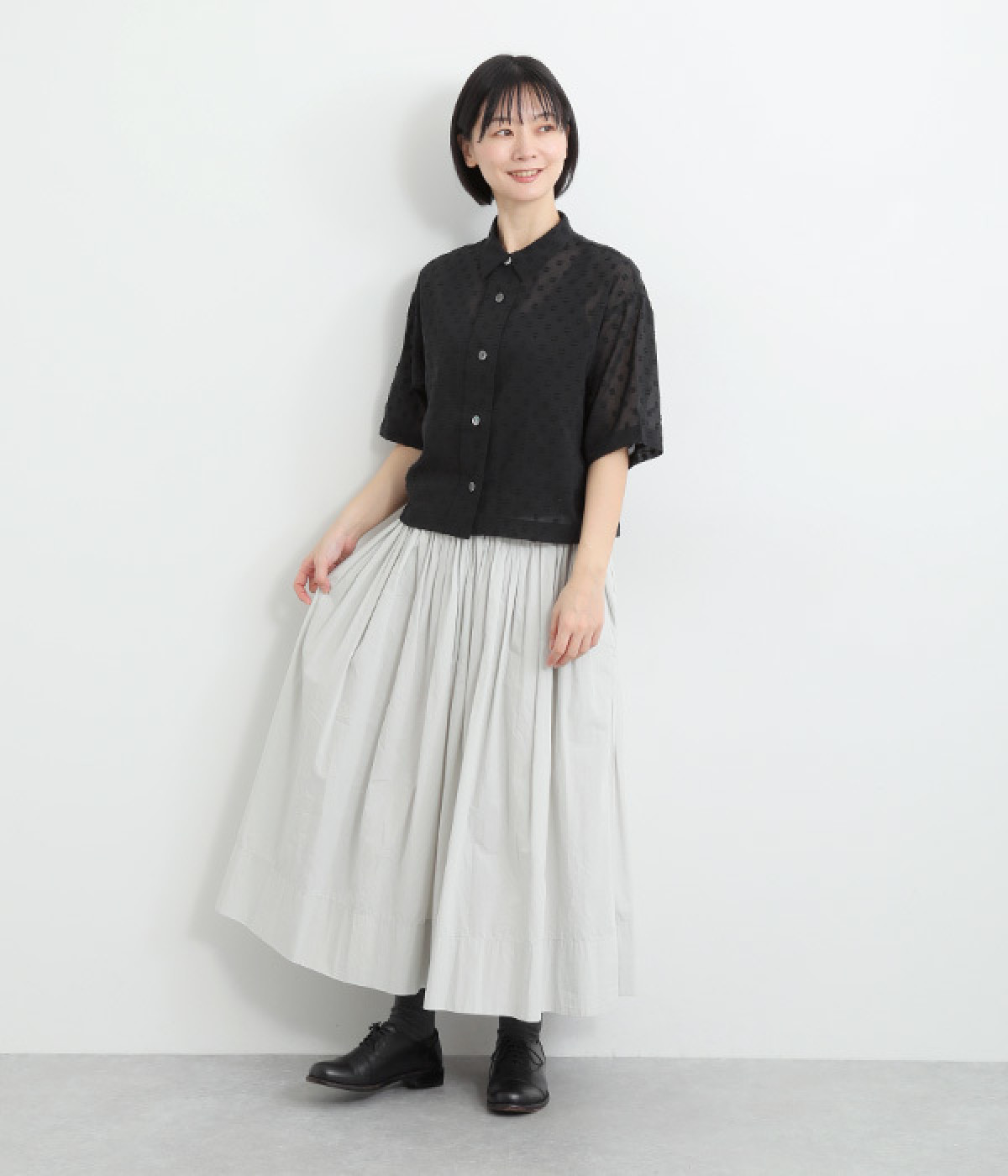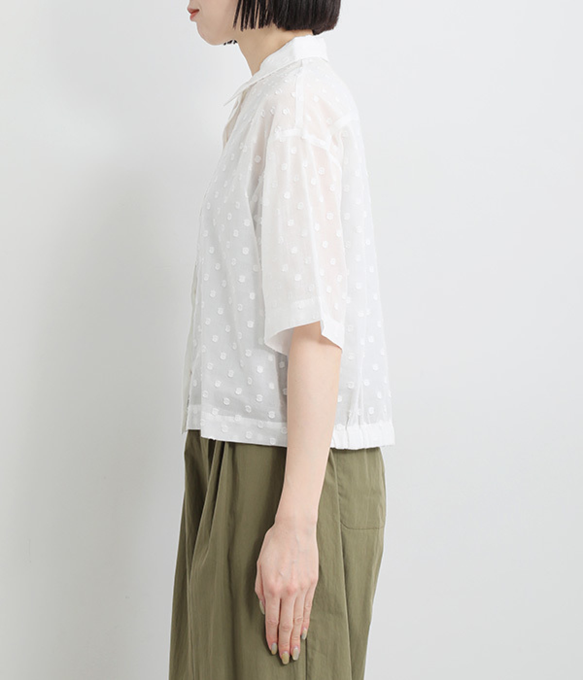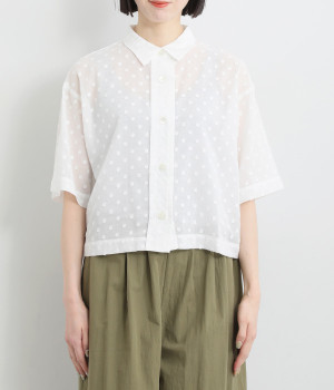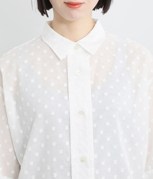 シアー感があり、やさしい膨らみとやわらかさを持つコットン素材を使用。ドビー織りで表現したドット柄が甘くなりすぎず大人な印象に。