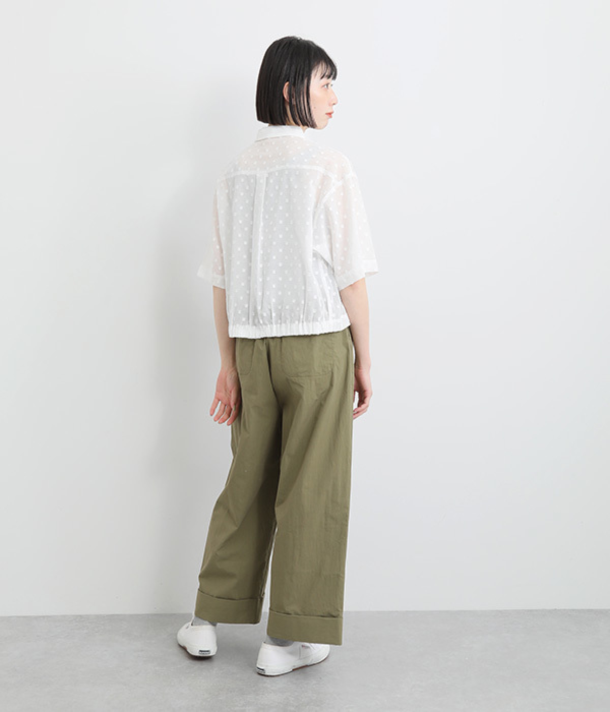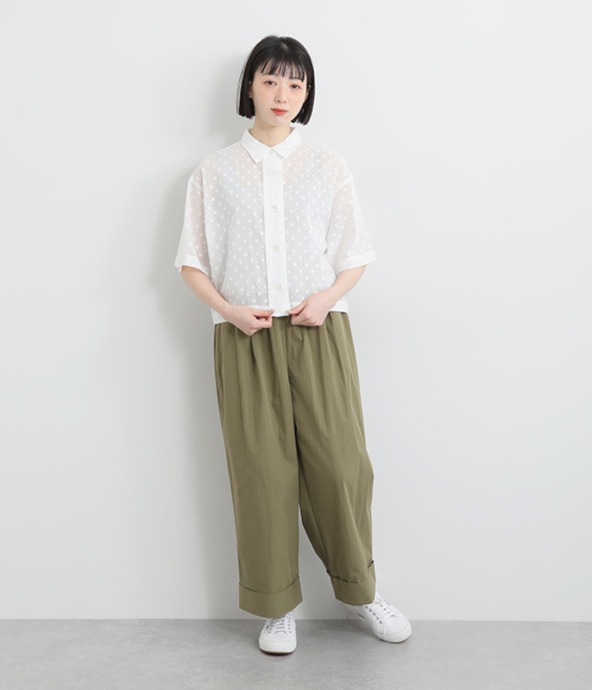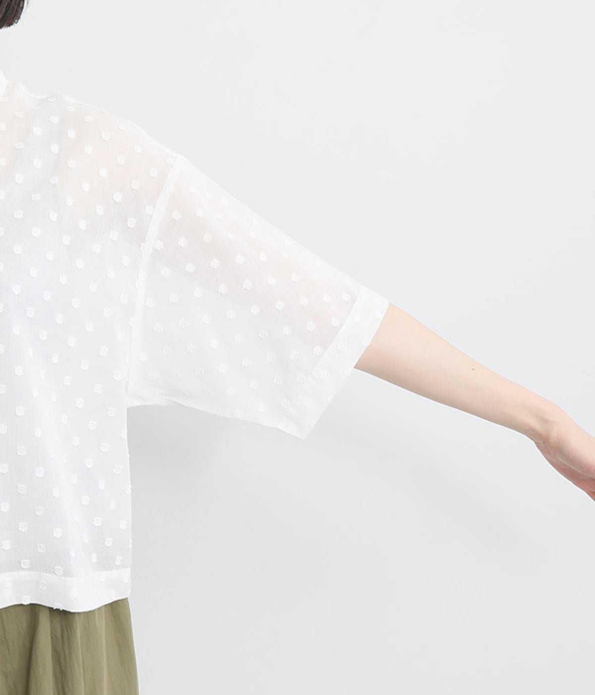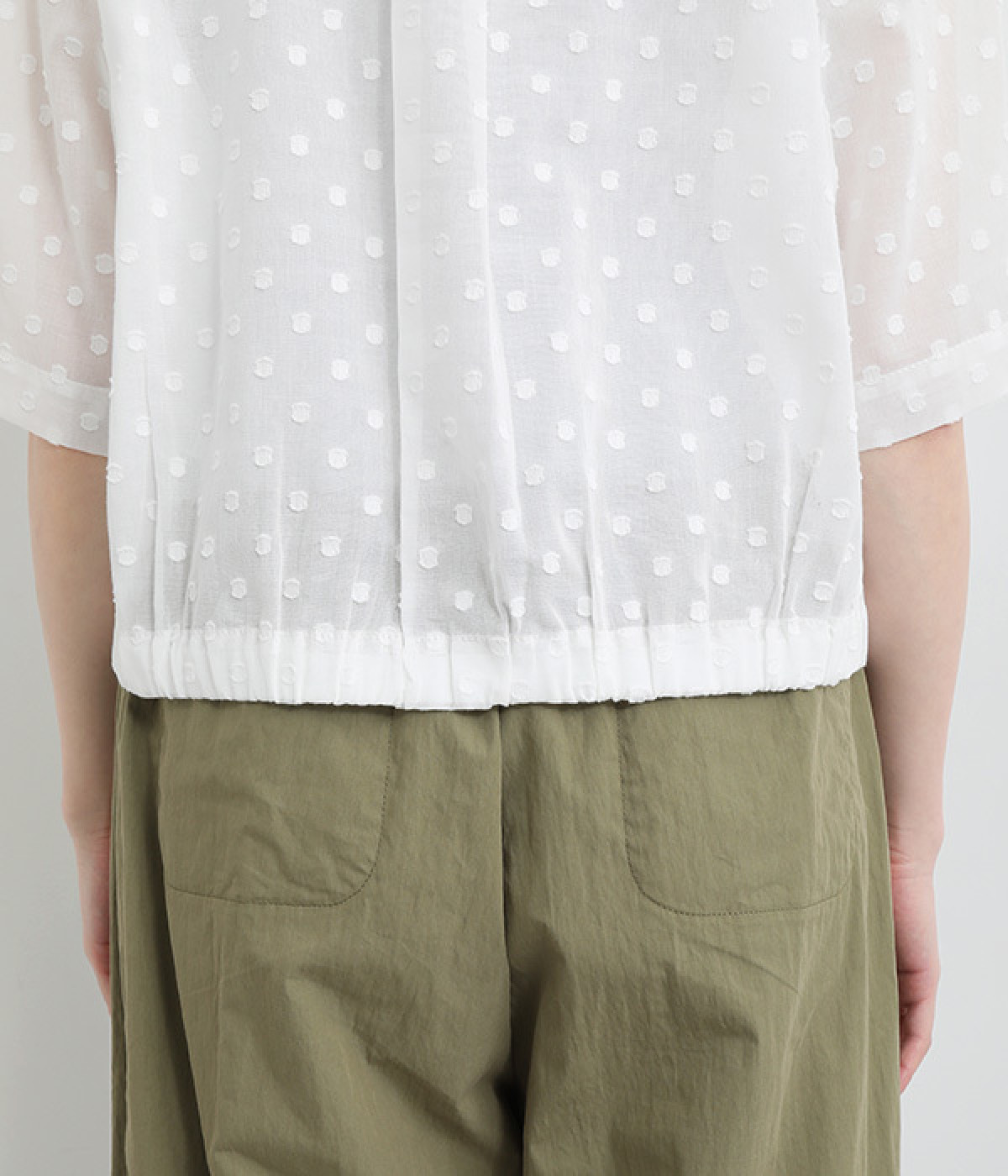 シアー感があり、やさしい膨らみとやわらかさを持つコットン素材を使用。ドビー織りで表現したドット柄が甘くなりすぎず大人な印象に。