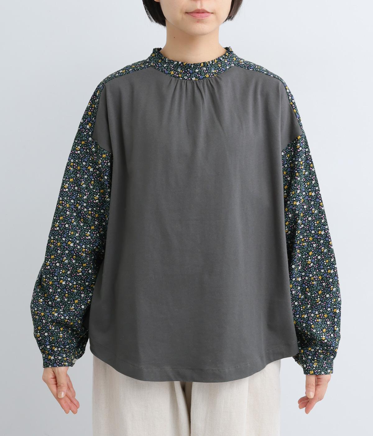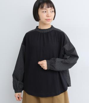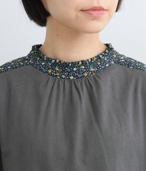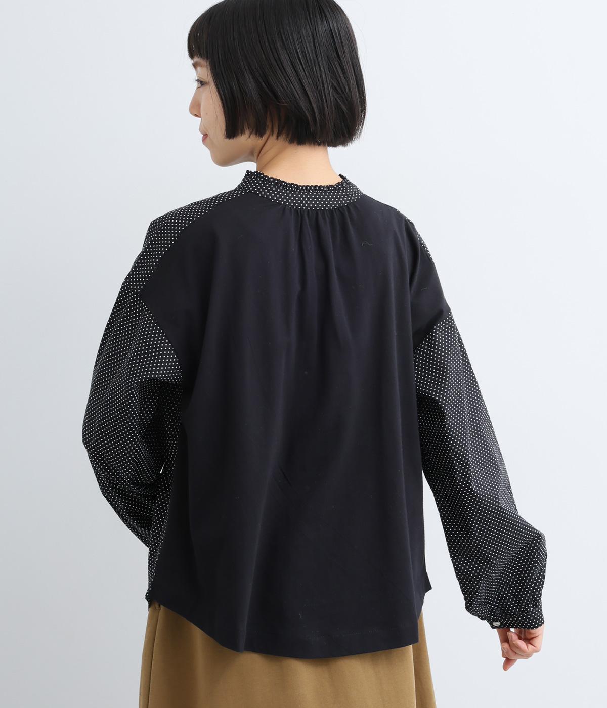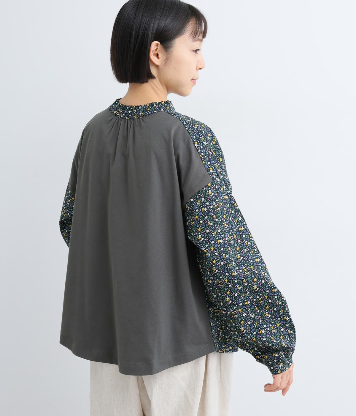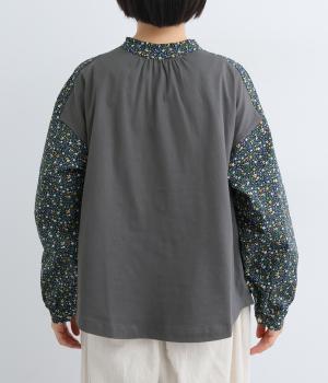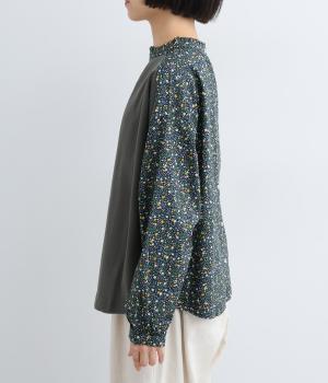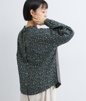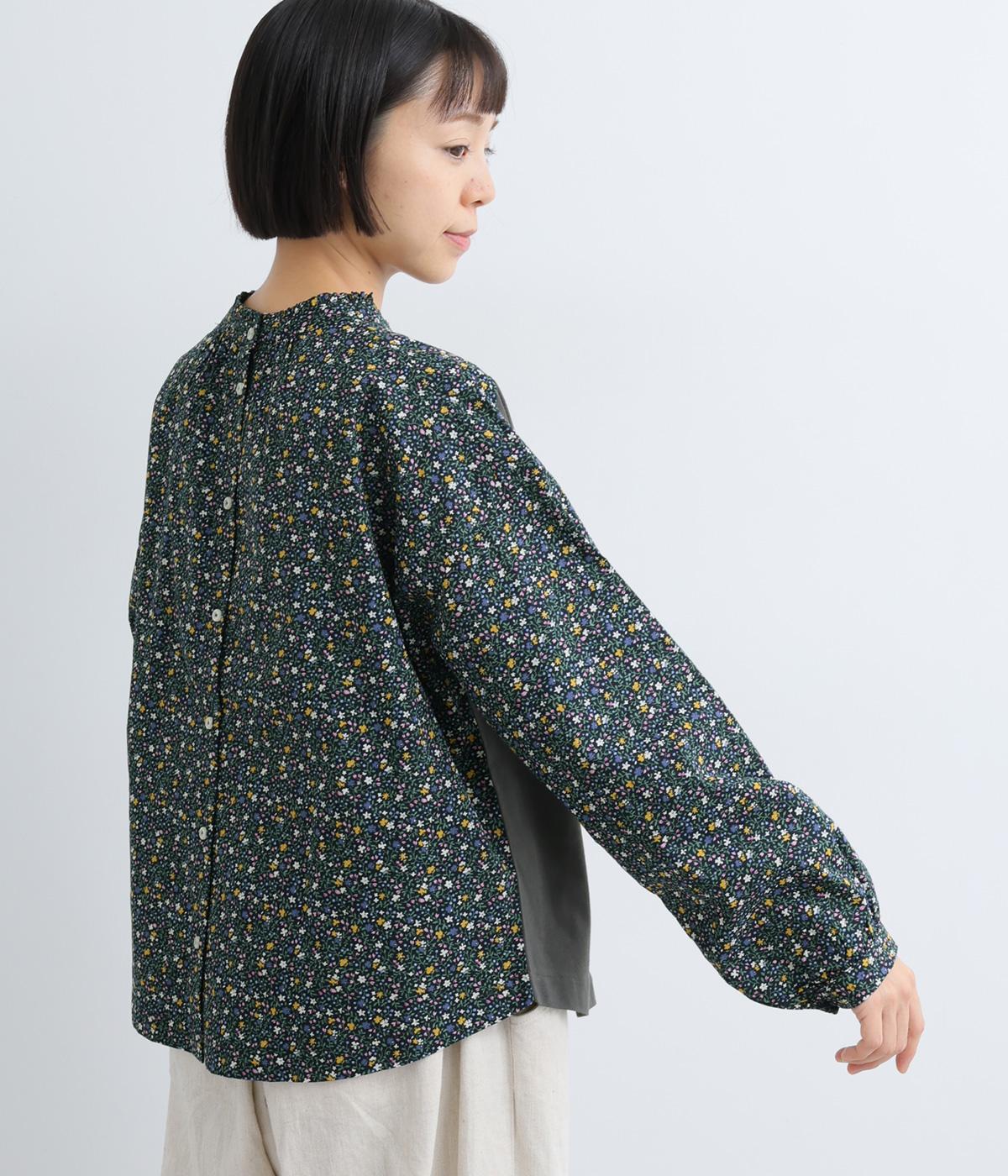 カットソーと布帛生地をドッキングさせた技ありデザインのブラウス。前後どちらを前にしてもたのしめる2way仕様です。布帛には細かな柄をプリントして華やかさをアップ。小さなフリルのスタンド襟が愛らしく、ニットなどのインナーとしてもサマ見えします。