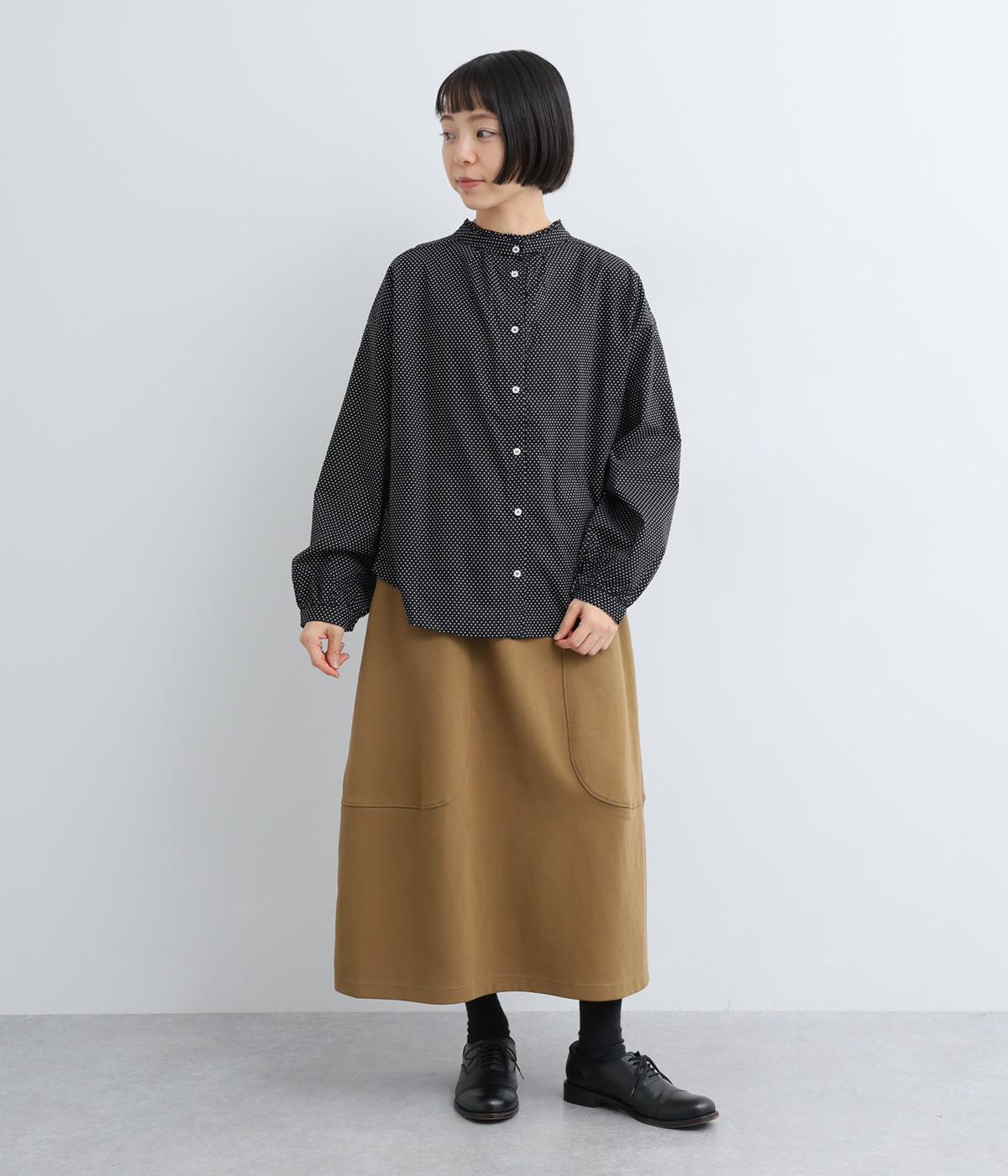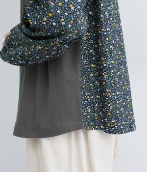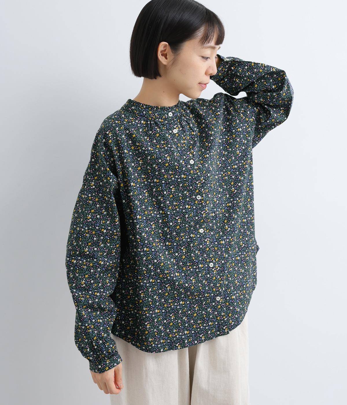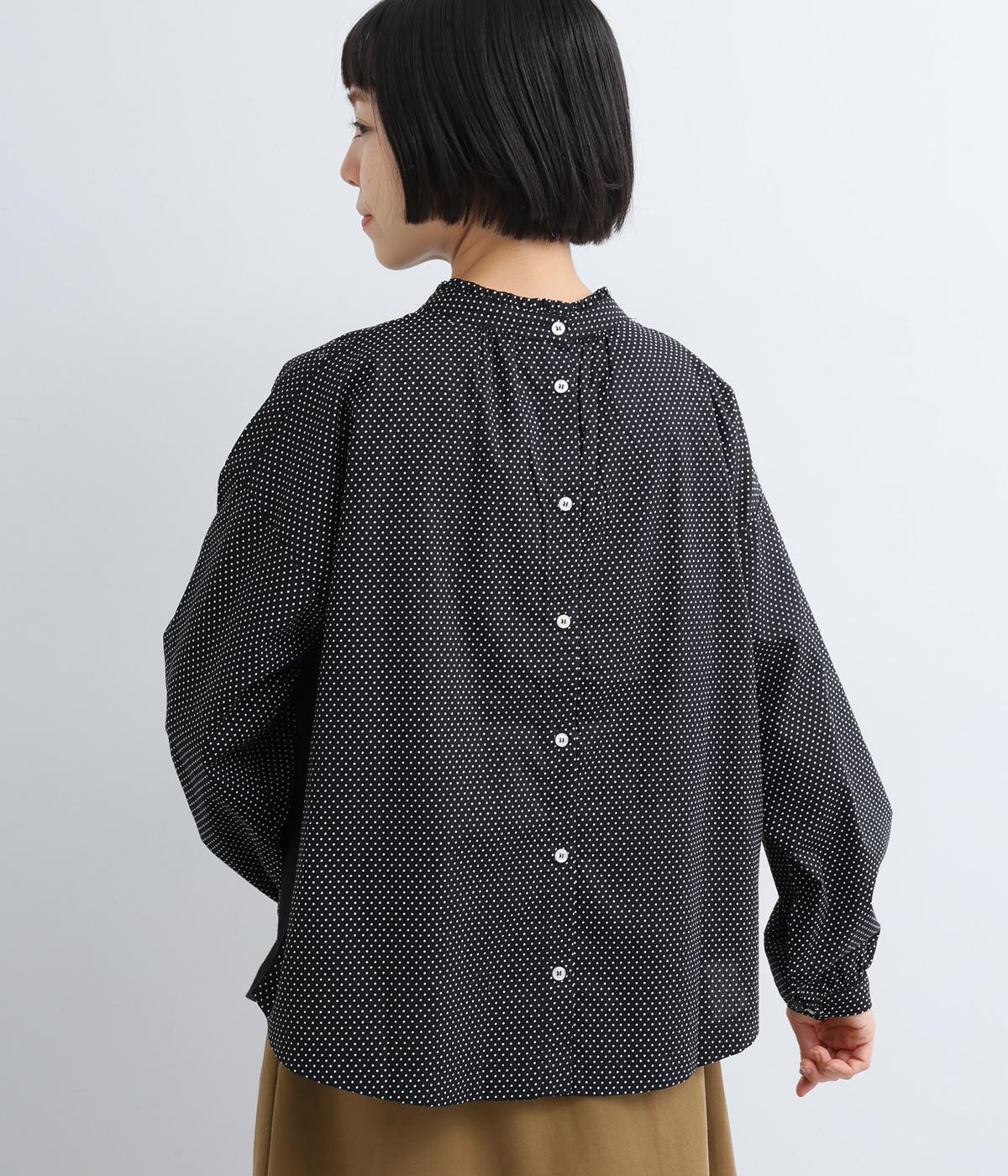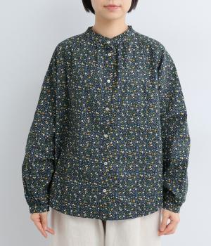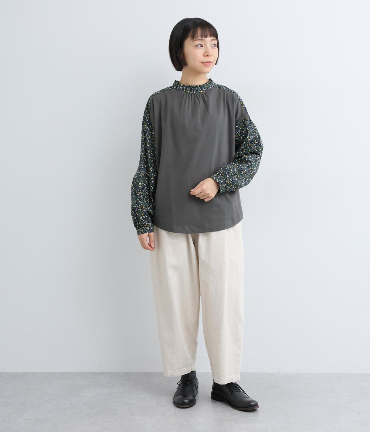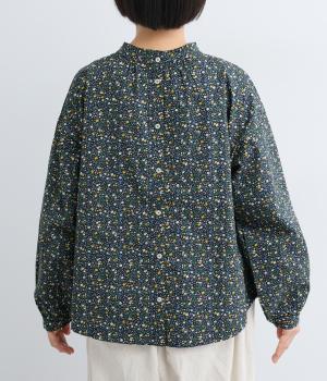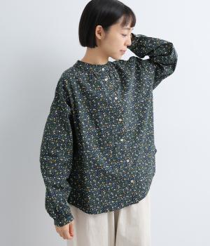 カットソーと布帛生地をドッキングさせた技ありデザインのブラウス。前後どちらを前にしてもたのしめる2way仕様です。布帛には細かな柄をプリントして華やかさをアップ。小さなフリルのスタンド襟が愛らしく、ニットなどのインナーとしてもサマ見えします。
