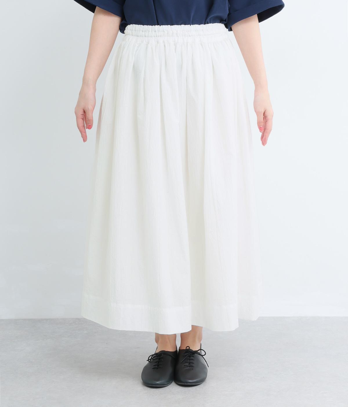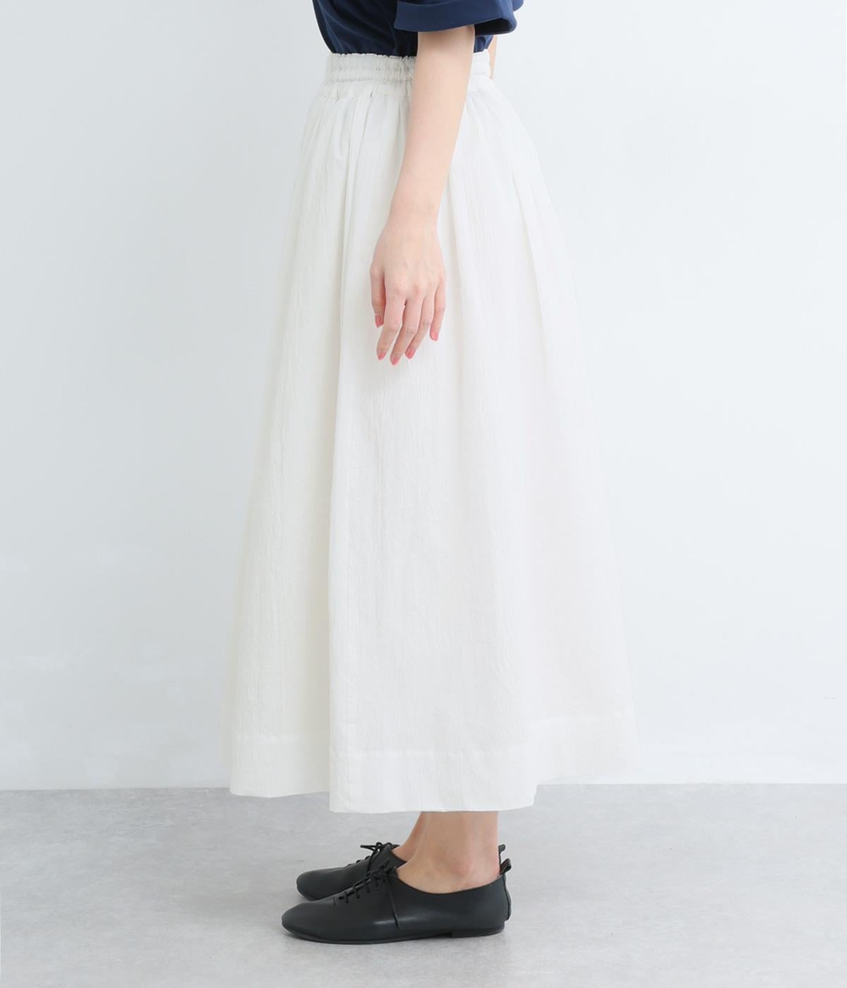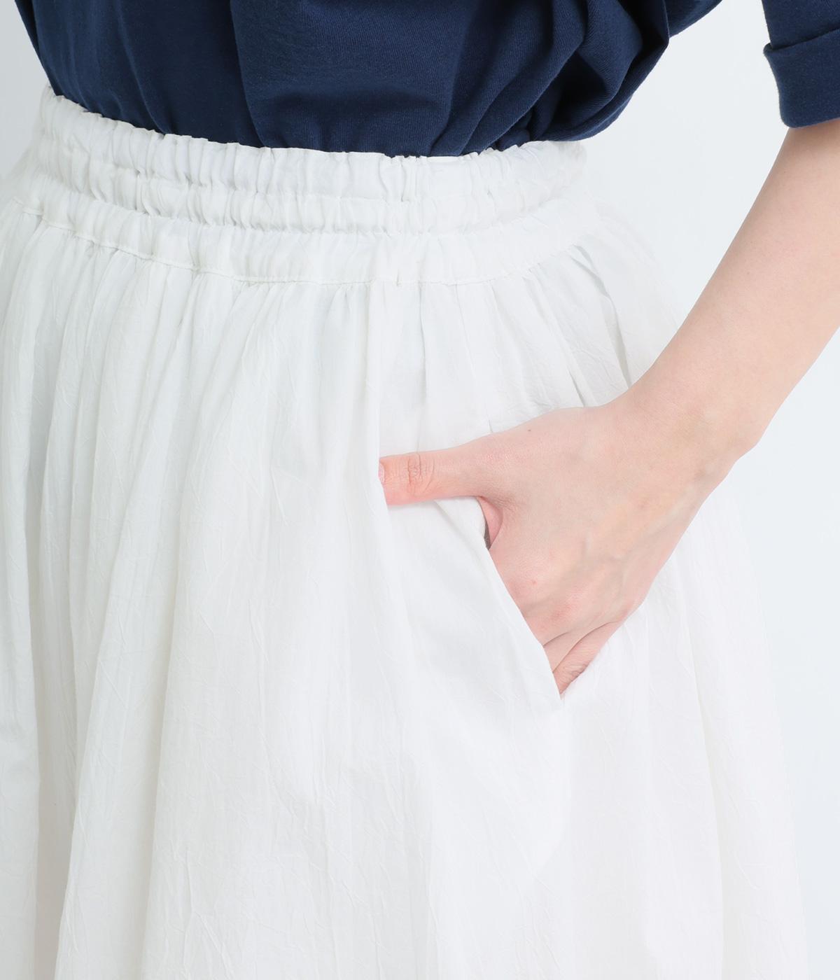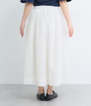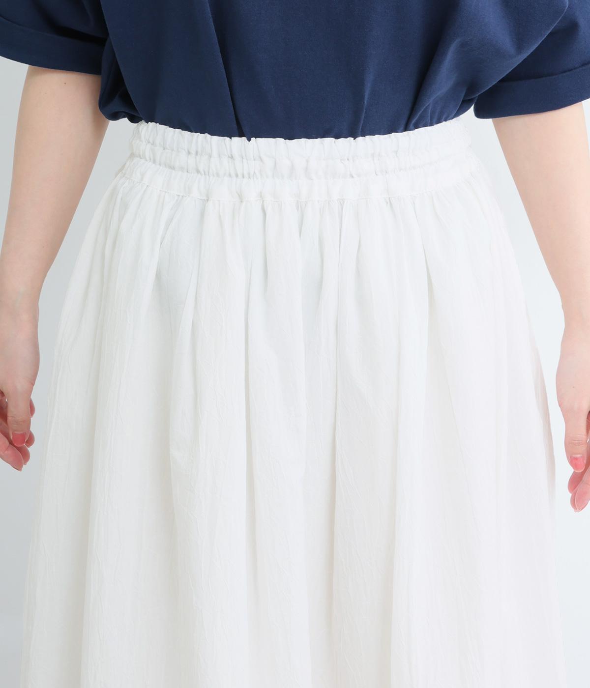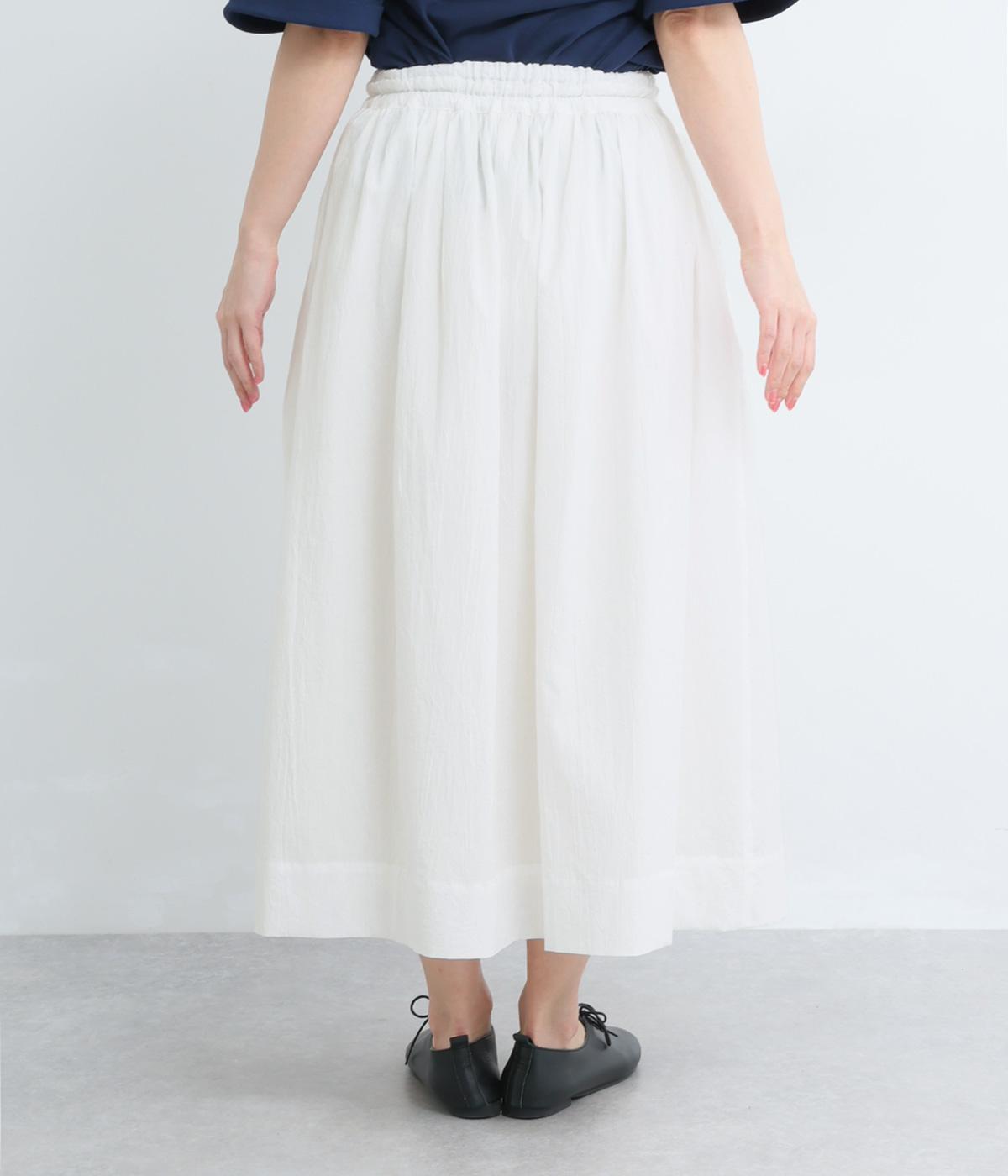素材感を活かしてシンプルに仕立てたギャザースカート。贅沢にたっぷり生地を使い、軽やかながらも着映えするボリューム感を表現。おなかにやさしくフィットする総ゴム&内紐入りで、トップスインのきれいめスタイルもおすすめです。