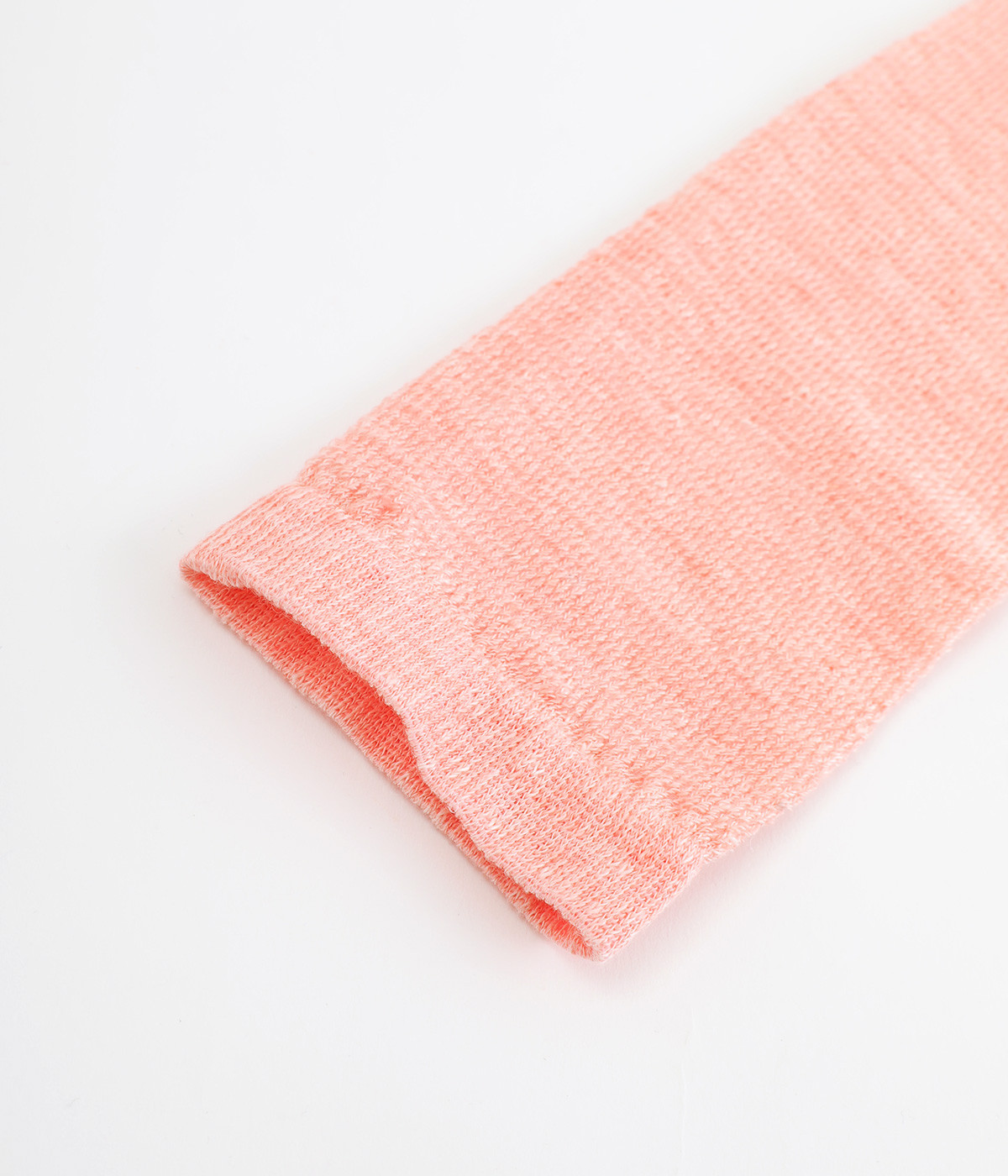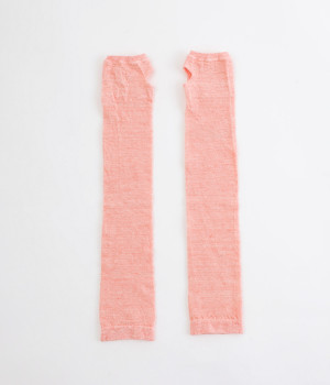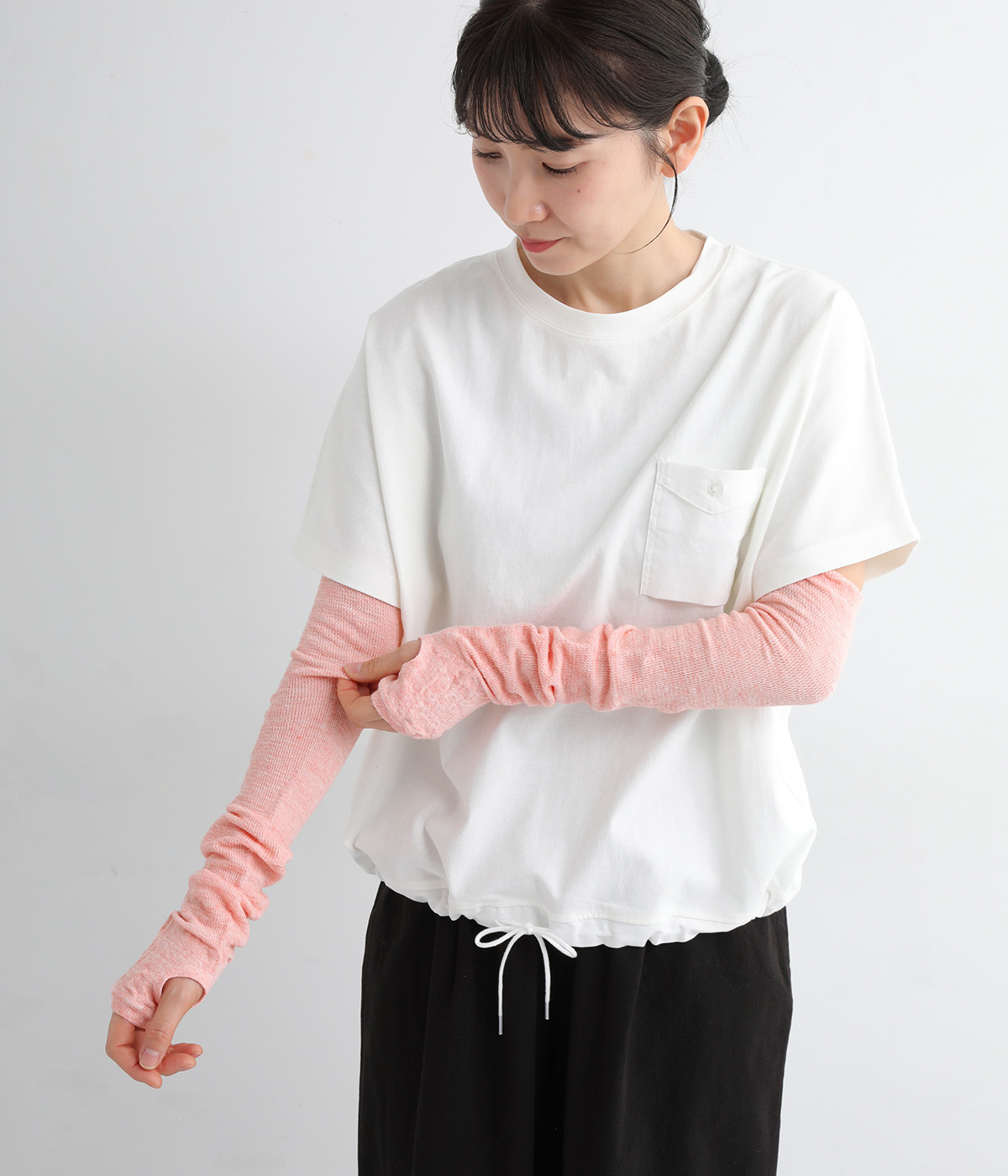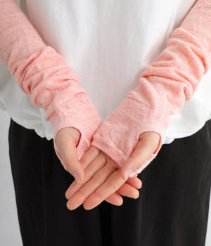 ほんのりと透け感があり、軽やかに装着できます。手の甲の部分は編み柄を変えて、さり気ないこだわりを加えました。フィンガーホールつきでつけ心地◎。絶妙な色合いにこだわった吉野桜は2025のシーズンカラーです。