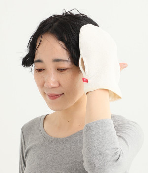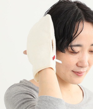 お風呂あがりにドライヤーで髪を乾かす際に使うシルクとコットンのグローブです。シルクもコットンも天然素材のため静電気が起きにくくヘアケアアイテムにぴったり。タオル面で水気を吸水しシルク綿で髪を優しく撫でながらドライヤーをかけて乾かします。シルクが髪の広がりを抑え、しっとりとまとまりのある髪へ導きます。親指部分は左右に穴があいているため、左右どちらの手でもお使いいただけます。