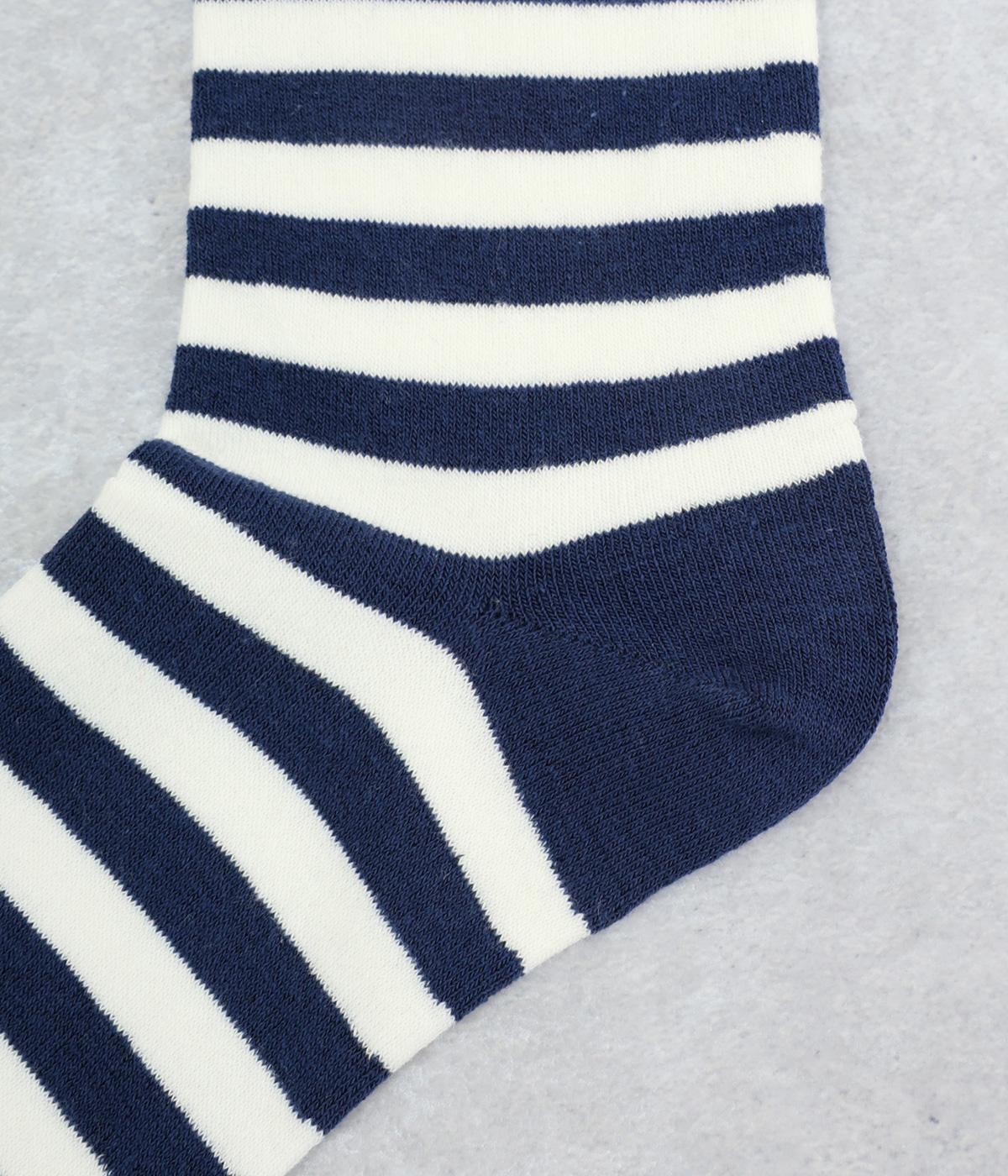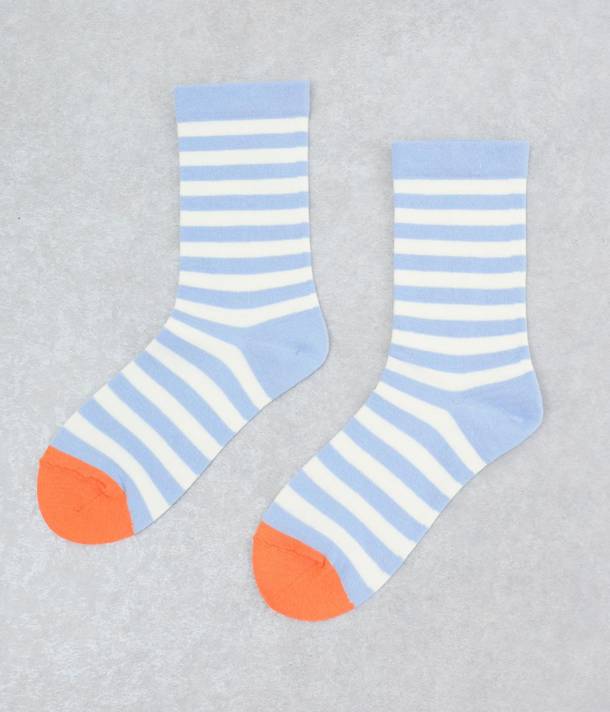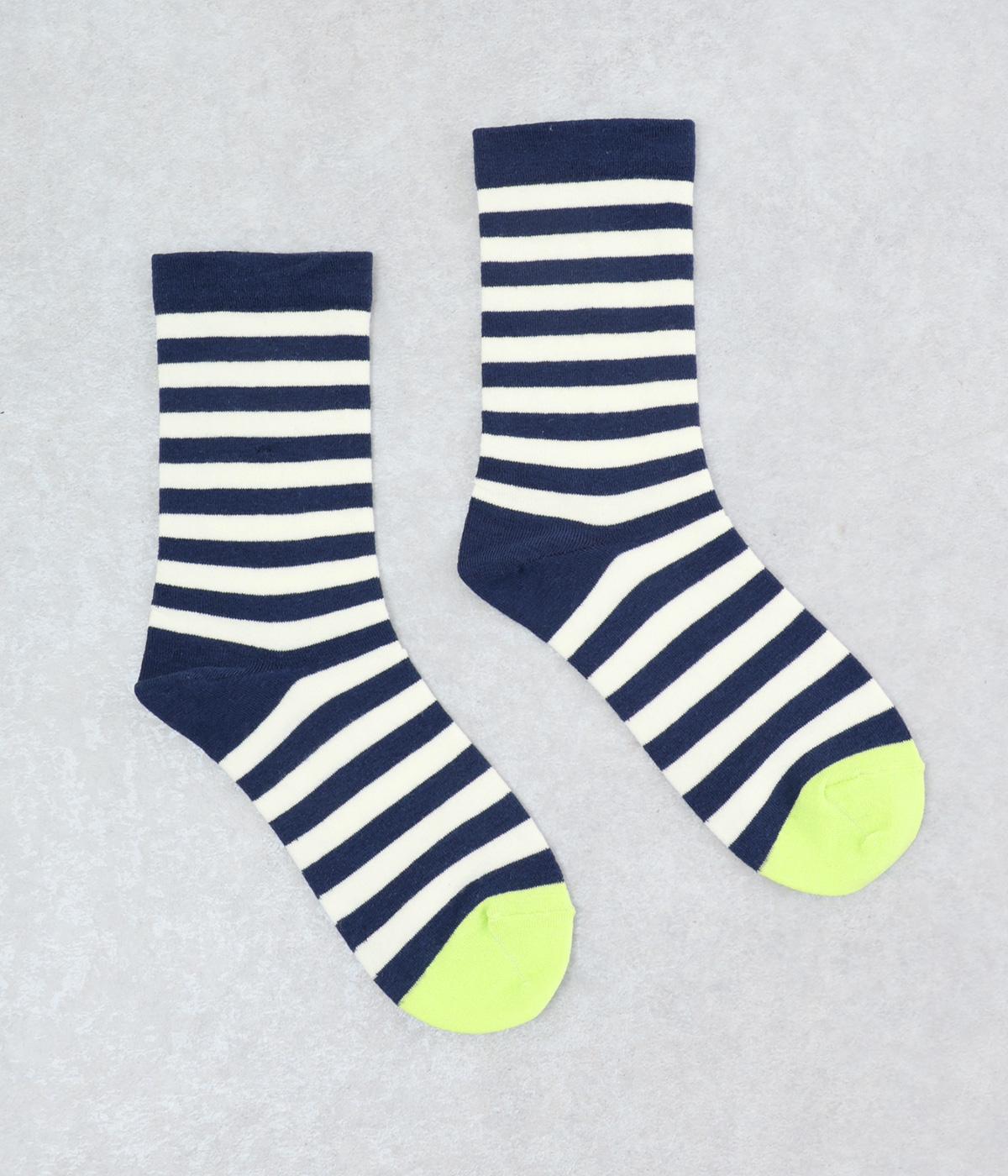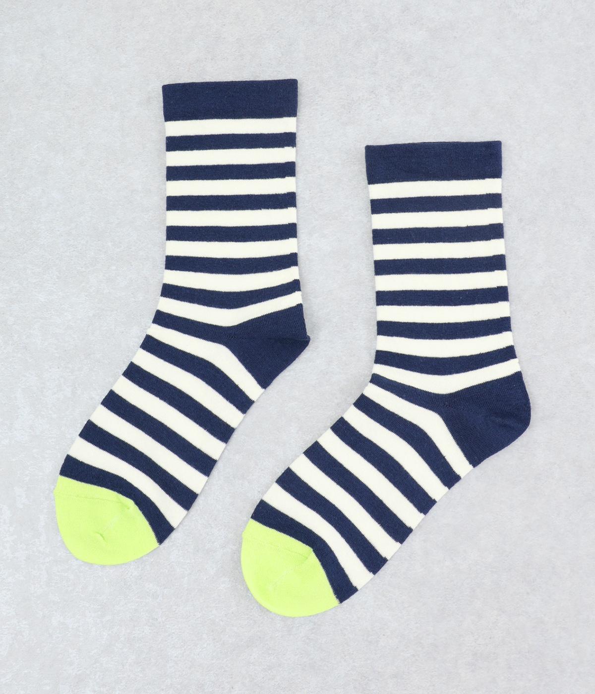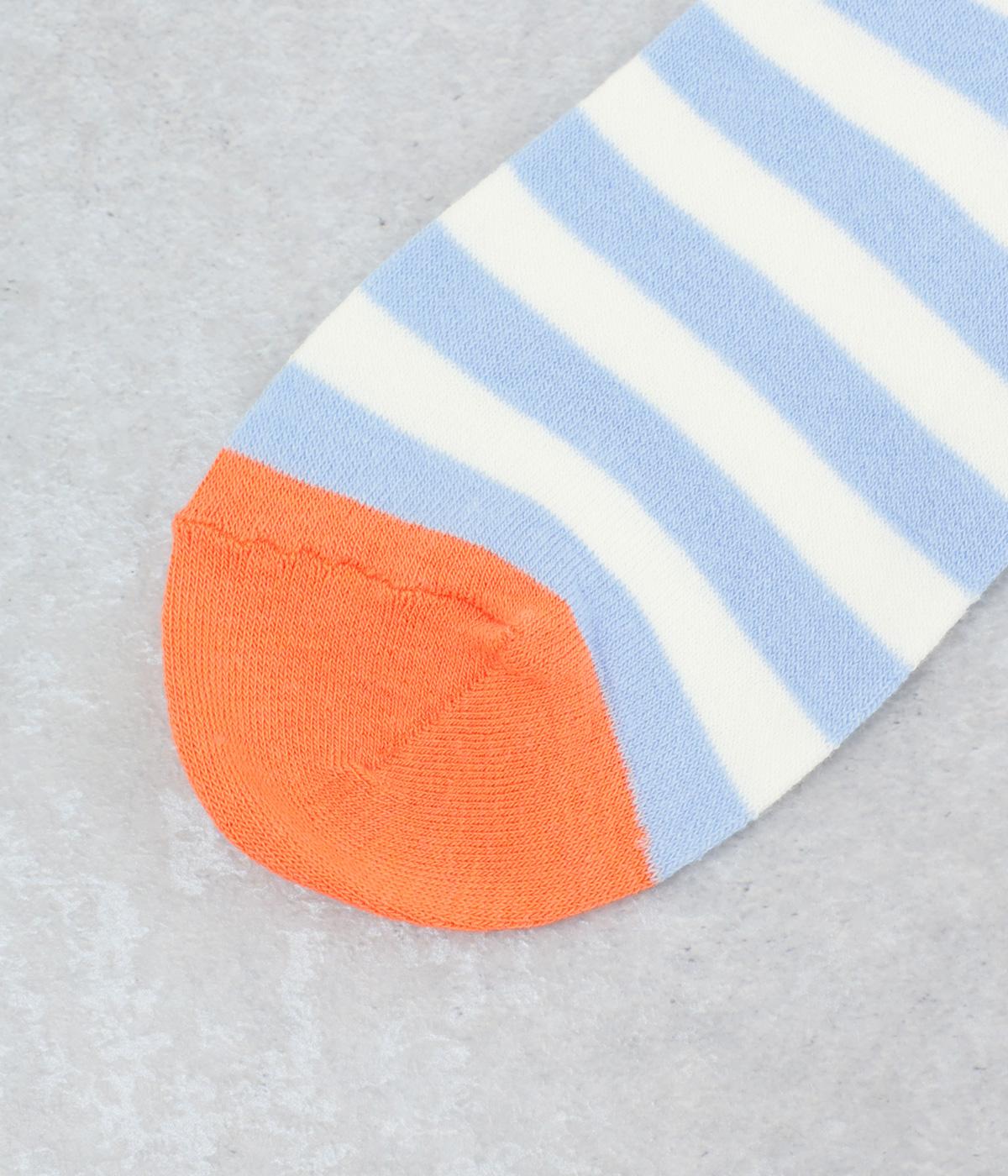 ボーダー柄とつま先の配色の組み合わせが印象的なデザインです。さりげないコントラストが足元を引き立て、コーディネートのアクセントに。はき口はゴムを入れず、締めつけを感じにくいやわらかなはき心地に仕上げています。