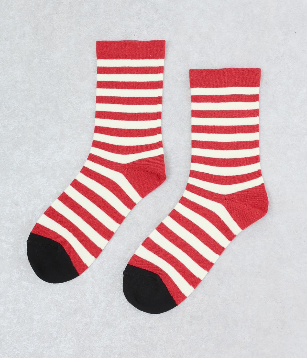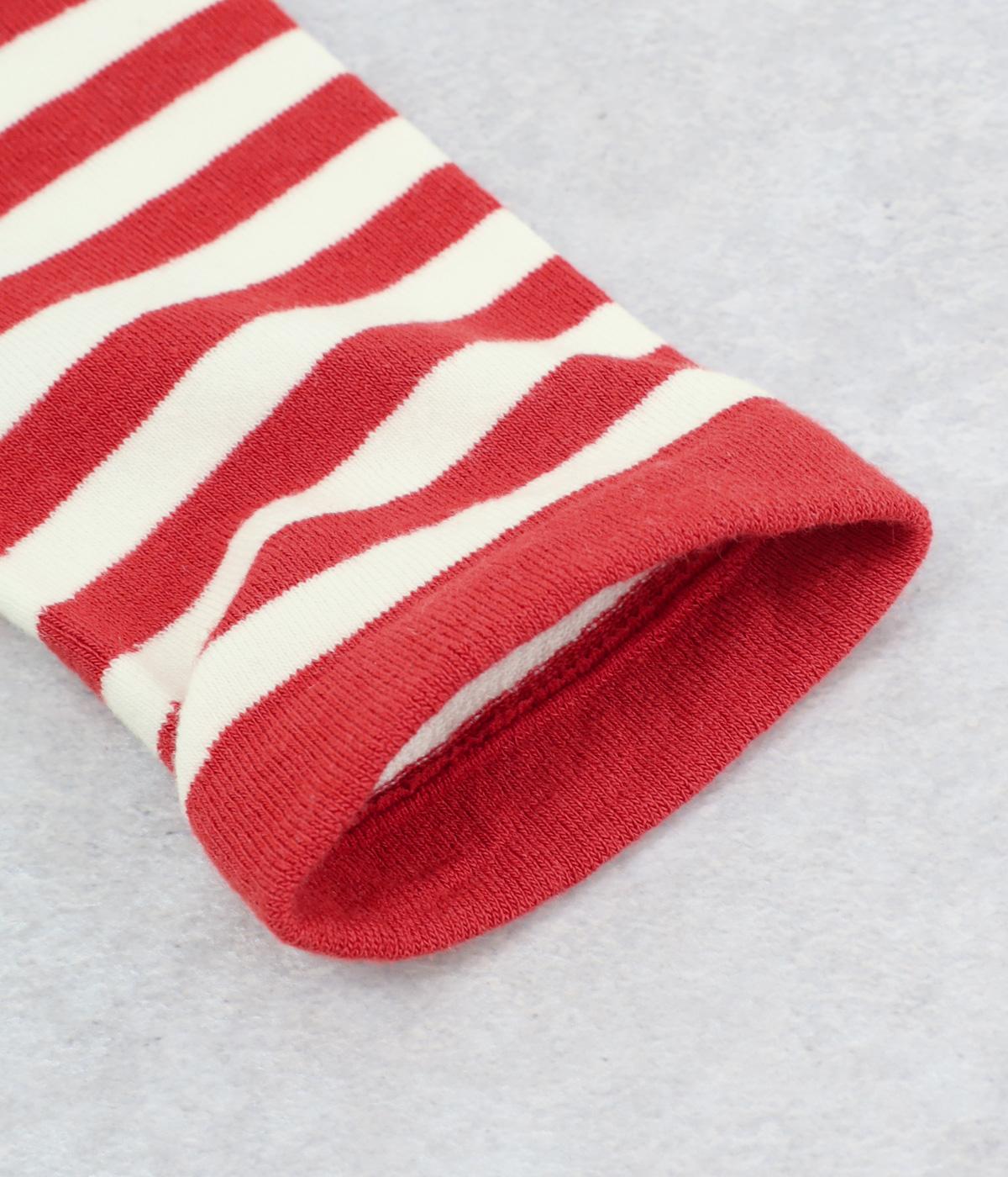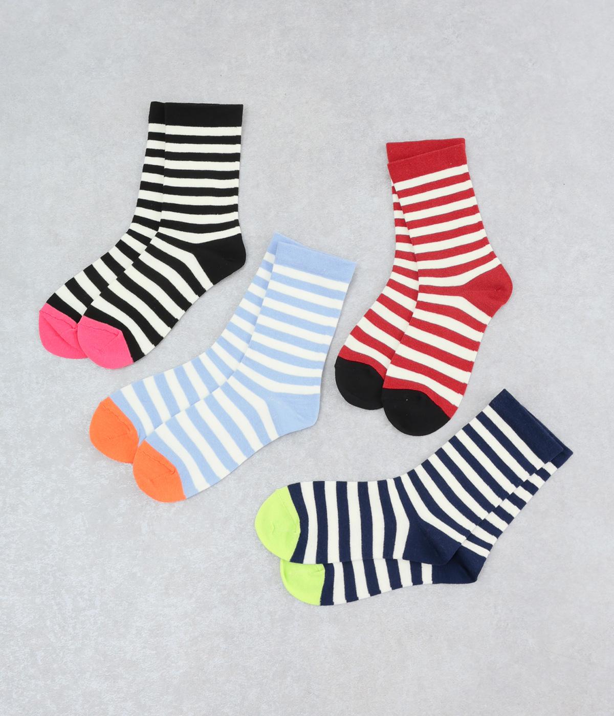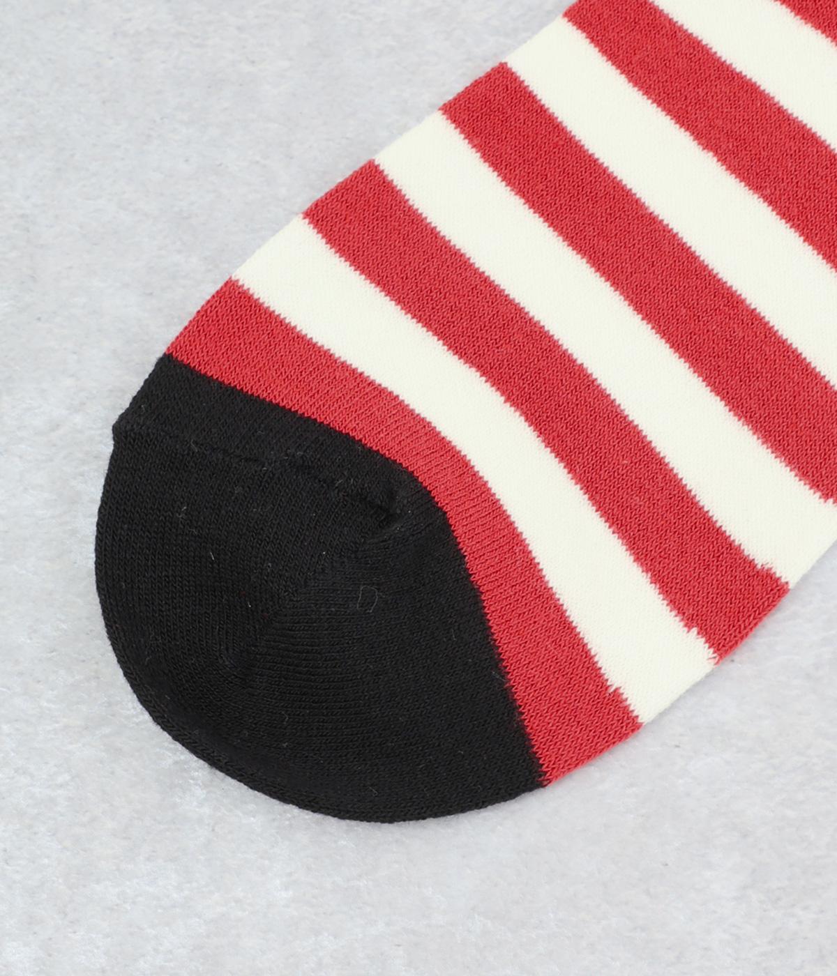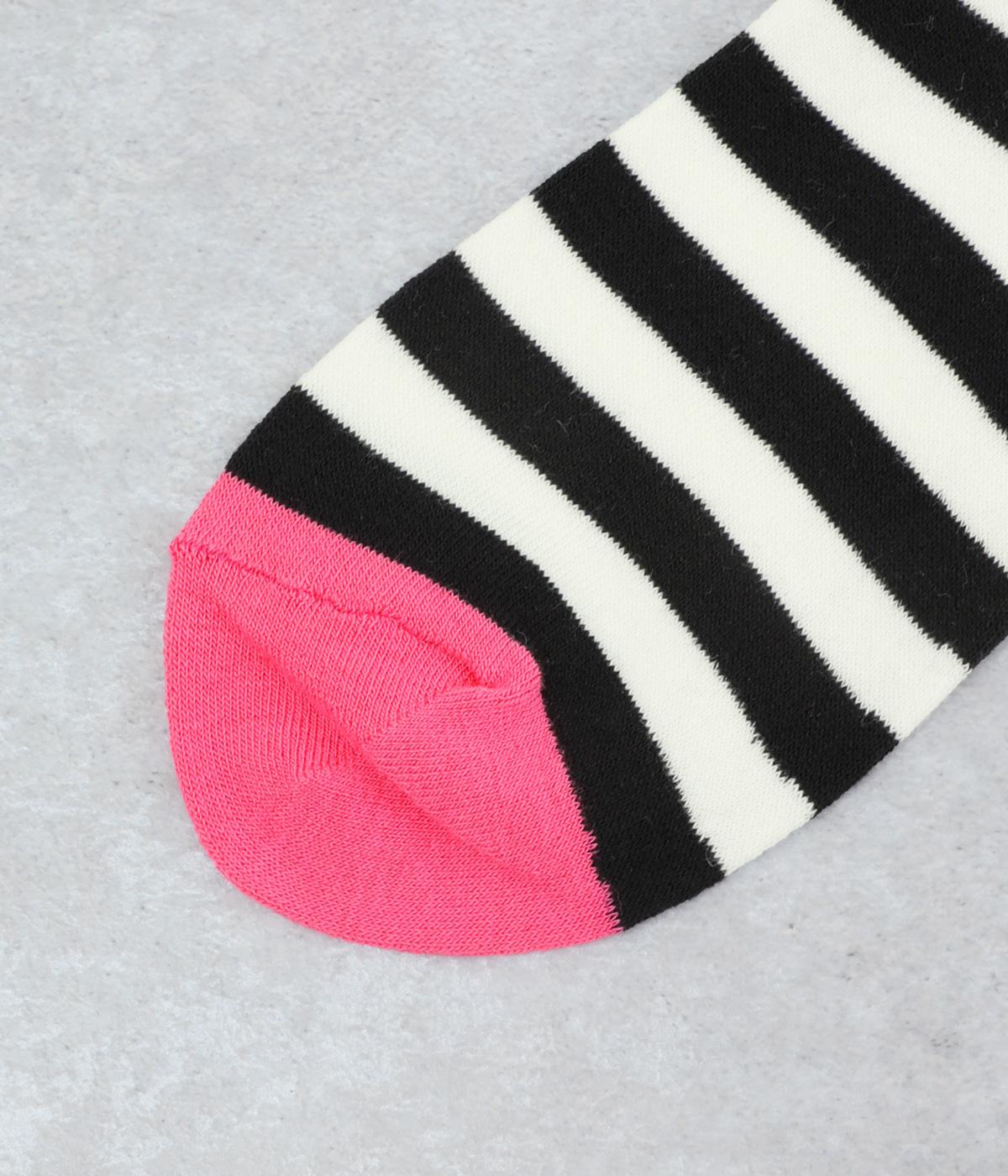 ボーダー柄とつま先の配色の組み合わせが印象的なデザインです。さりげないコントラストが足元を引き立て、コーディネートのアクセントに。はき口はゴムを入れず、締めつけを感じにくいやわらかなはき心地に仕上げています。
