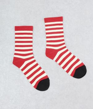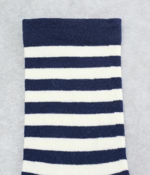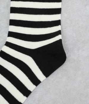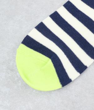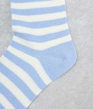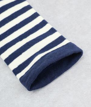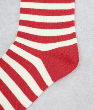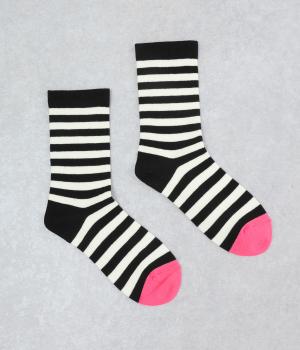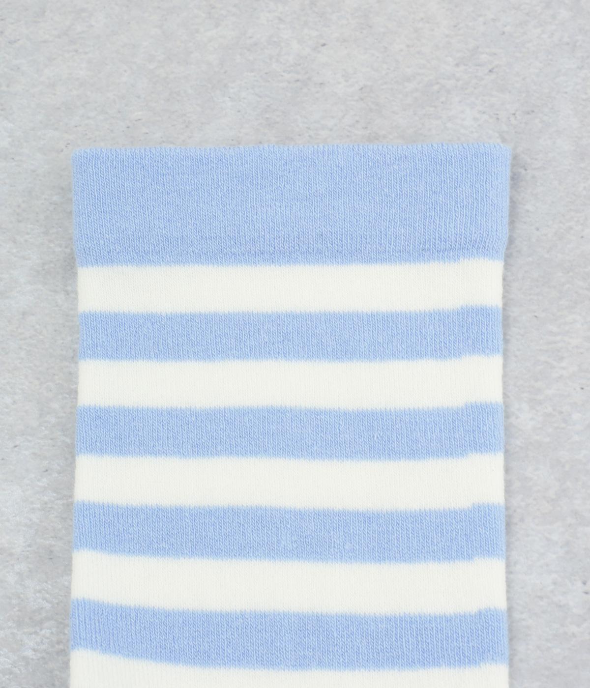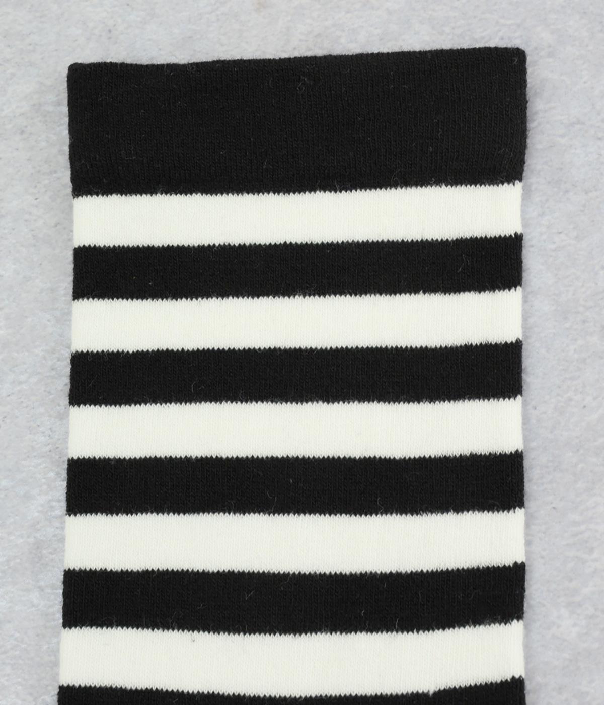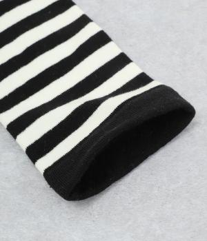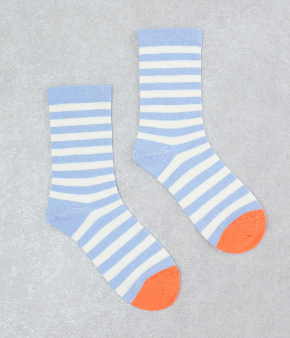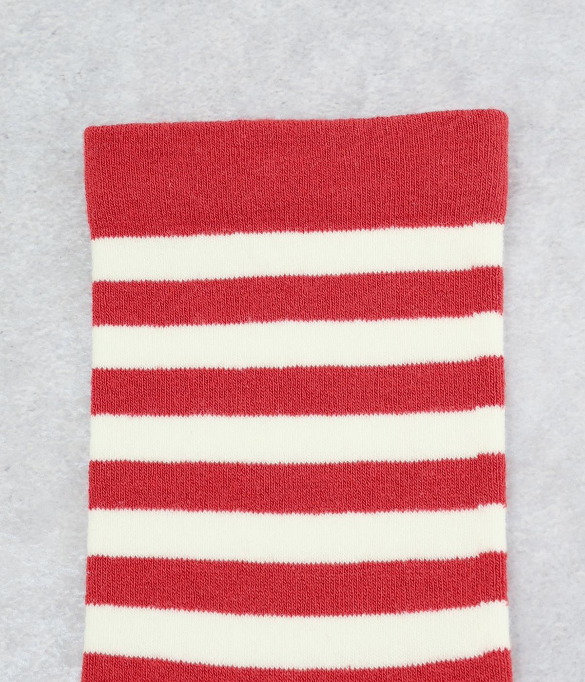 ボーダー柄とつま先の配色の組み合わせが印象的なデザインです。さりげないコントラストが足元を引き立て、コーディネートのアクセントに。はき口はゴムを入れず、締めつけを感じにくいやわらかなはき心地に仕上げています。