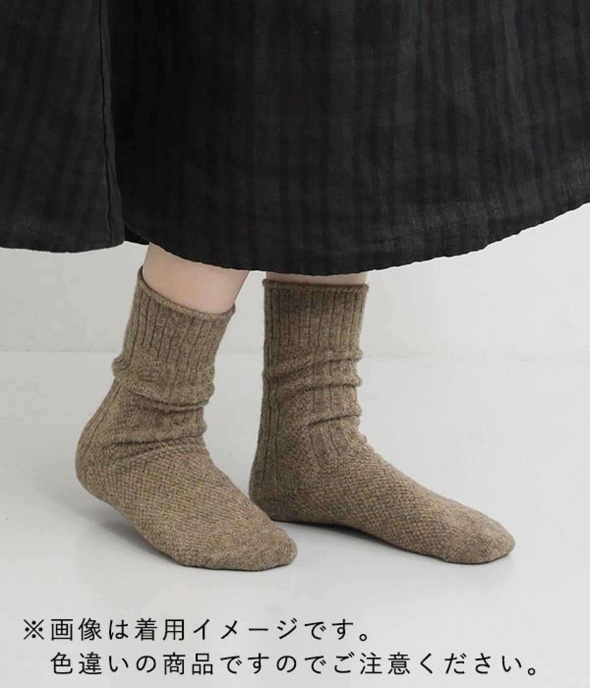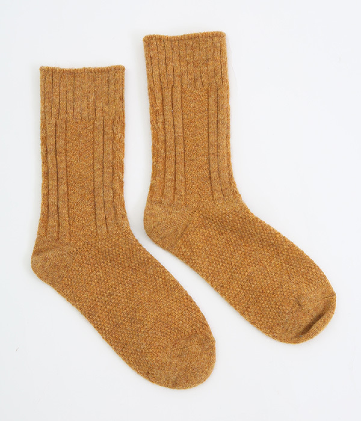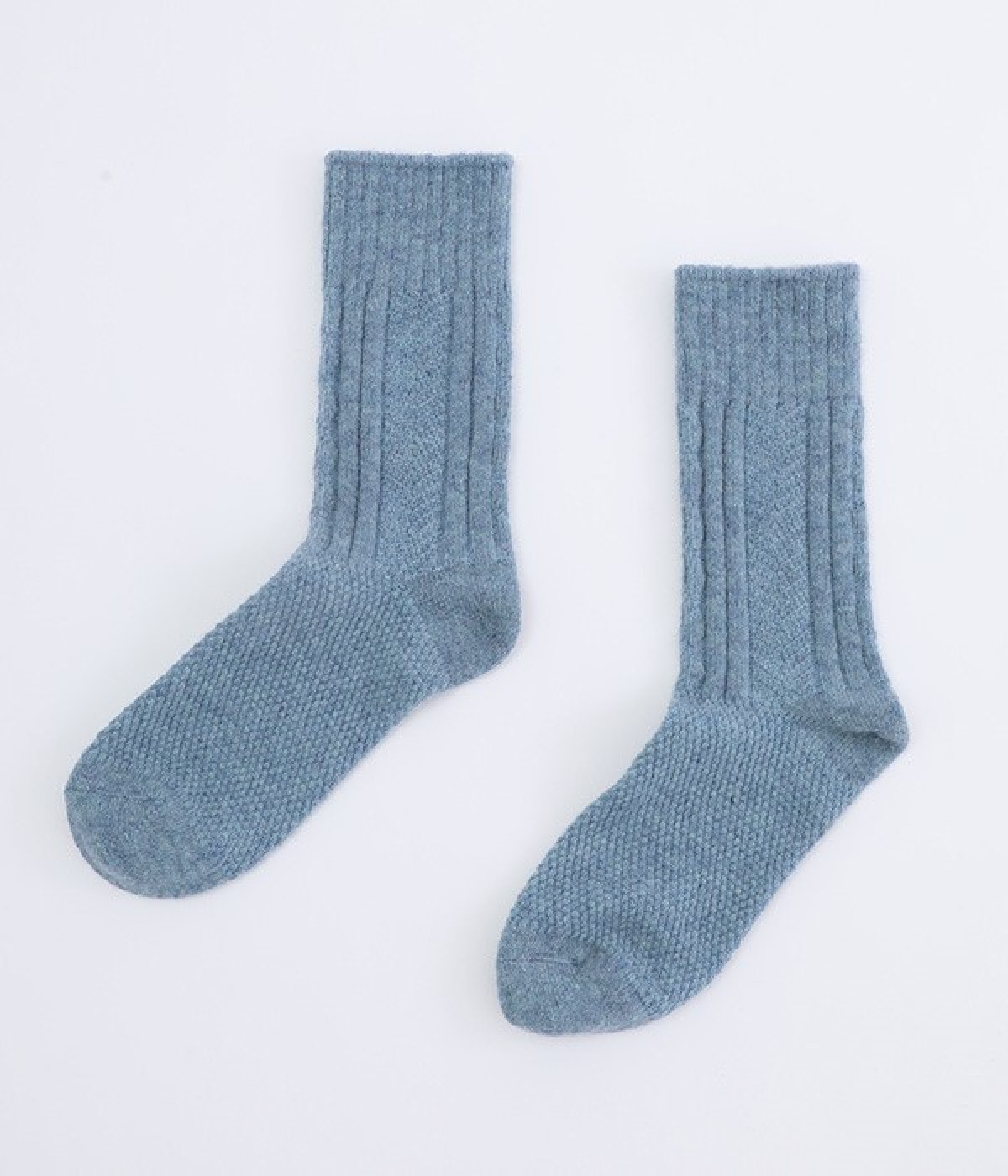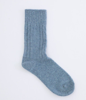 ふんわりと編み立てた、あたたかな風合いと優しい肌触りが特徴的な適度な厚みのあるウール混紡素材のソックスです。すっきりとしたリブ編みとぽこぽことした柄編みを切り替えたデザインが、足元のさりげないアクセントになります。スニーカー合わせはもちろん、ショートブーツやサンダル、サボなどシューズを選ばず幅広い足元コーディネートが楽しめるシンプルさも魅力です。