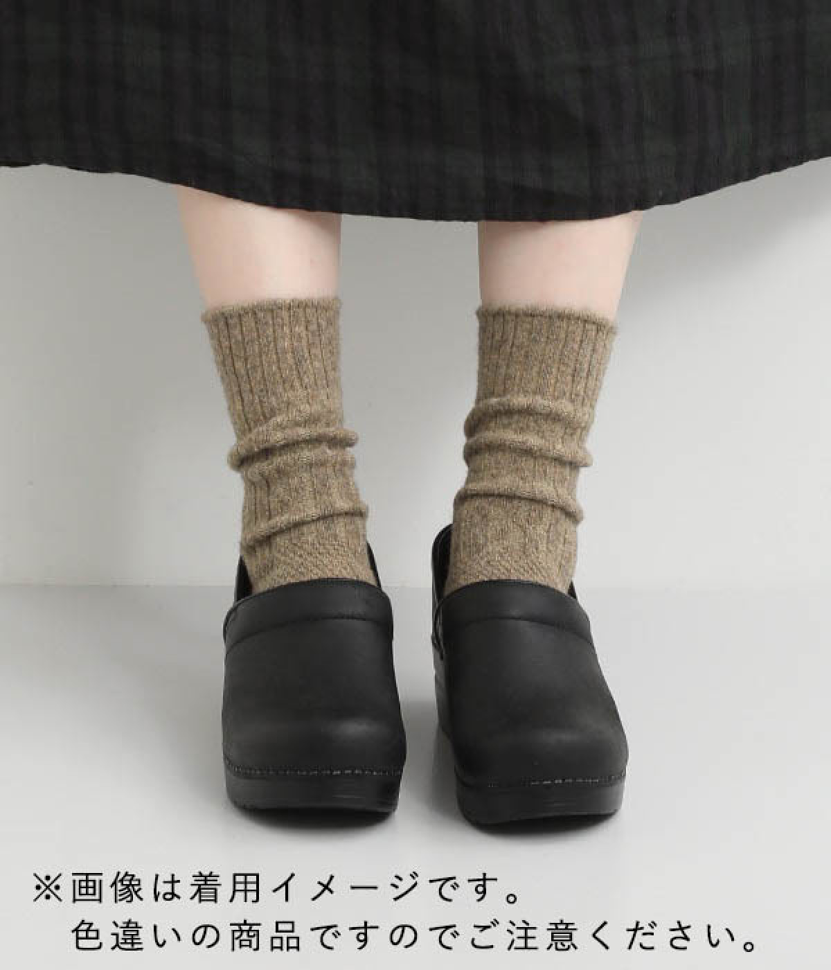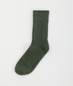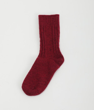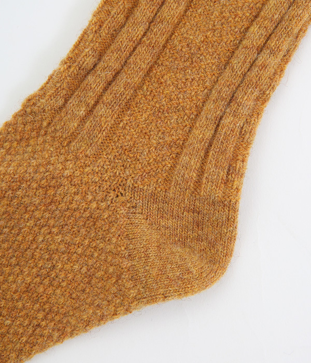 ふんわりと編み立てた、あたたかな風合いと優しい肌触りが特徴的な適度な厚みのあるウール混紡素材のソックスです。すっきりとしたリブ編みとぽこぽことした柄編みを切り替えたデザインが、足元のさりげないアクセントになります。スニーカー合わせはもちろん、ショートブーツやサンダル、サボなどシューズを選ばず幅広い足元コーディネートが楽しめるシンプルさも魅力です。