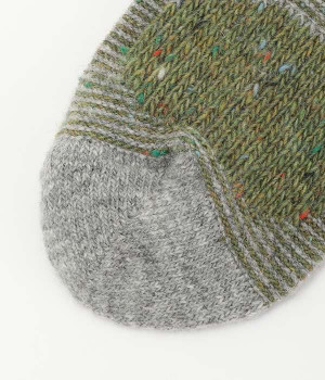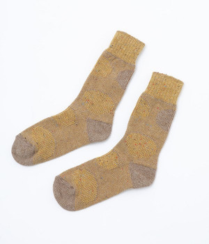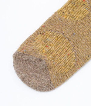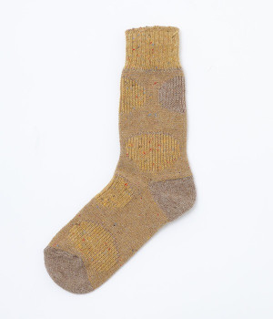 ジャカード織りによって色の濃淡がついた、優しい風合いのドット柄を表現したソックスです。落ち着いた色合いなので柄物が苦手な方にも取り入れやすい一足に。直角のかかとはずれにくい仕様で、履き口はリブになっていて程よいフィット感です。ドット・つま先・かかとの配色もポイントで、靴を脱いでもかわいいデザイン。チクチク感の少ないウール混紡素材で暖かな履き心地です。