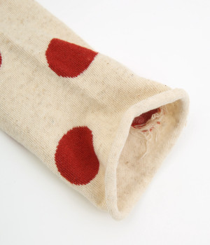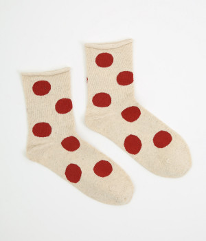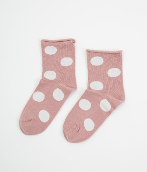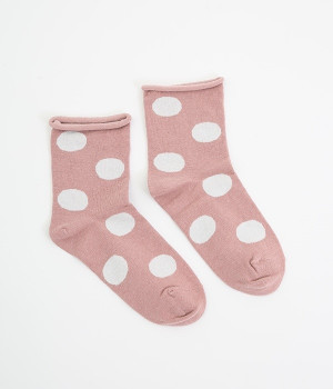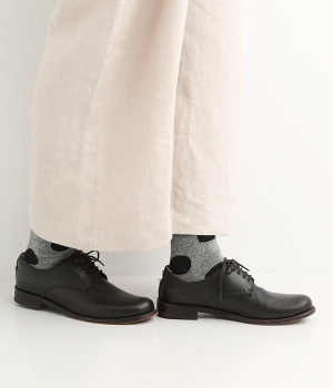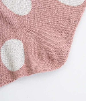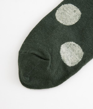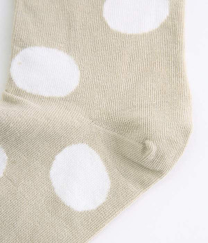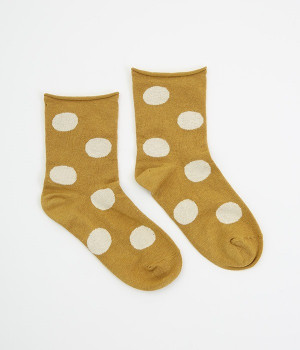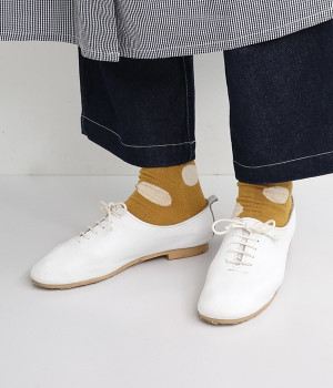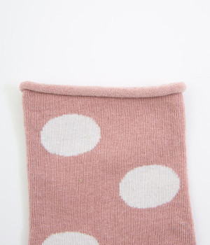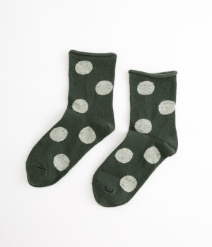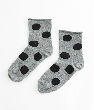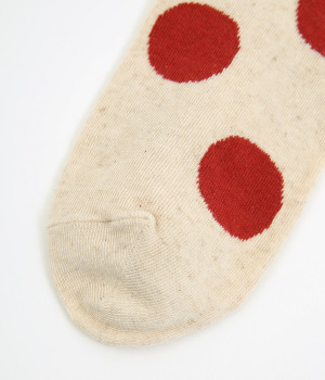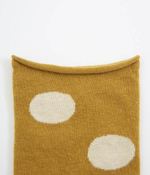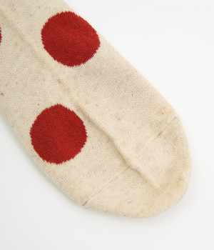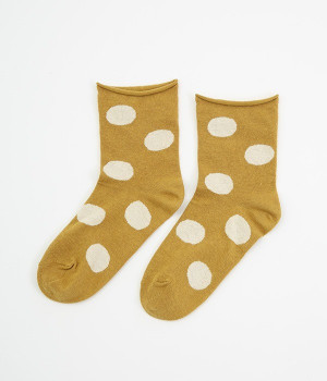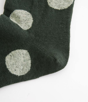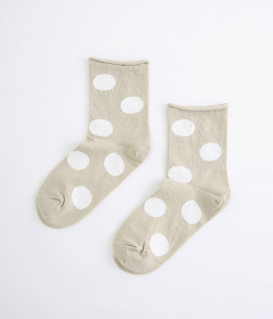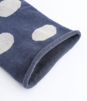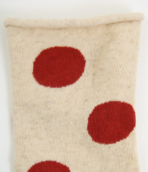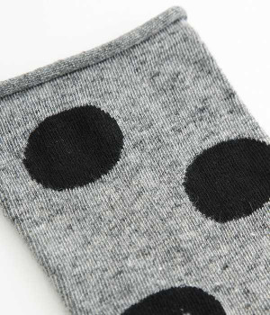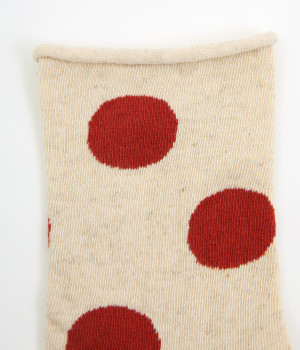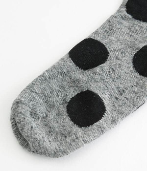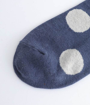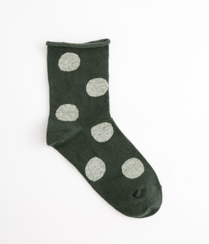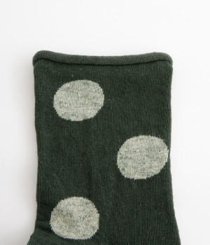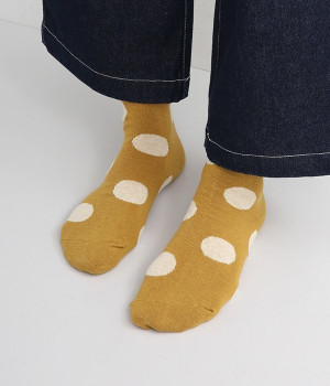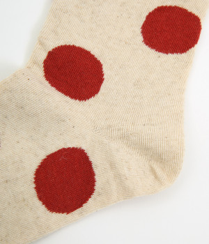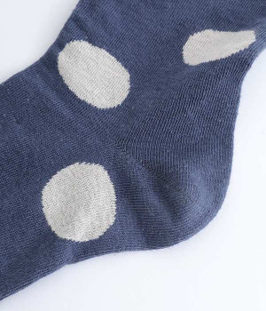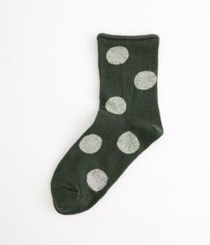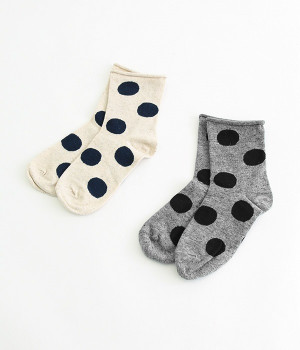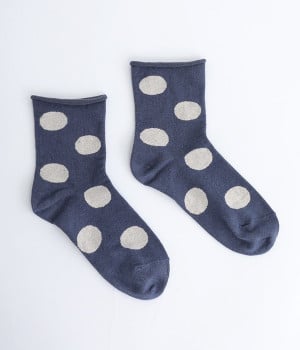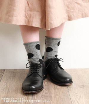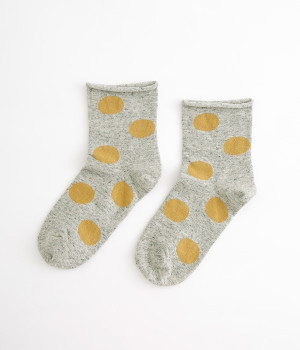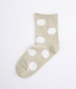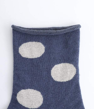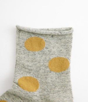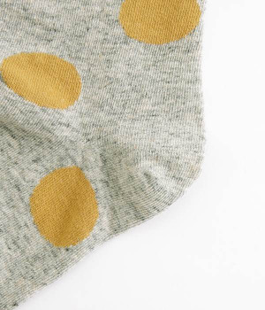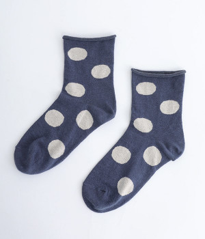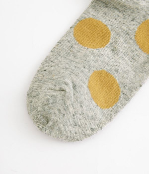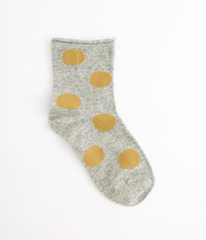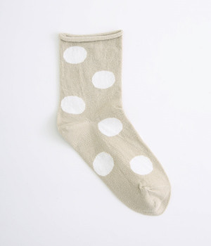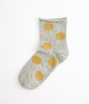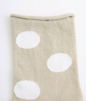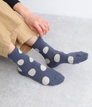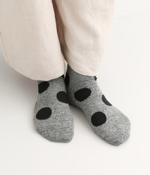 コットンのやわらかさとリネンのすっきりとした素材感を兼ね備えた、デイリーに使えるソックス。大きめのドット柄が着こなしをフェミニンに仕上げてくれます。ベースの色は杢調でさまざまなアイテムとなじみやすく重宝。はき口のロールデザインもかわいらしいアクセントを添えています。サンダルに合わせてもOKで、季節問わず活躍します。