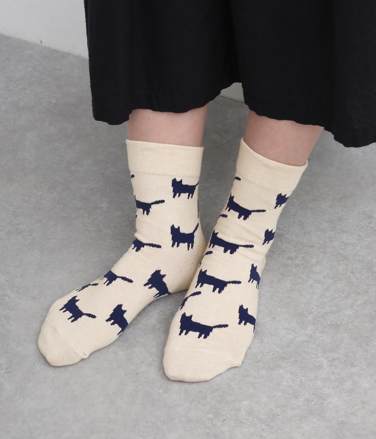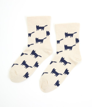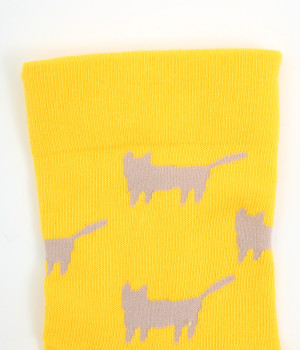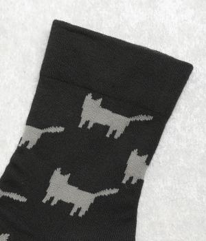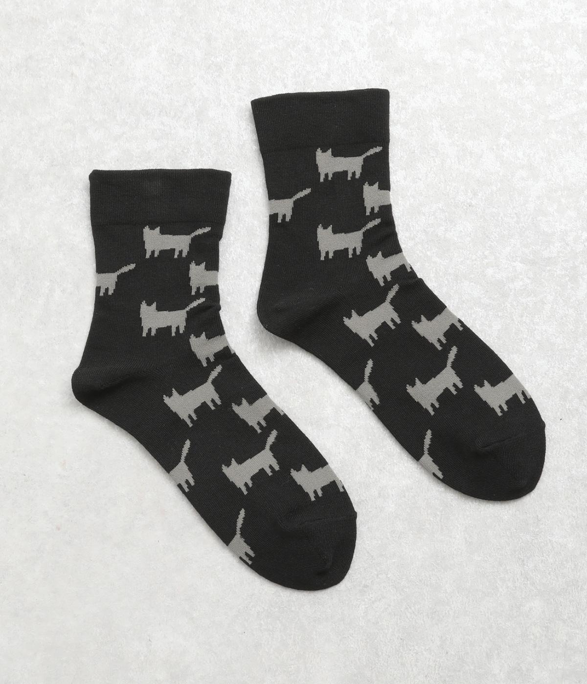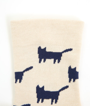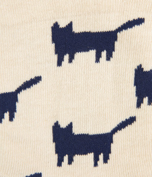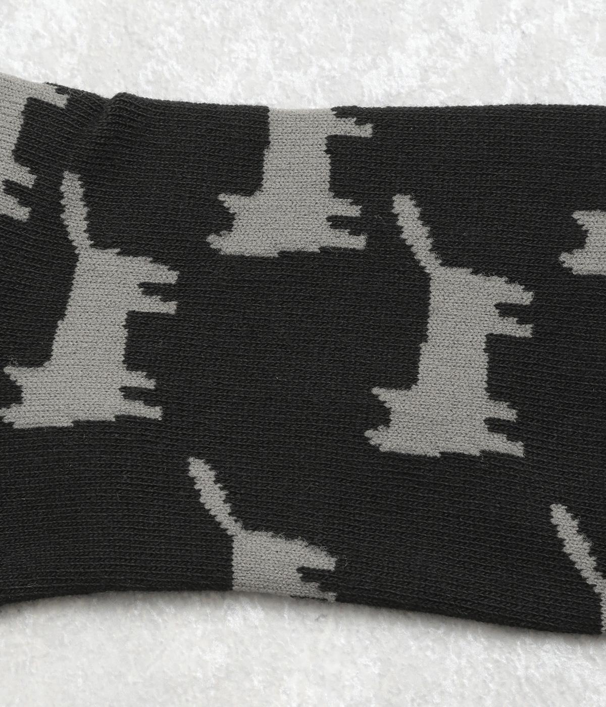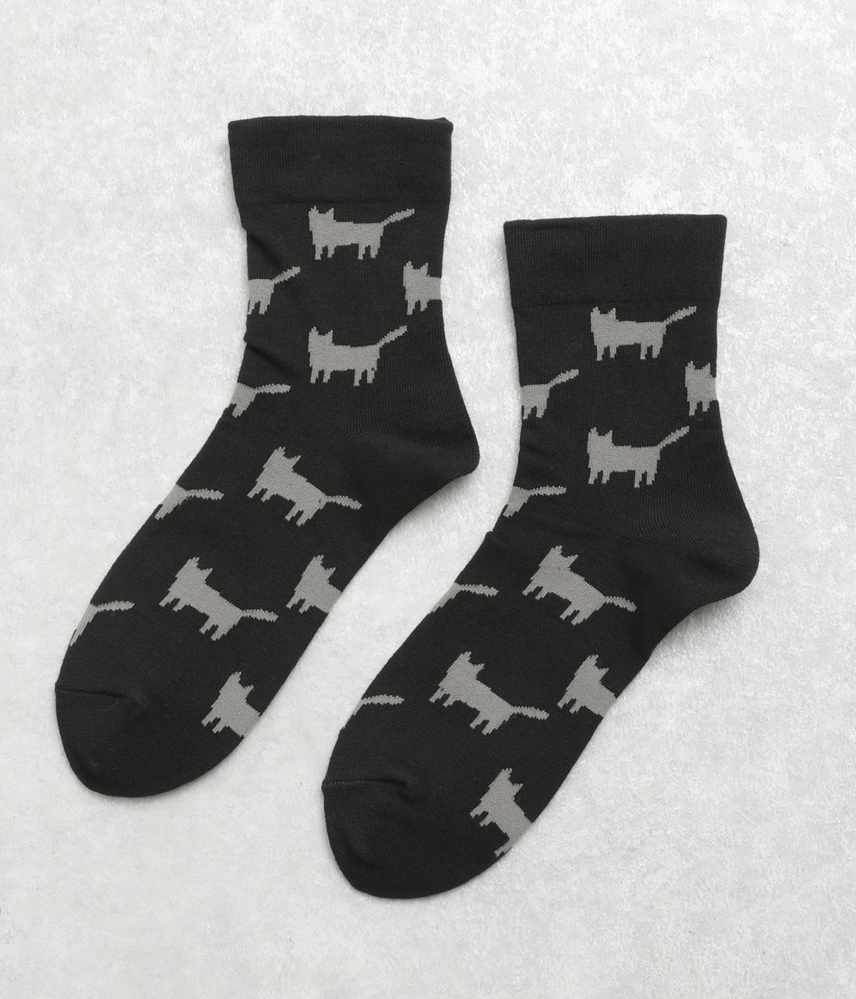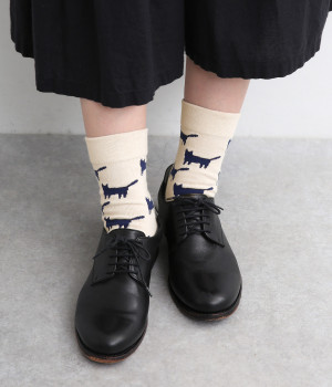 可愛らしさのある猫モチーフをシルエットのみでスタイリッシュに表現し、大人スタイルにも取り入れやすく仕立てました。はき口にゴムを入れず、締めつけ感を軽減させたストレスフリー仕様もうれしいポイント。