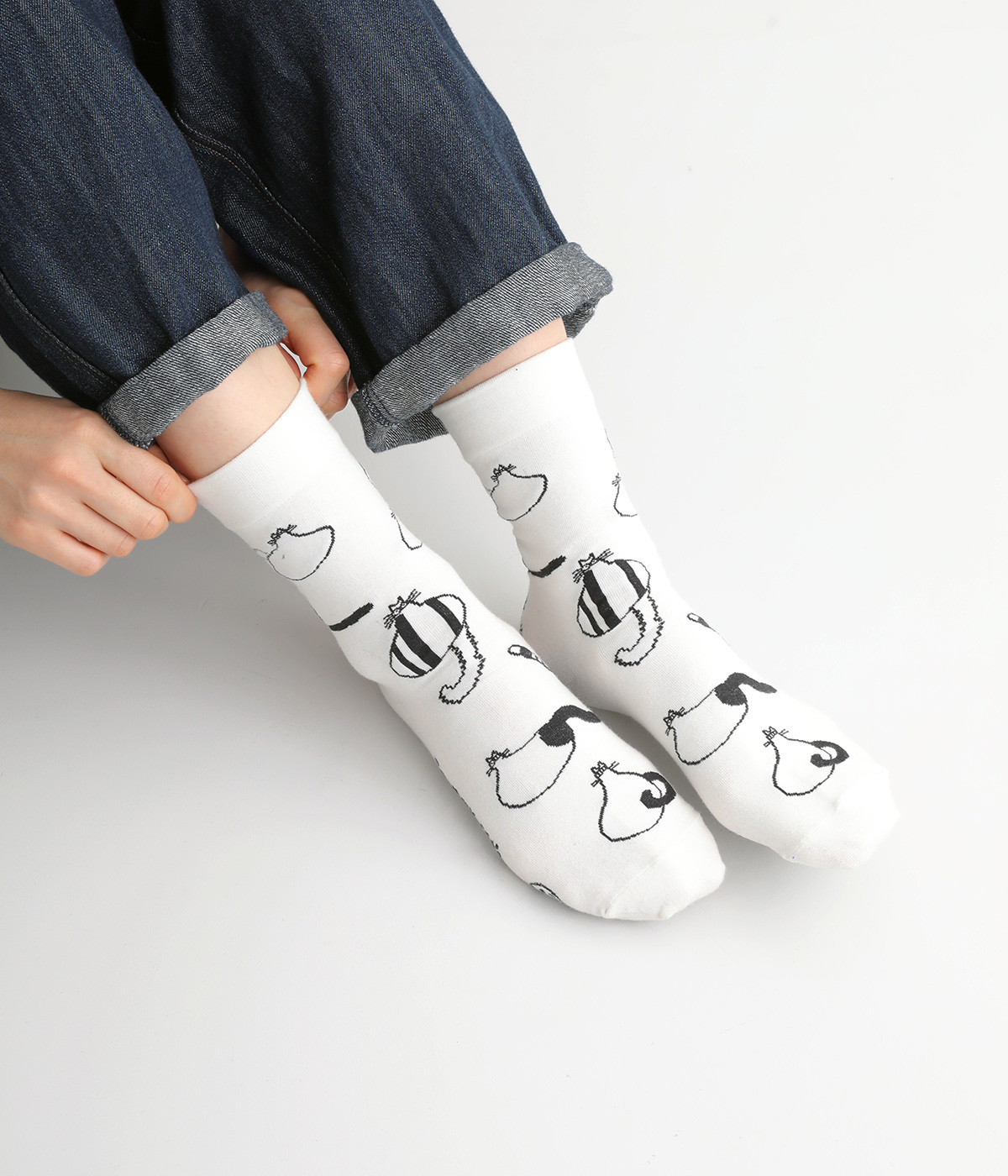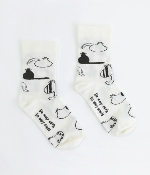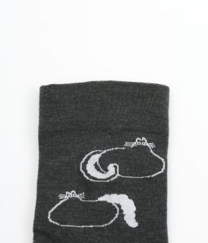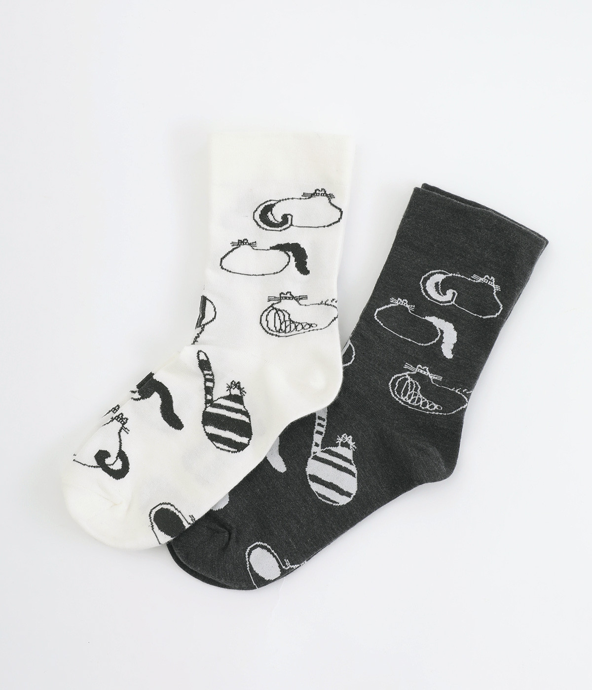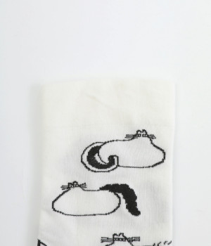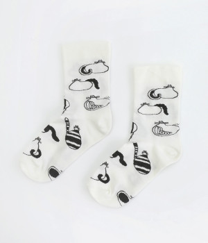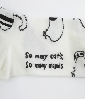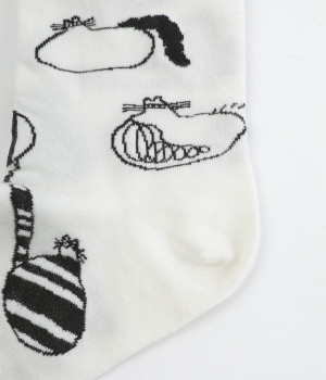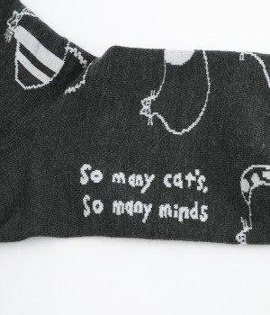 スズキマイコさんとのコラボレーションから誕生したソックスです。個性的な柄をもつたくさんのネコたちをモチーフにした、癒し系のルックスが◎。クロップドパンツやスカートの裾からチラリと見せるだけでもおしゃれがきまります。