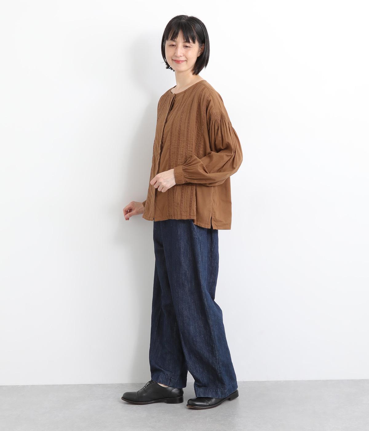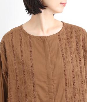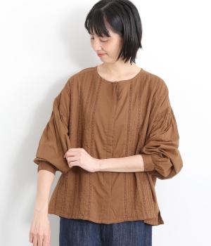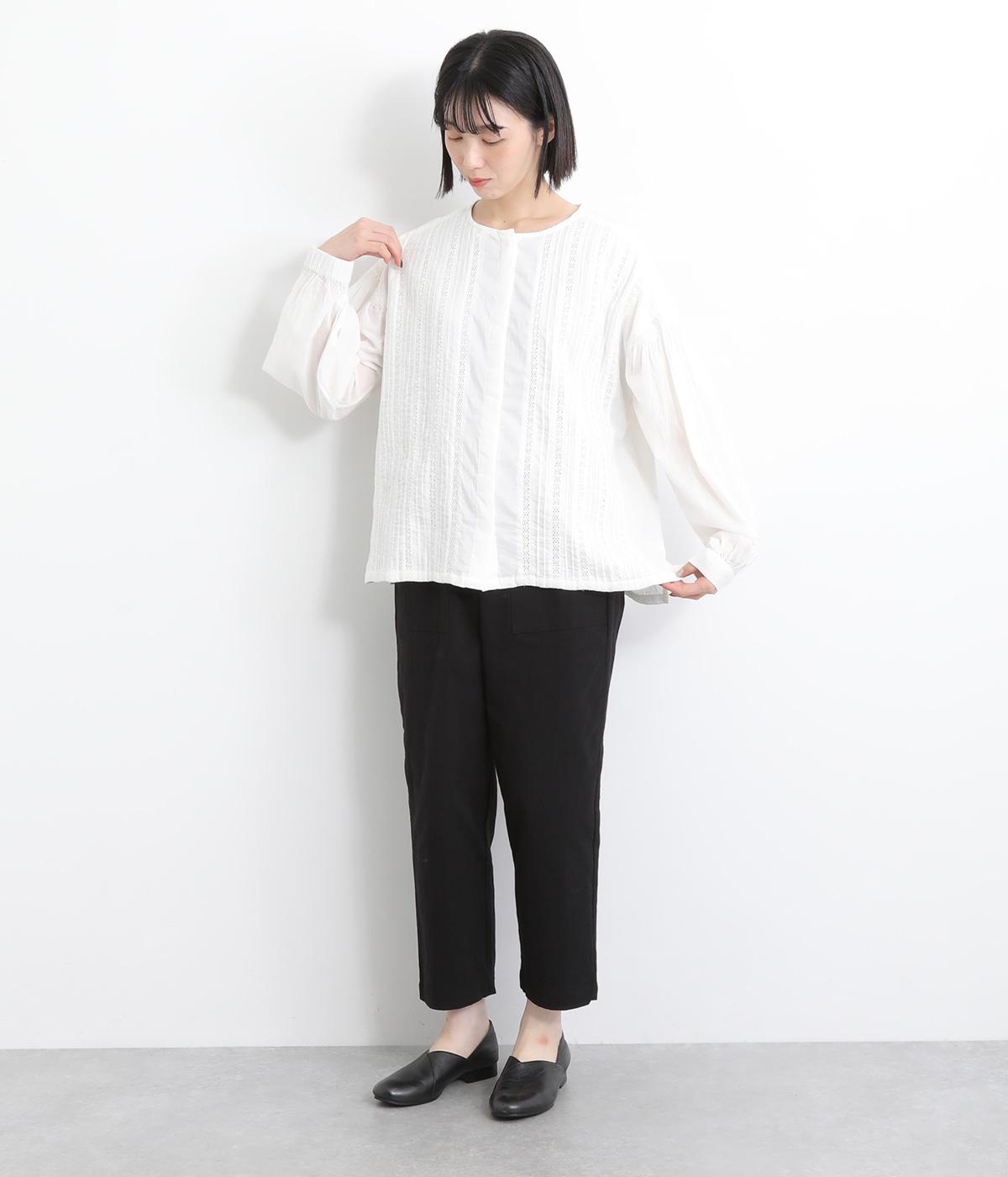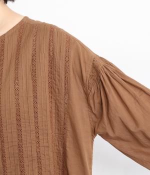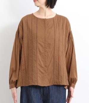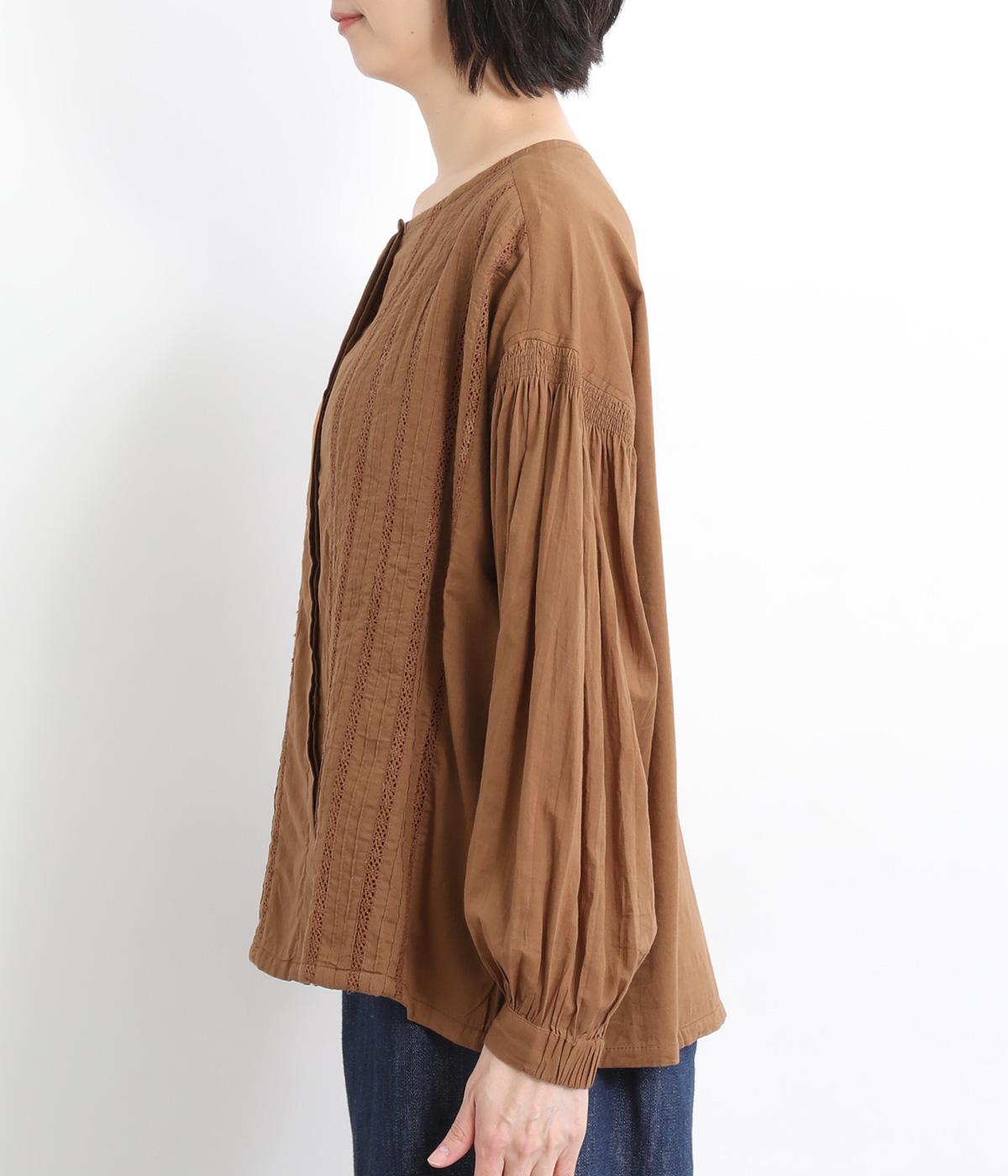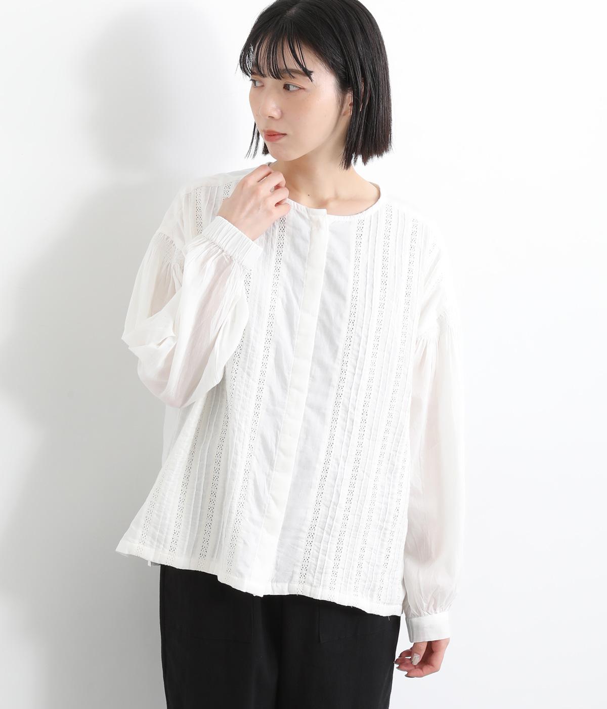 たっぷりのレースとピンタックがナチュラル&華やかなブラウスです。袖山にもシャーリングを寄せてふわりとしたやさしい雰囲気に。比翼の前あきなので羽織りにもなり、袖口も部分的にゴムが入っているので着こなしの幅も広がります。