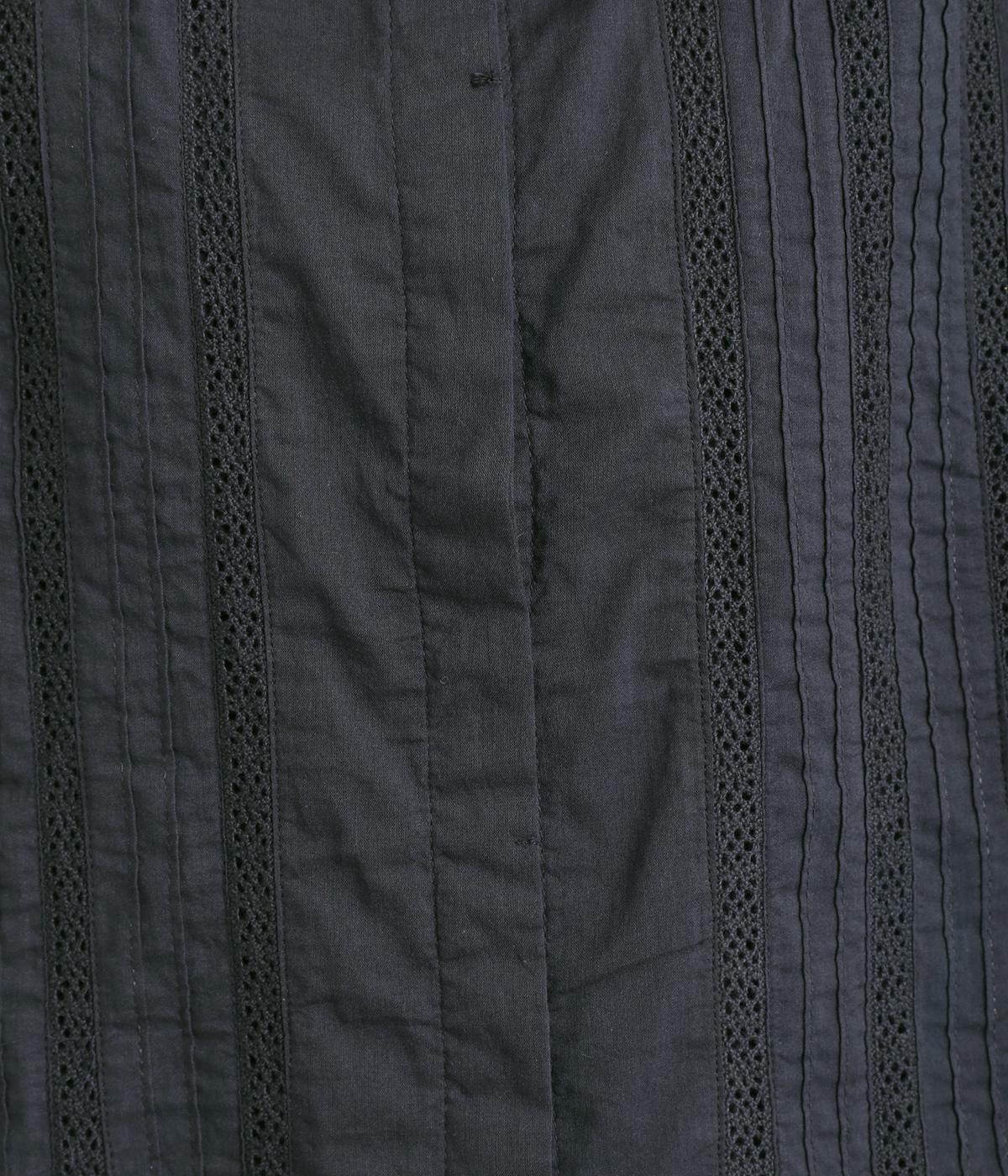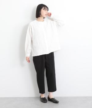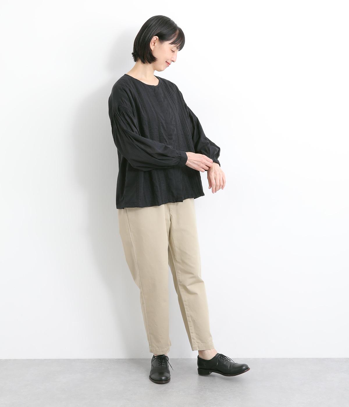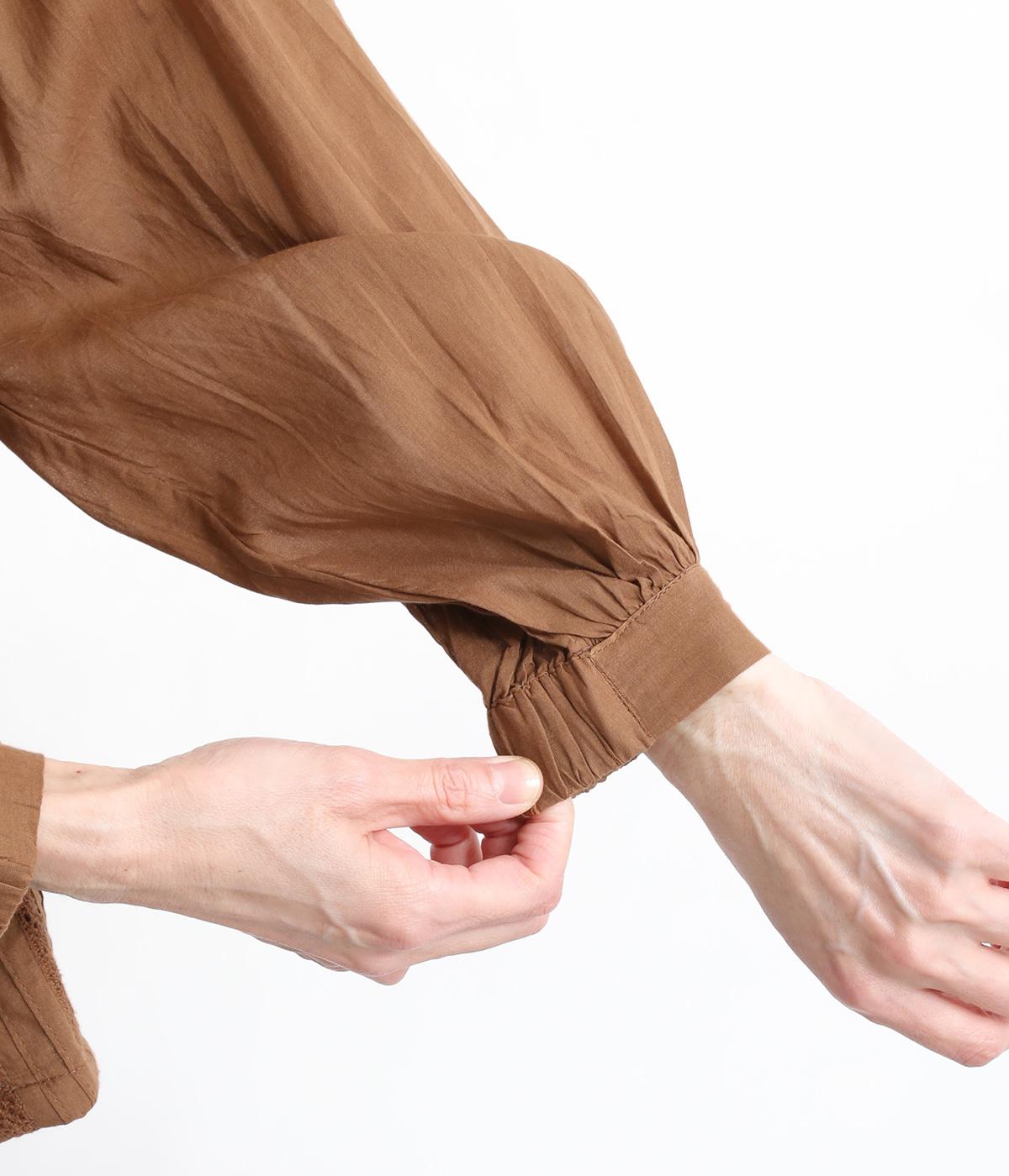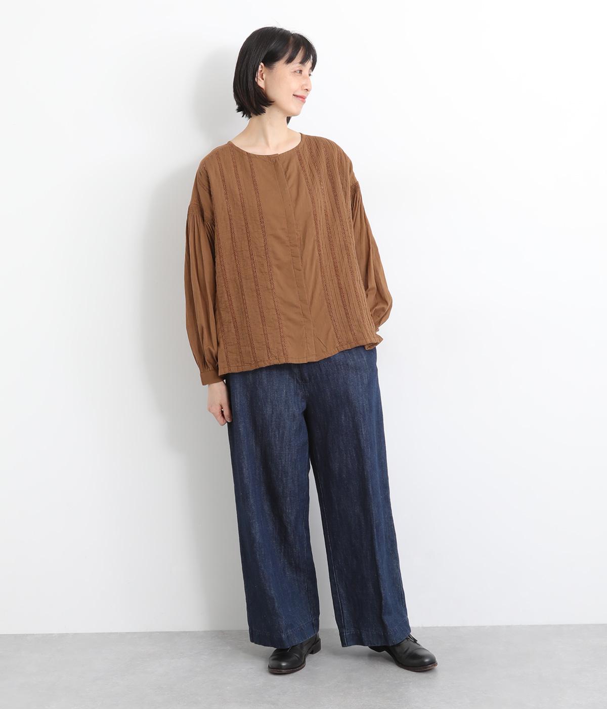 たっぷりのレースとピンタックがナチュラル&華やかなブラウスです。袖山にもシャーリングを寄せてふわりとしたやさしい雰囲気に。比翼の前あきなので羽織りにもなり、袖口も部分的にゴムが入っているので着こなしの幅も広がります。