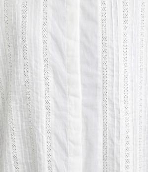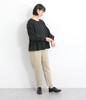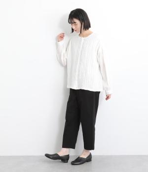 ナチュラルな風合いが魅力のコットンボイルを使用しています。薄手で通気性も良く、適度なふくらみで着心地も快適です。前身頃はベースにレースを重ねているのでややしっかりとした生地感になっています。
