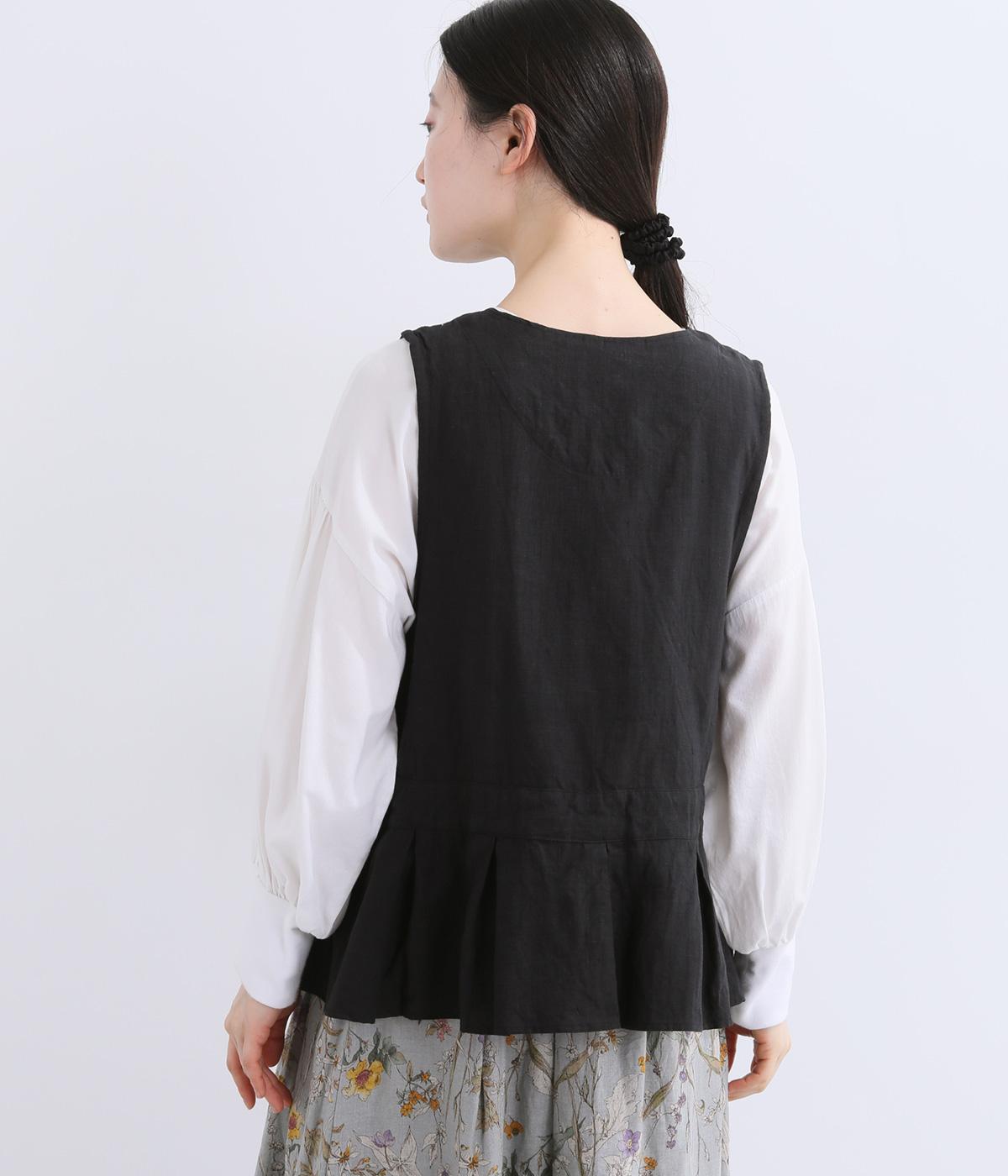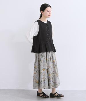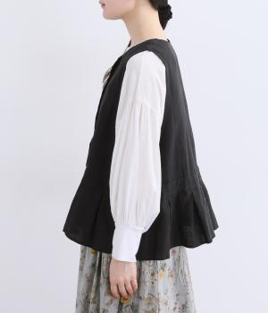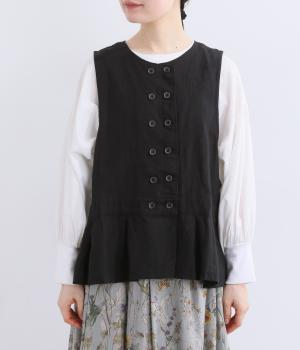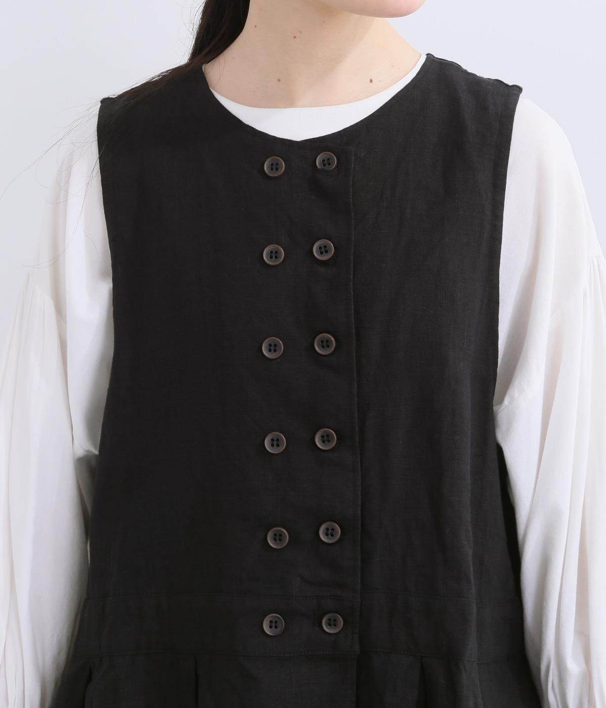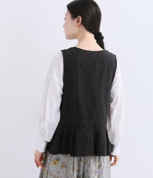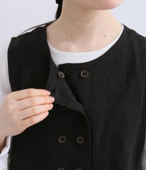 ダブルボタンがクラシカルな雰囲気をまとうベストです。裾のフレアが装いに華やかさを添えます。ナチュラルな素材感で、Tシャツにもブラウスにもなじみ、カジュアルにもきれいめにも着まわしできるアイテムです。