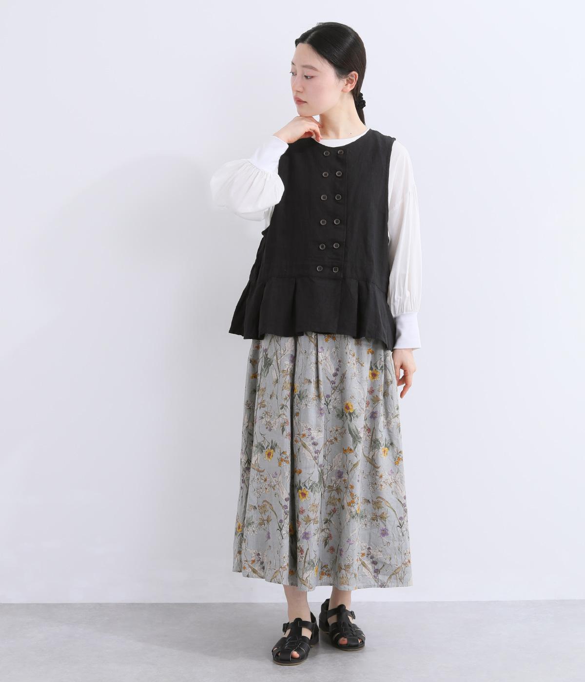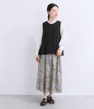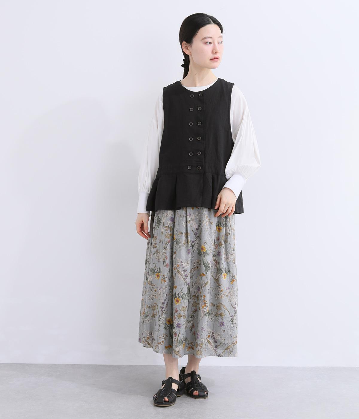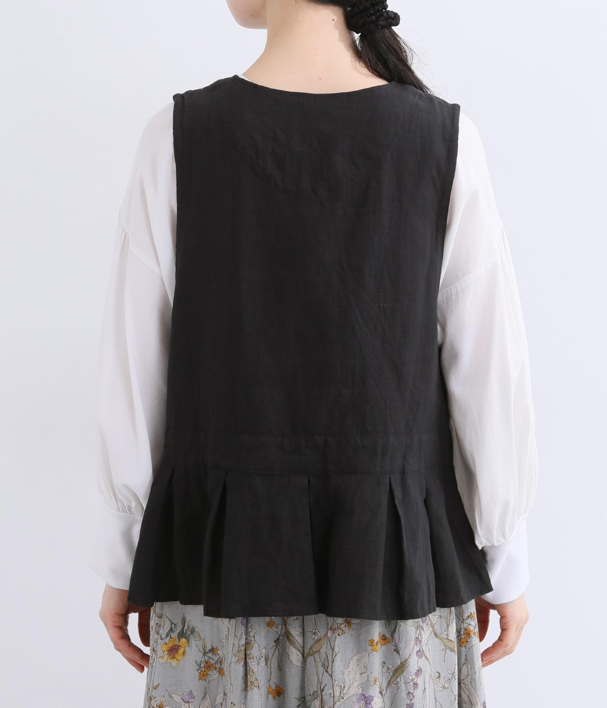 ダブルボタンがクラシカルな雰囲気をまとうベストです。裾のフレアが装いに華やかさを添えます。ナチュラルな素材感で、Tシャツにもブラウスにもなじみ、カジュアルにもきれいめにも着まわしできるアイテムです。