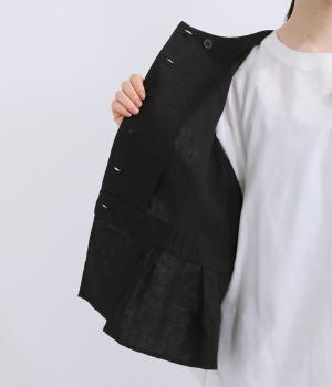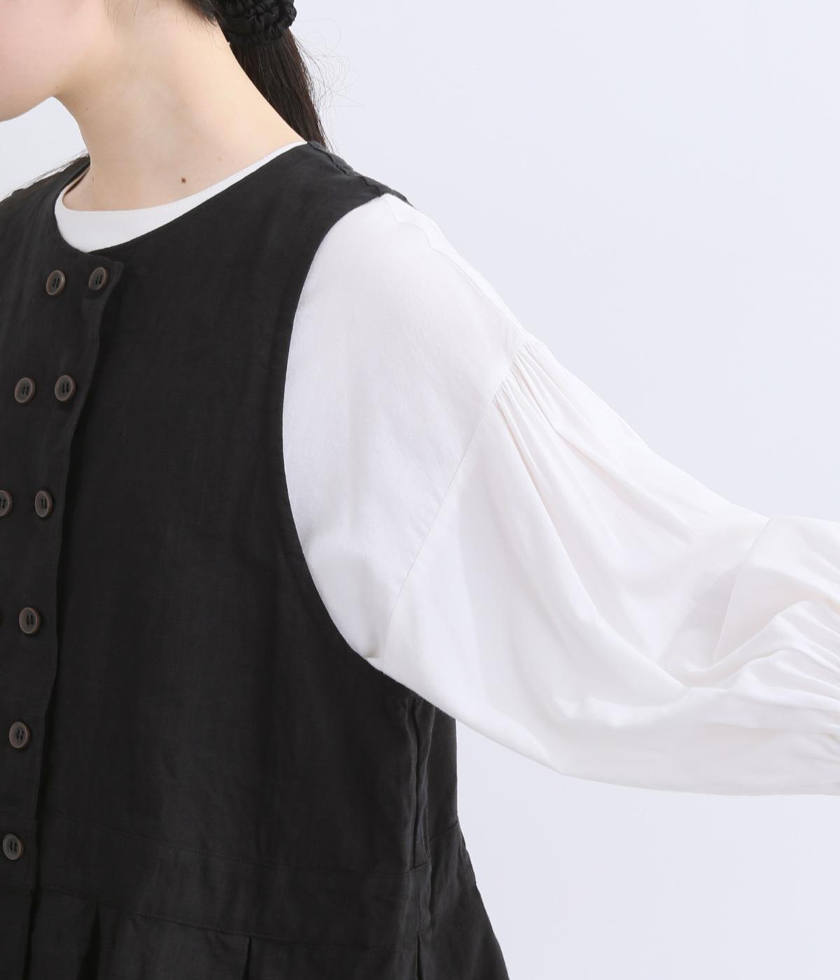 ハリのあるフレンチリネンを使用しています。洗うたびにくったりと柔らかく変化するのも魅力で、涼やかに着られ、ナチュラルな表情の素材感です。