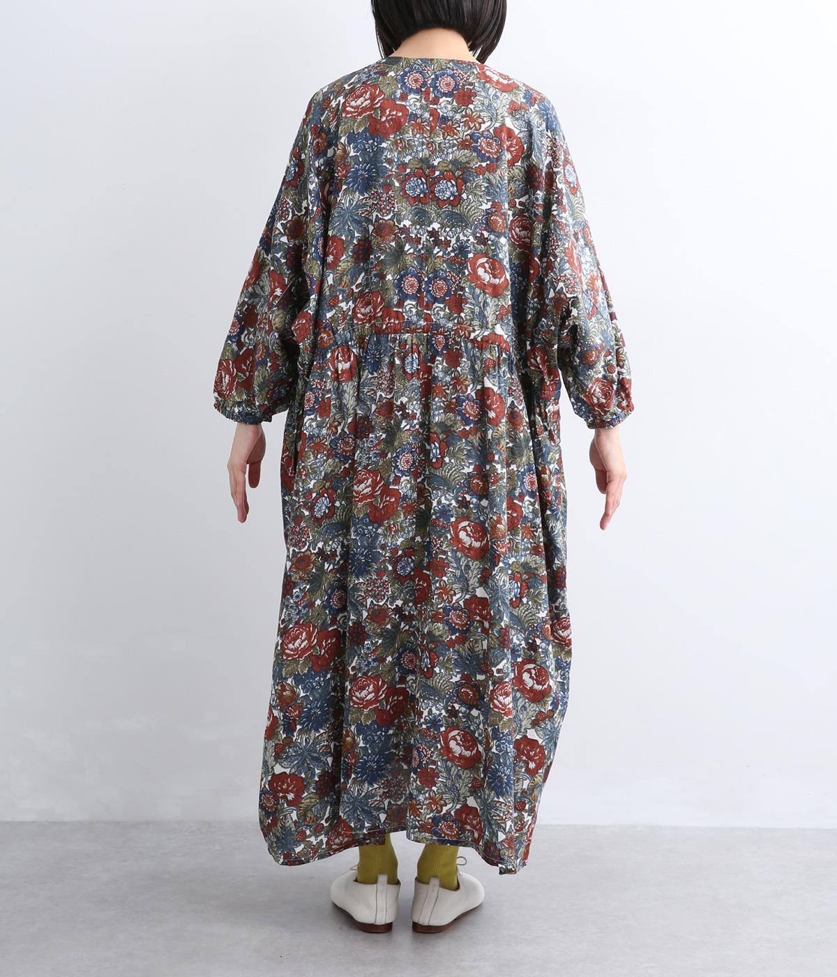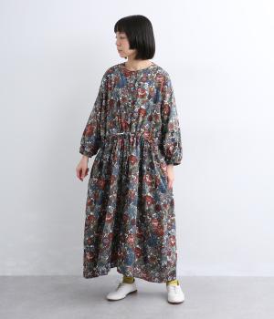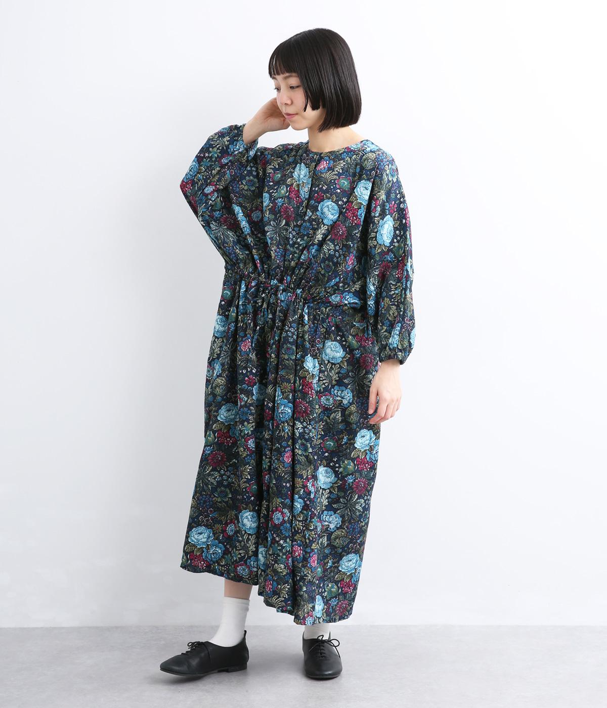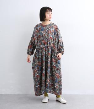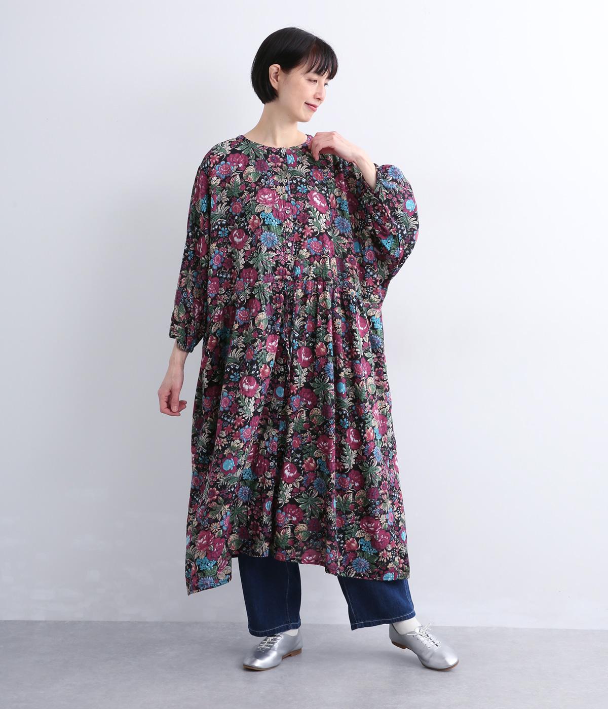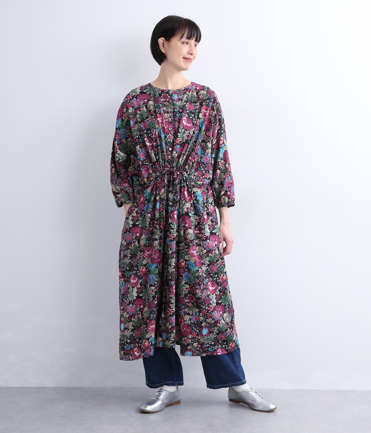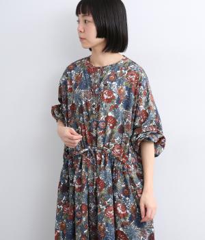 趣のある花柄が目をひくワンピースです。インドの職人による手しごとならではの、やさしいかすれやにじみが味わいを添えます。ウエストにはドロスト紐を配し、お好みのシルエットに調節できます。袖口はゴム仕様で、たくしあげた着こなしも楽しめます。