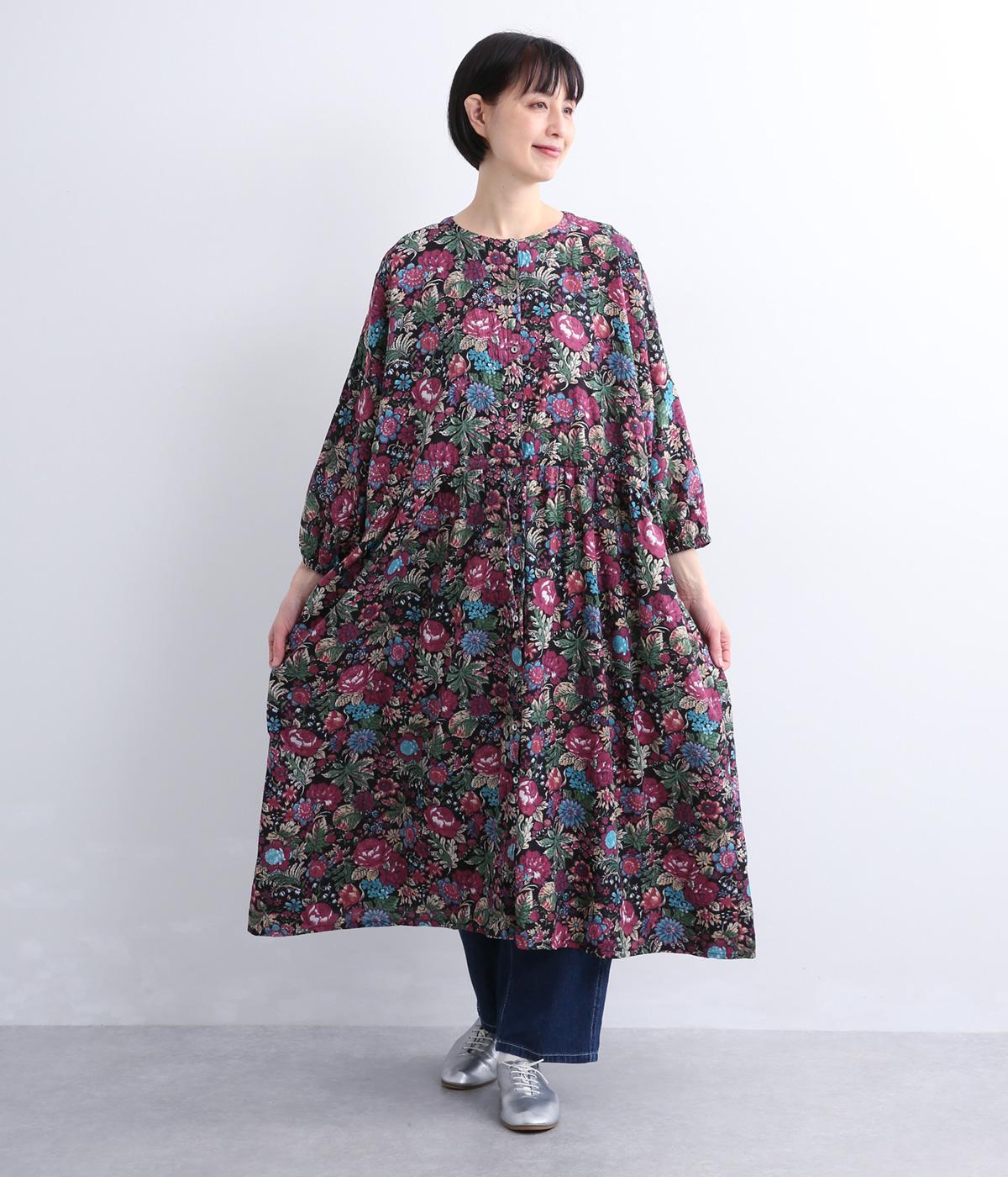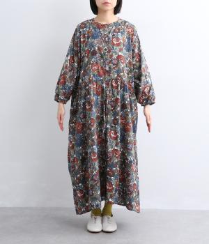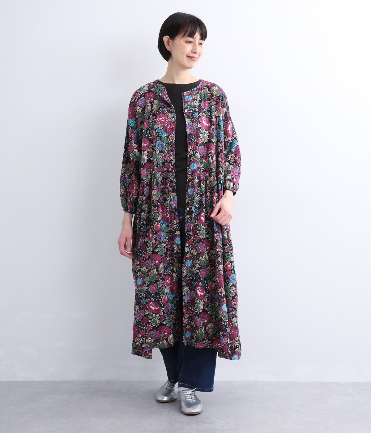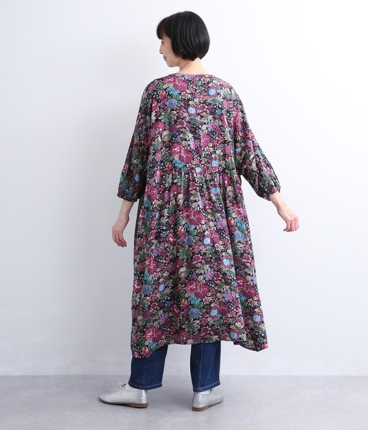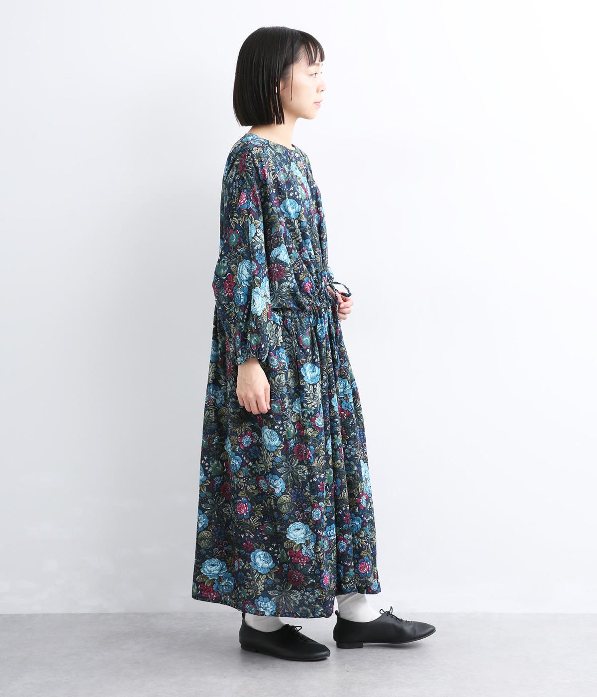 趣のある花柄が目をひくワンピースです。インドの職人による手しごとならではの、やさしいかすれやにじみが味わいを添えます。ウエストにはドロスト紐を配し、お好みのシルエットに調節できます。袖口はゴム仕様で、たくしあげた着こなしも楽しめます。
