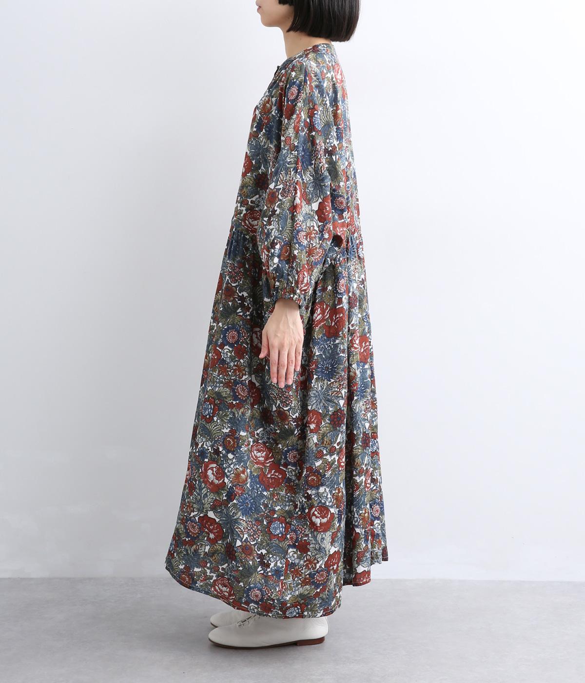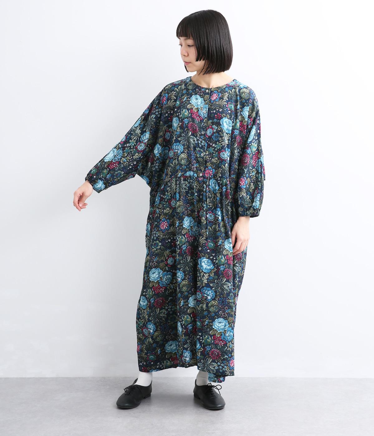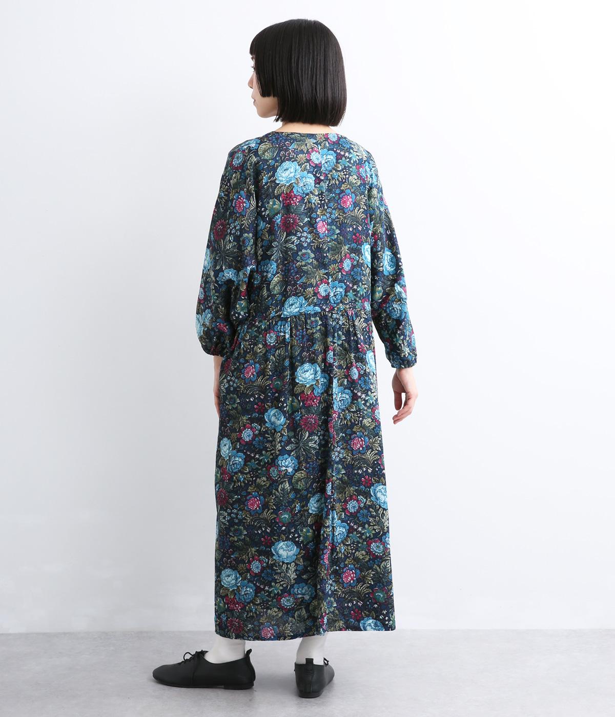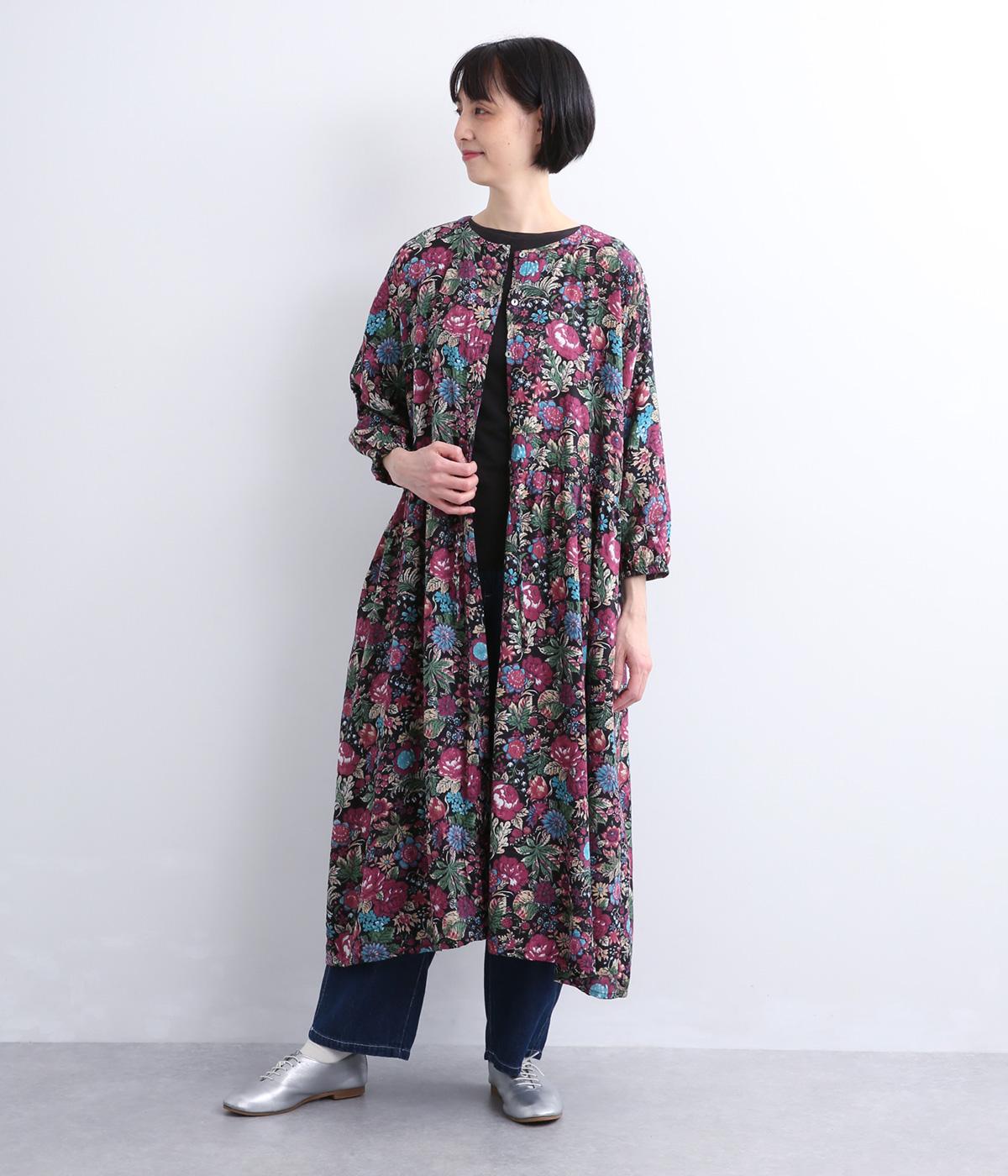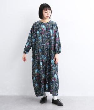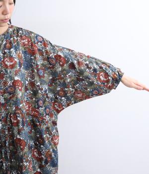 趣のある花柄が目をひくワンピースです。インドの職人による手しごとならではの、やさしいかすれやにじみが味わいを添えます。ウエストにはドロスト紐を配し、お好みのシルエットに調節できます。袖口はゴム仕様で、たくしあげた着こなしも楽しめます。