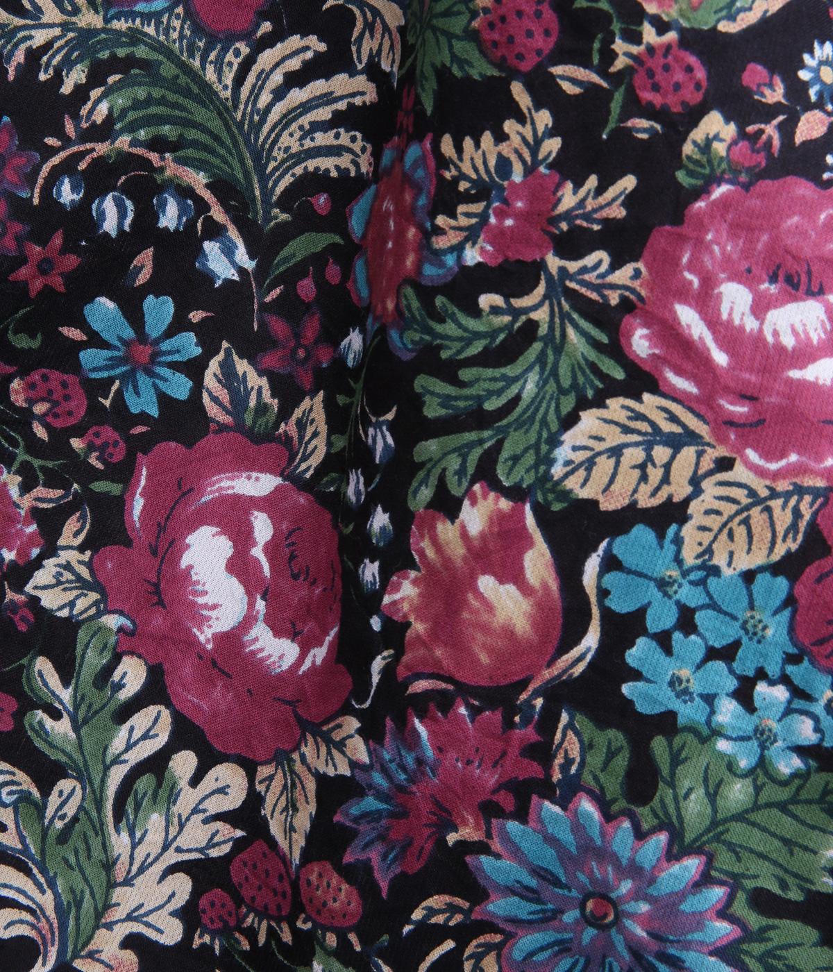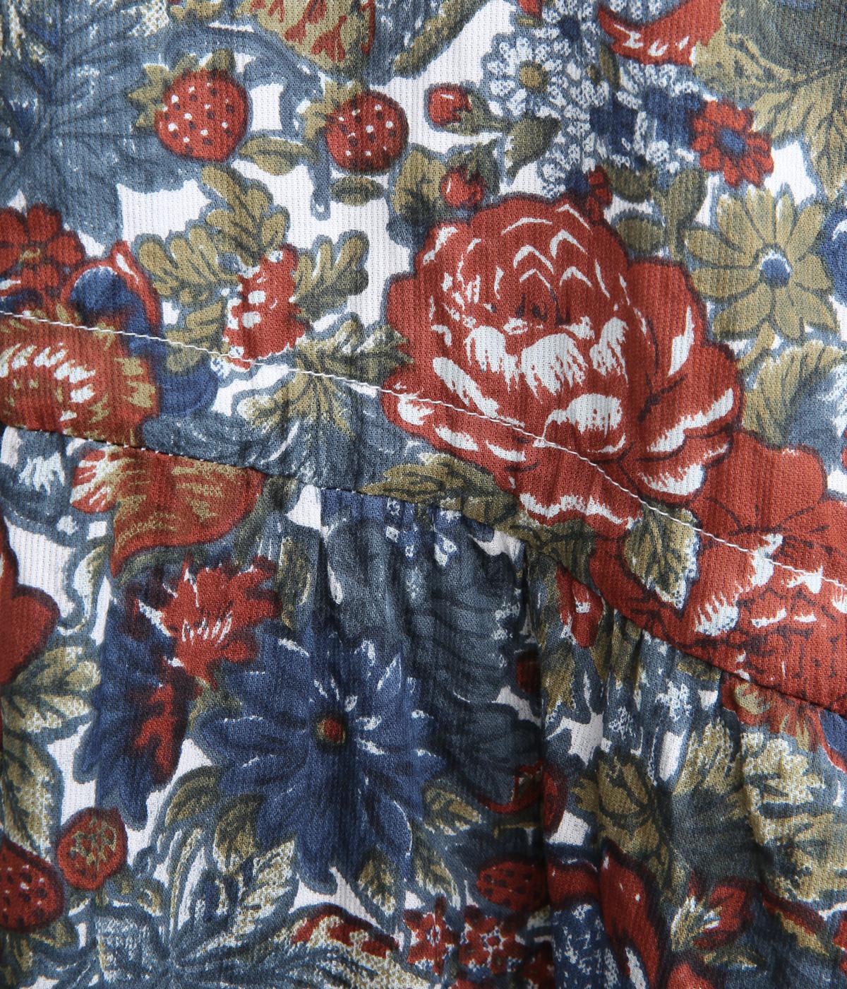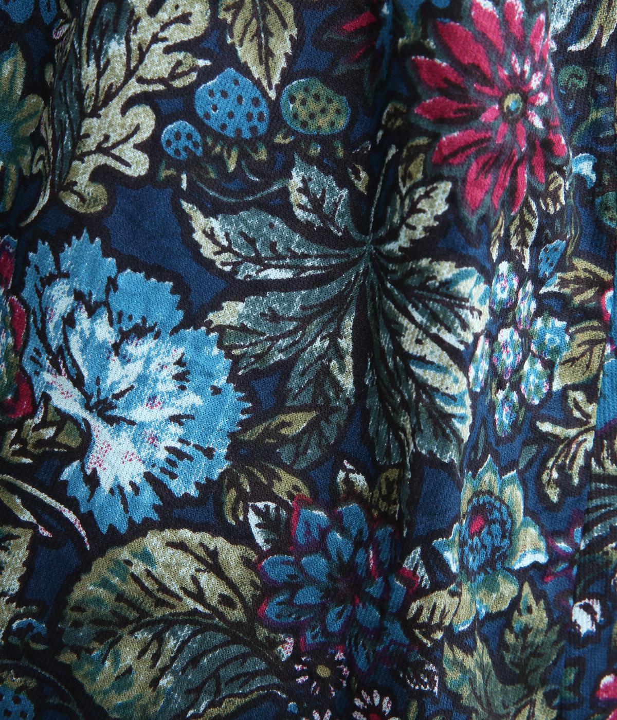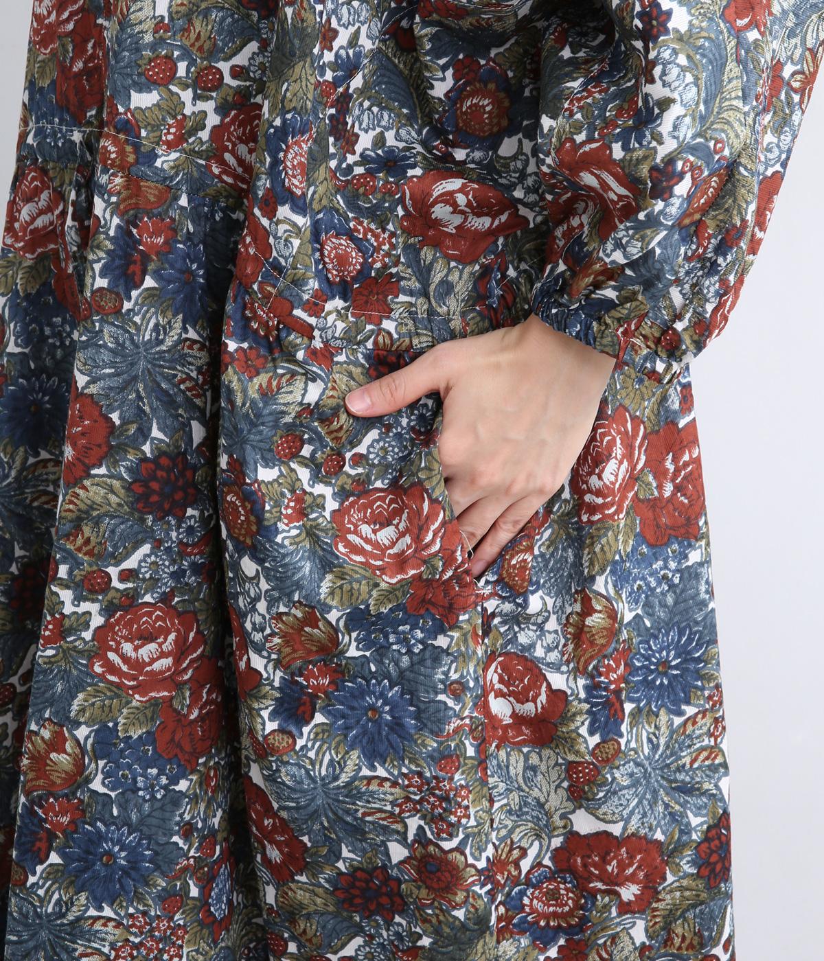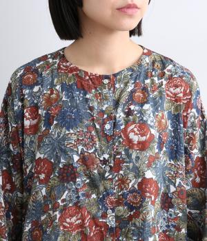 趣のある花柄が目をひくワンピースです。インドの職人による手しごとならではの、やさしいかすれやにじみが味わいを添えます。ウエストにはドロスト紐を配し、お好みのシルエットに調節できます。袖口はゴム仕様で、たくしあげた着こなしも楽しめます。