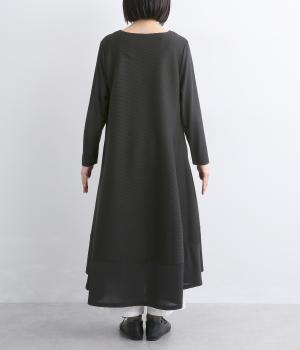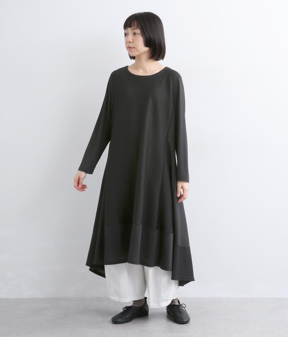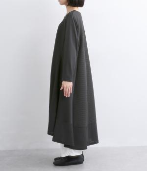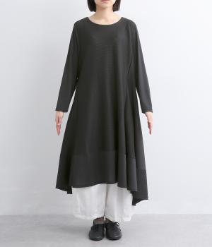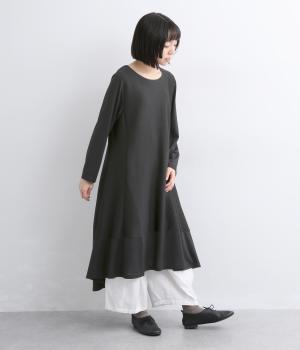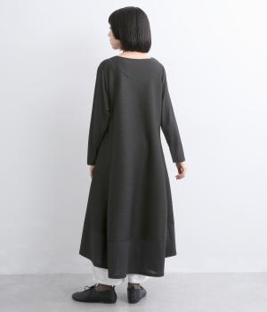 裾に向かって広がるフレアとプリーツ切替が優雅な表情を添えるAラインワンピースです。前後差のあるヘムラインが動きのあるシルエットを生み、軽やかな印象に。リラックス感と落ち着いた大人らしさを両立しました。