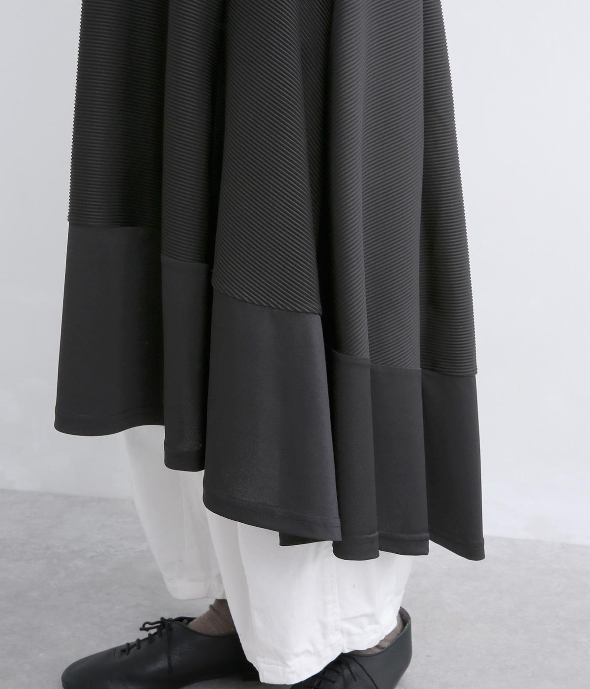 なめらかで光沢のあるポリエステル混紡生地は、適度な伸縮性と柔らかな肌ざわりが魅力です。落ち感が美しく、歩くたびに軽やかに揺れるドレープが上品さを添えます。