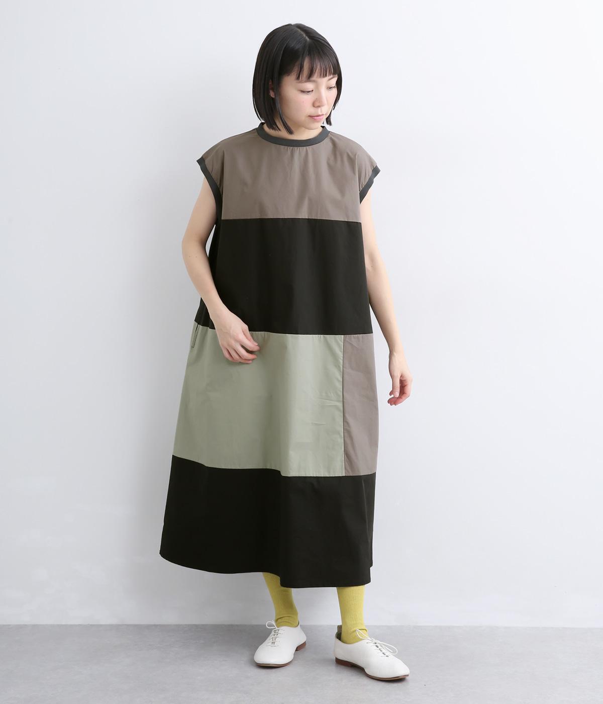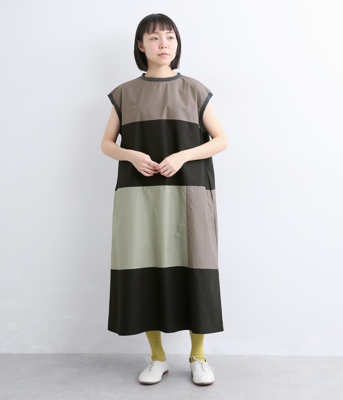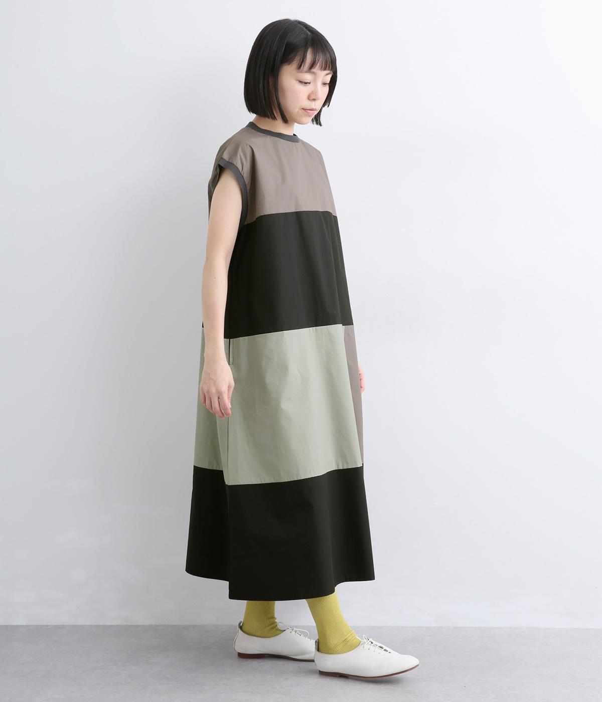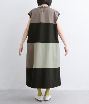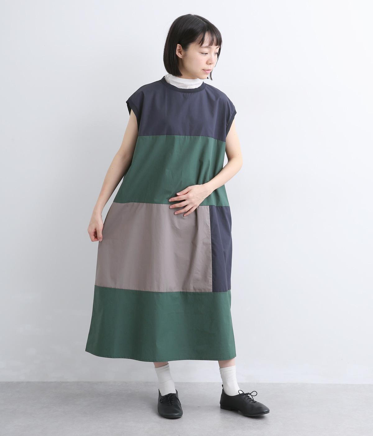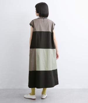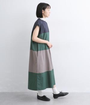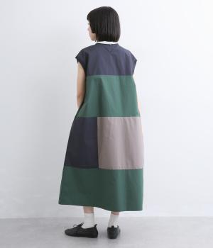 ブロック配色の切り替えが印象的なノースリーブワンピースです。直線的な切り替えで甘さを抑え、ほどよくゆとりのあるAラインシルエットが体のラインを拾いにくい仕上がりに。一枚でさらりと着るのはもちろん、インナーや羽織と合わせて季節を問わず着まわせます。