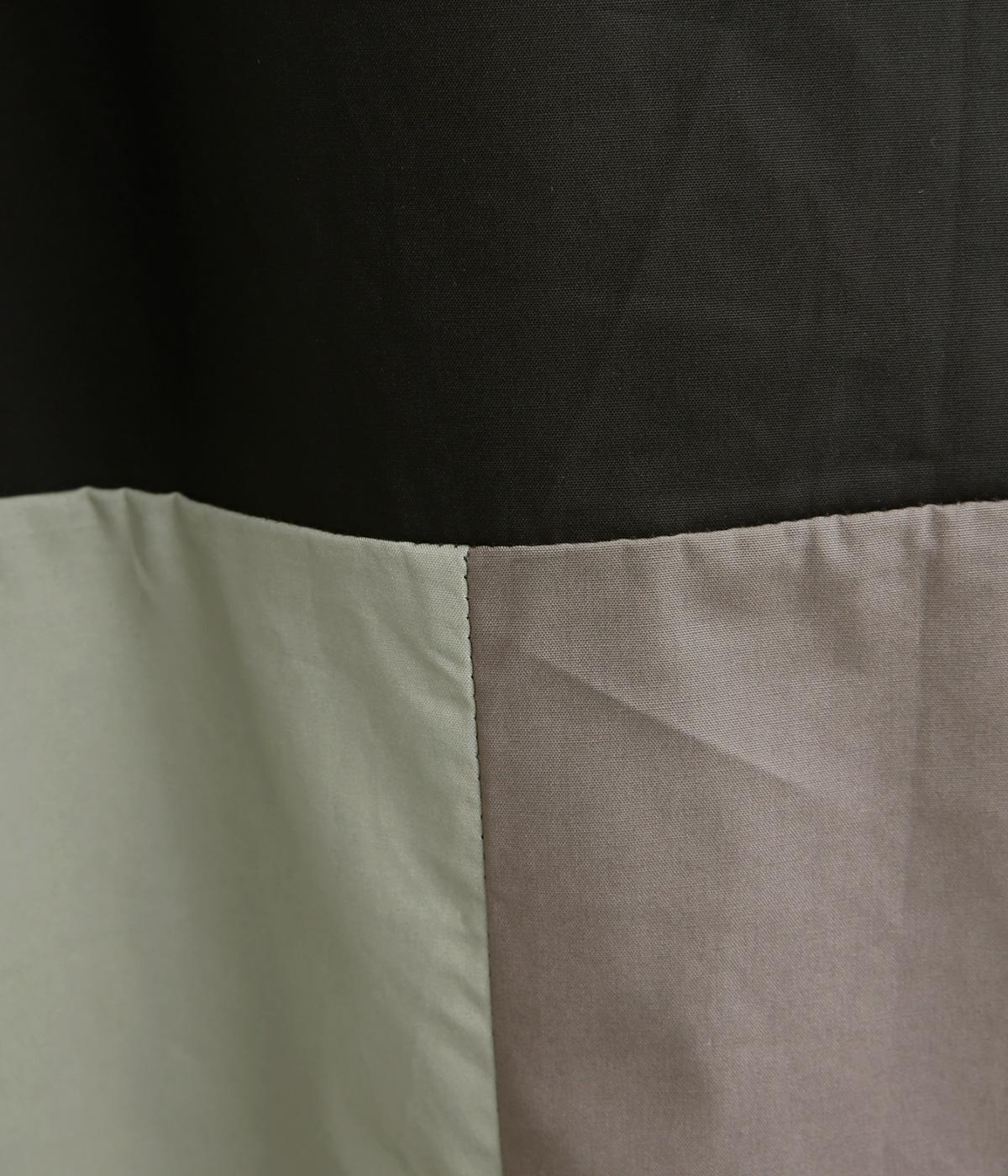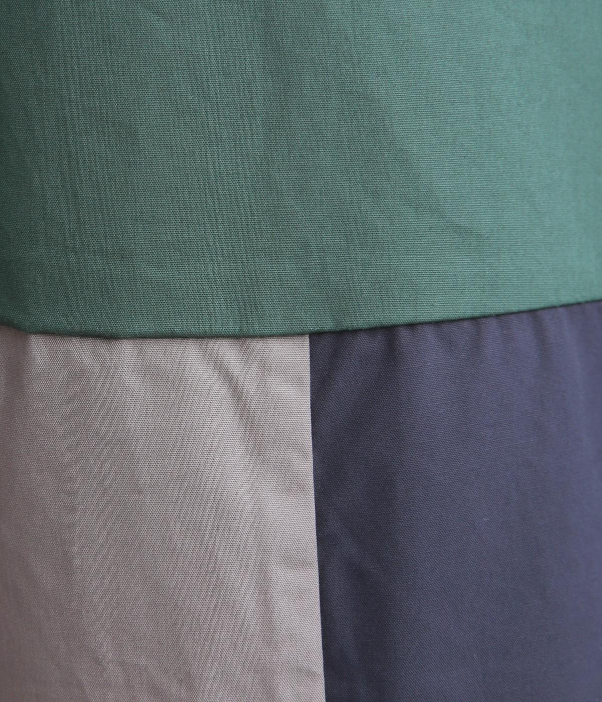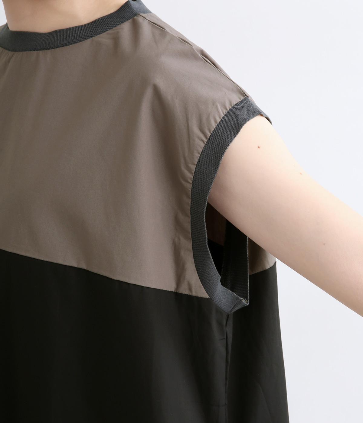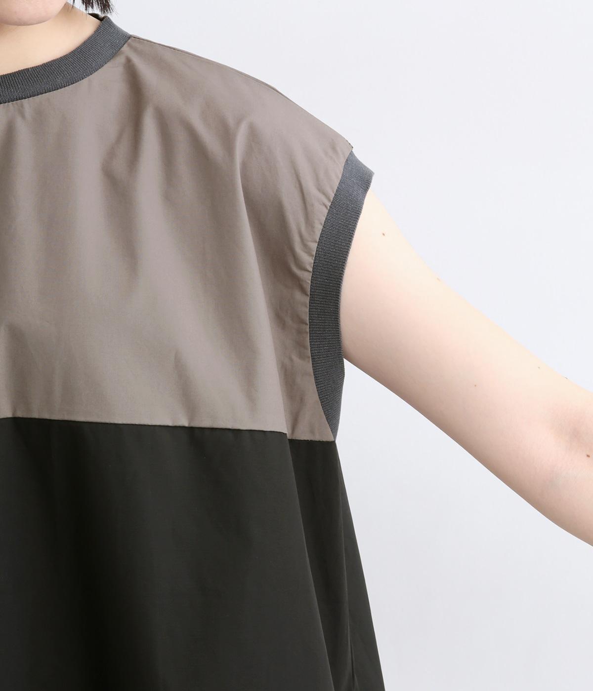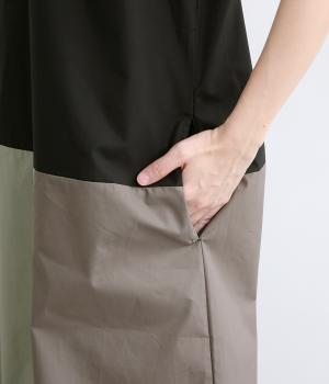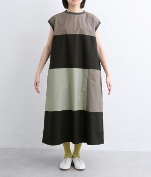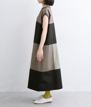 ブロック配色の切り替えが印象的なノースリーブワンピースです。直線的な切り替えで甘さを抑え、ほどよくゆとりのあるAラインシルエットが体のラインを拾いにくい仕上がりに。一枚でさらりと着るのはもちろん、インナーや羽織と合わせて季節を問わず着まわせます。