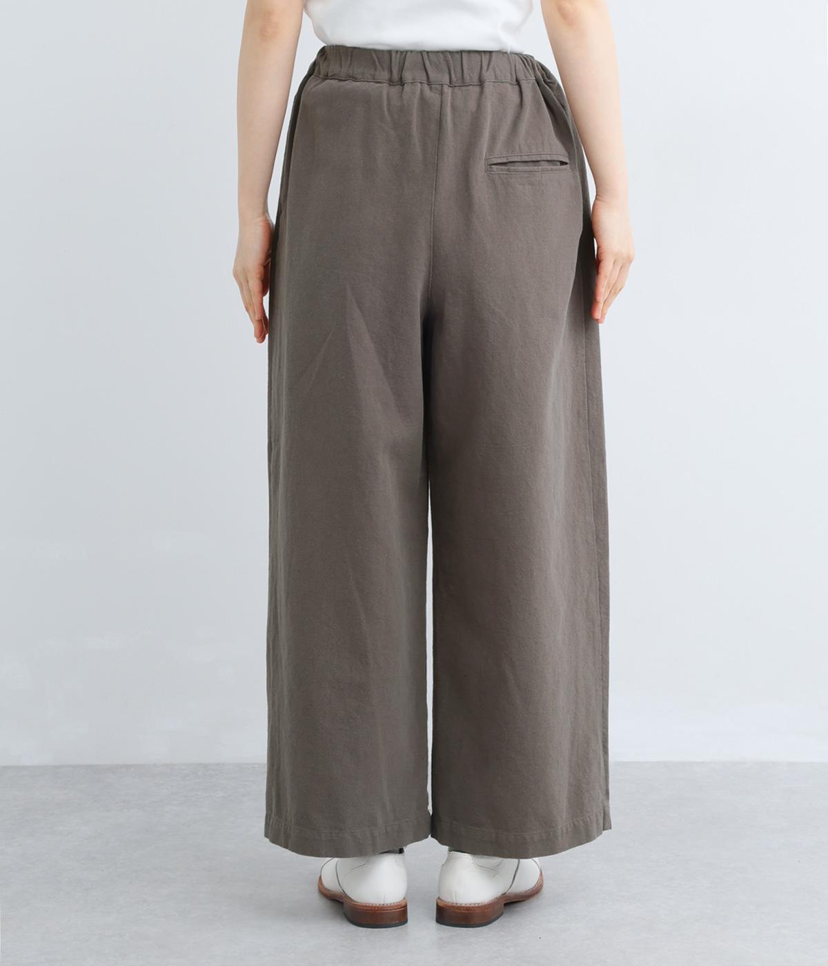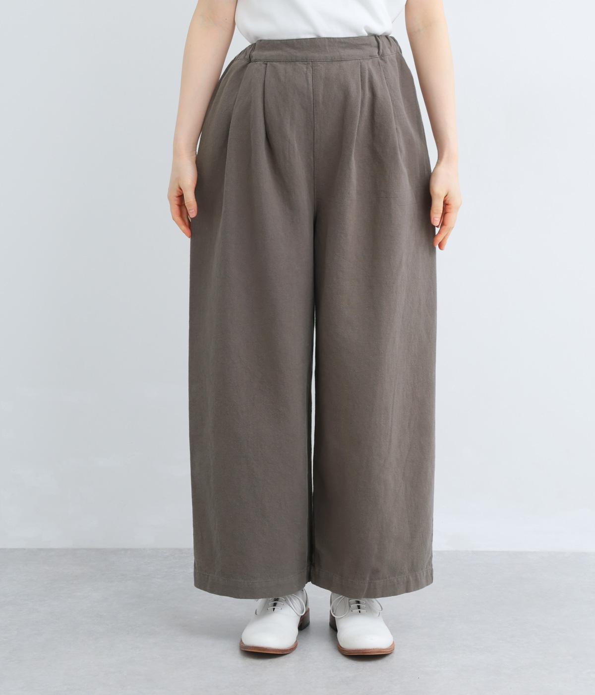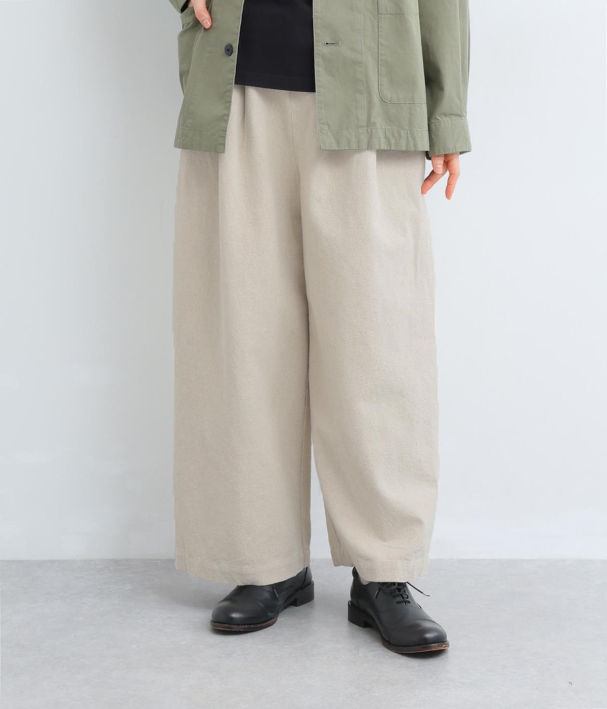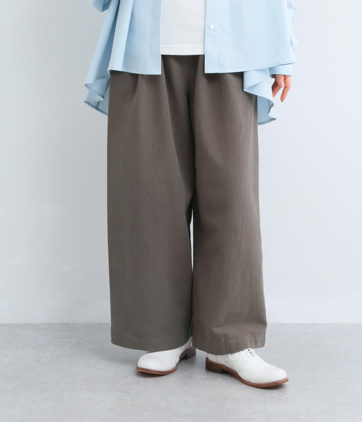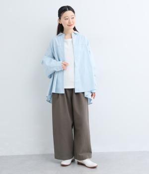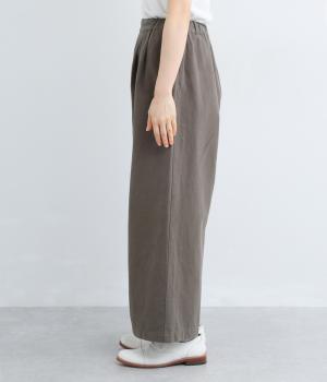 腰まわりや脚のラインを拾いにくいワイドシルエットパンツです。ウエストはサイドからうしろにかけてぐるりとゴムを配し、穿きやすさを確保しつつ、正面はすっきりとした見た目に。トップスインのスタイルもきれいにまとまります。