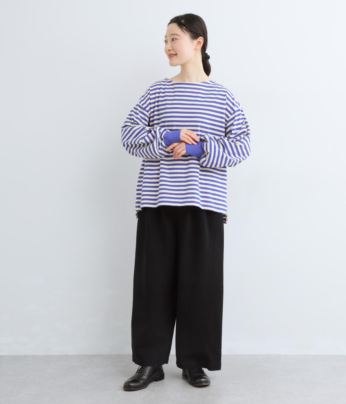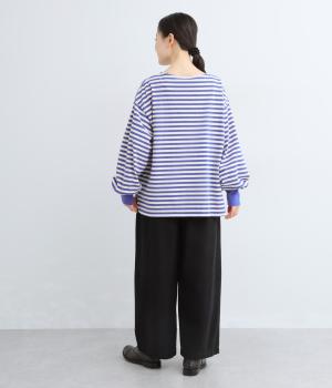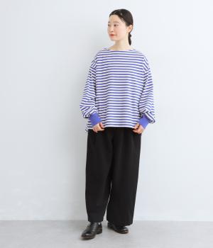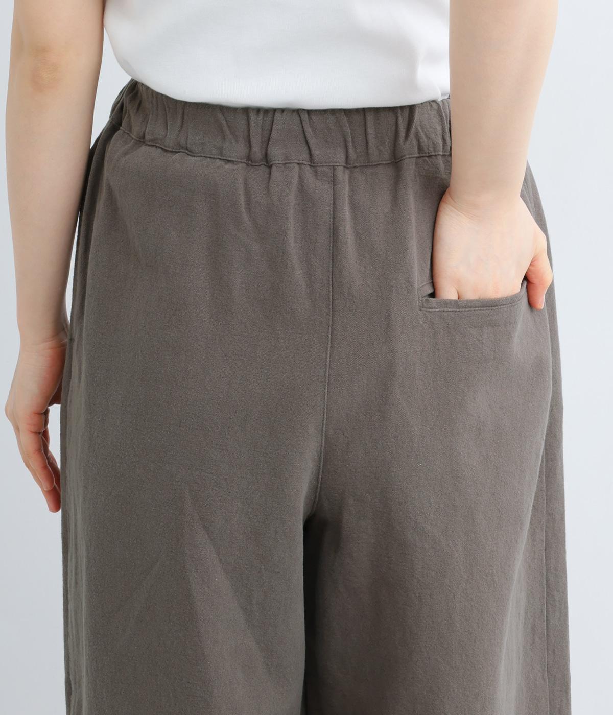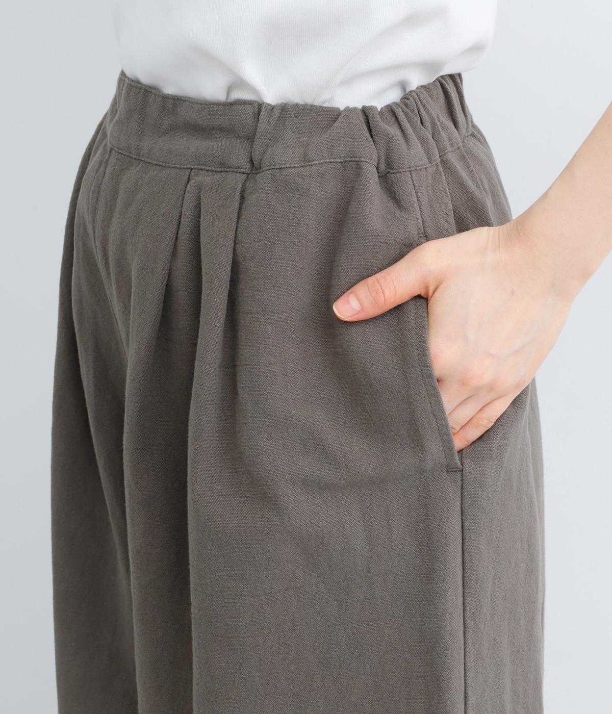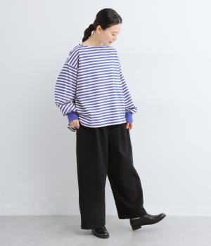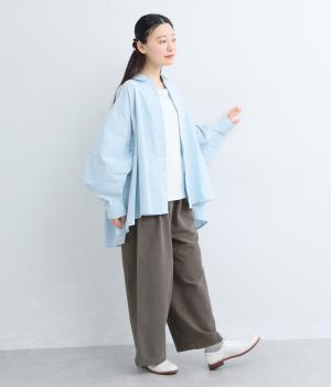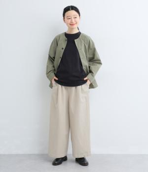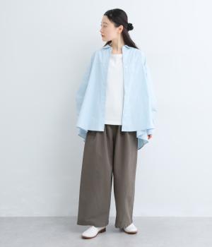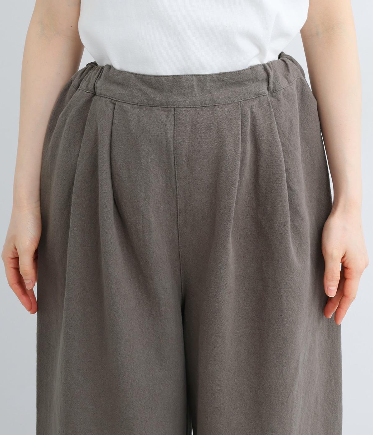 腰まわりや脚のラインを拾いにくいワイドシルエットパンツです。ウエストはサイドからうしろにかけてぐるりとゴムを配し、穿きやすさを確保しつつ、正面はすっきりとした見た目に。トップスインのスタイルもきれいにまとまります。