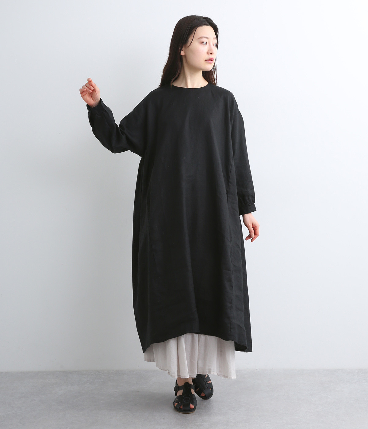 サイドマチとギャザーを入れ、奥行きのある構築的なシルエットを描いたワンピース。長めのドルマンスリーブは、無造作にロールアップした抜け感のある着こなしもおすすめです。シンプルな中にも、ちいさなこだわりが光る一枚です。