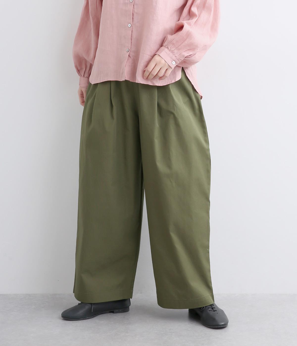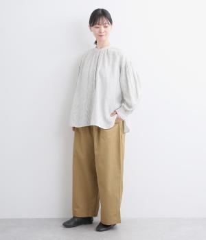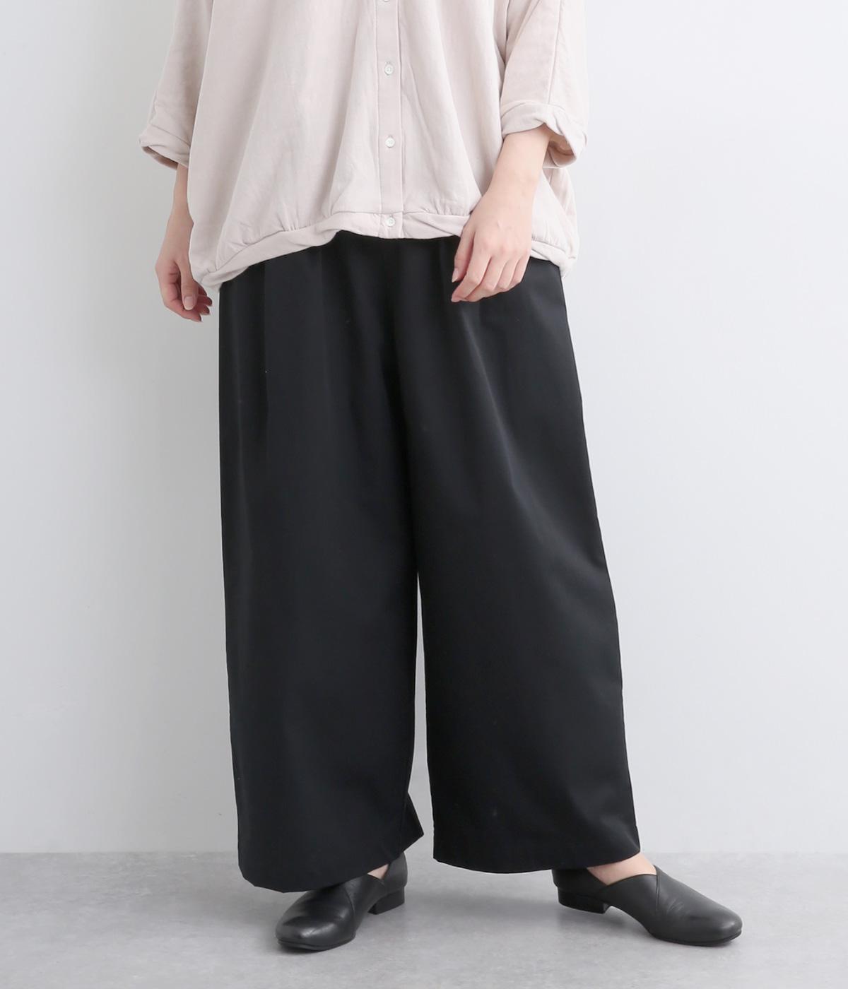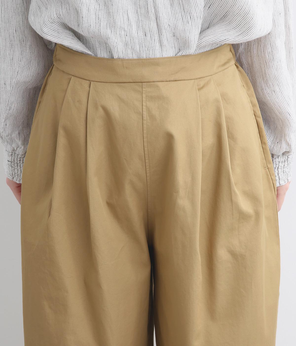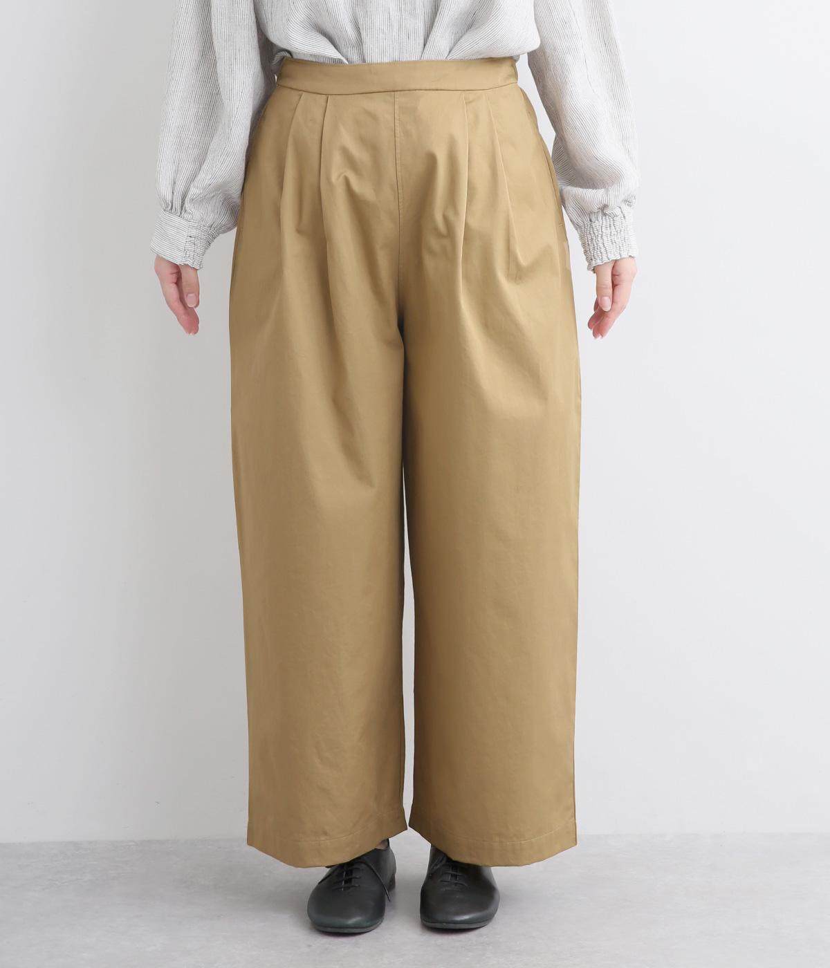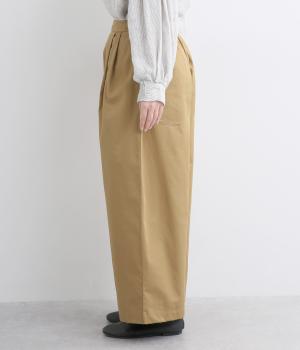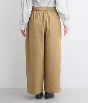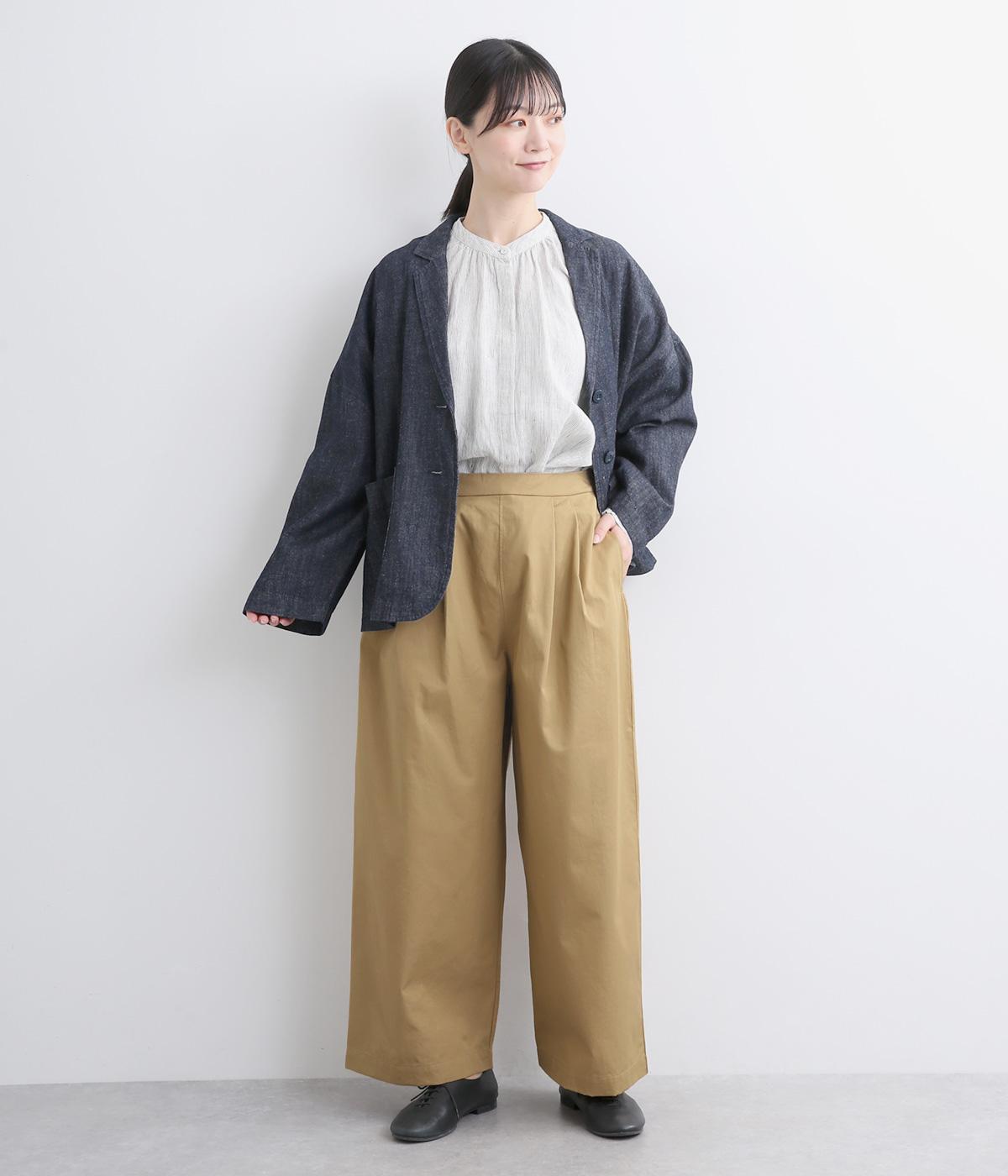 タックを入れたワイドシルエットはストレートラインですっきりと仕上げました。ウエストは後ろにゴムを入れてフィット感をもたせ、前ベルトでトップスインもきれいに決まります。内紐を通しているので微調整も可能。