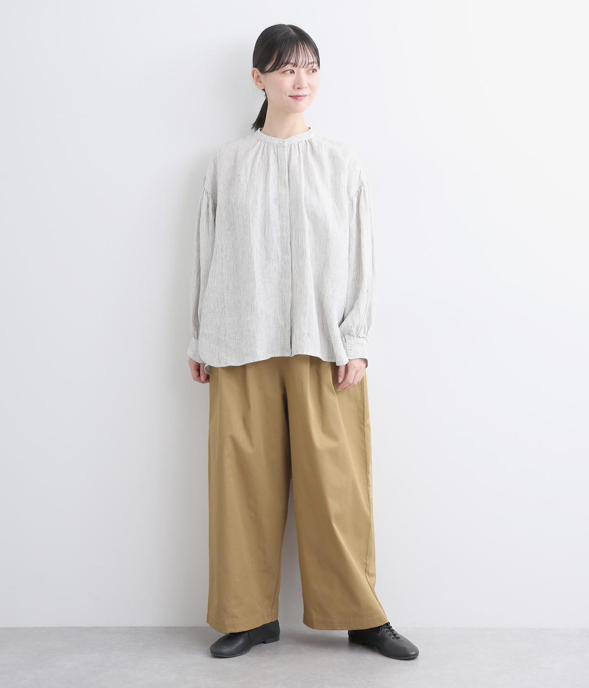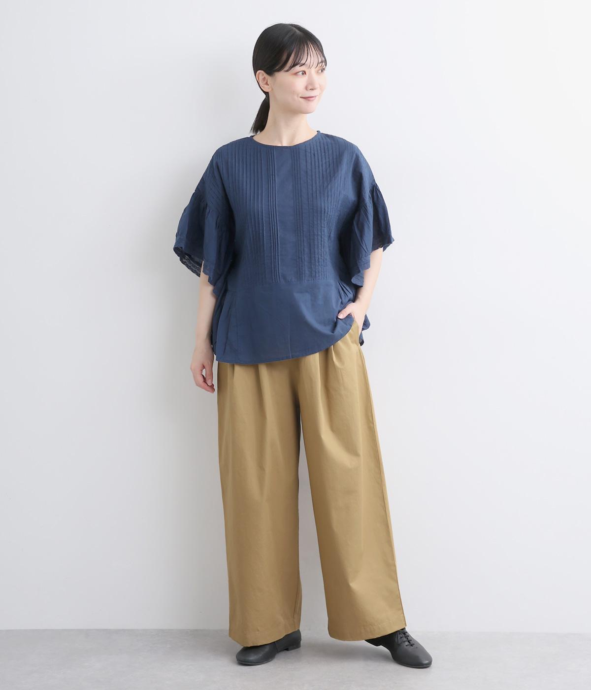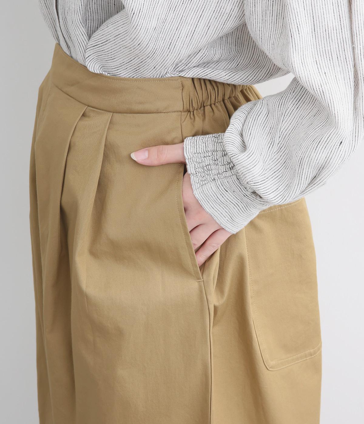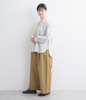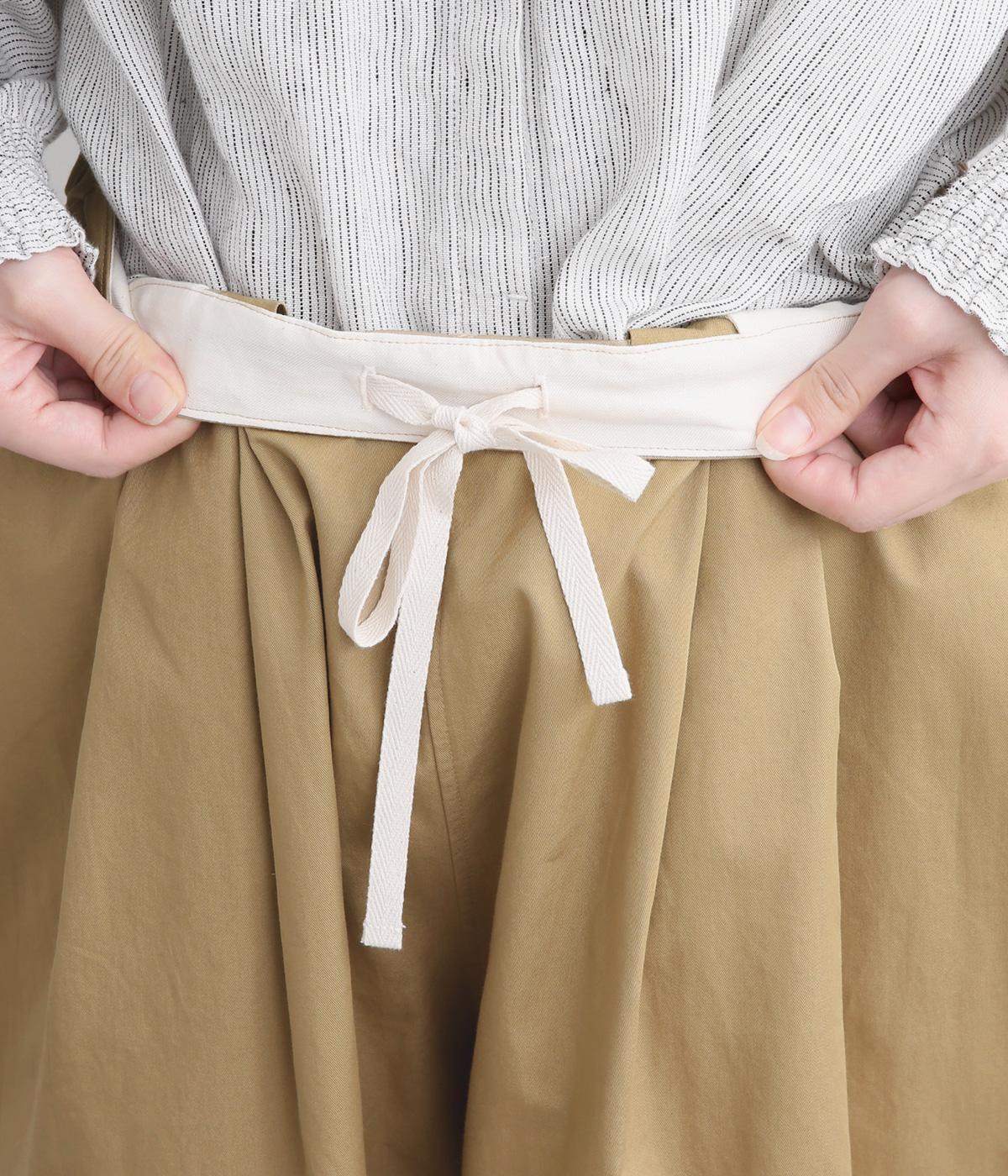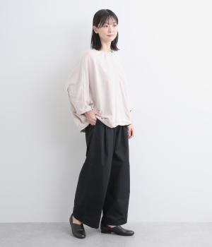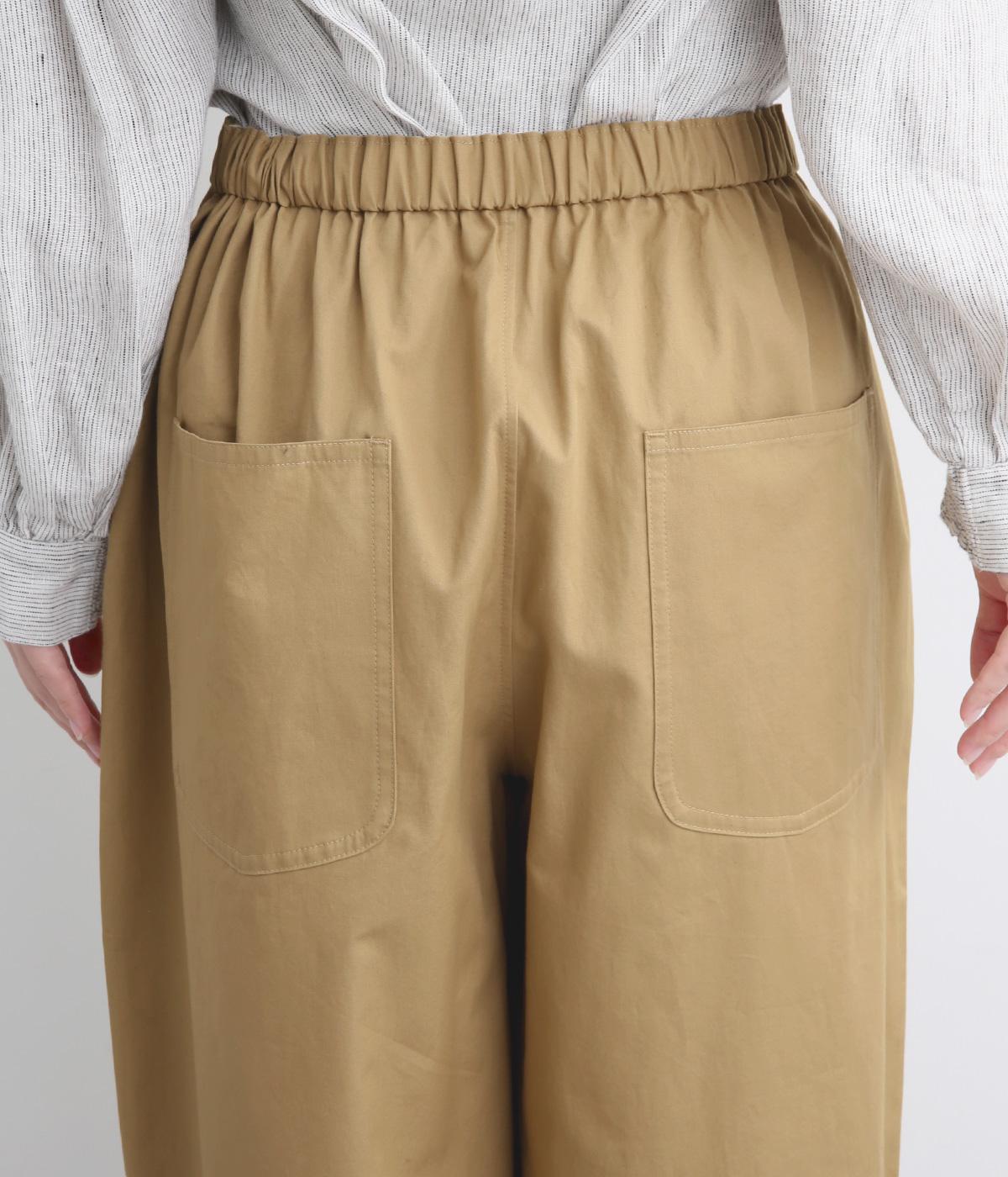 タックを入れたワイドシルエットはストレートラインですっきりと仕上げました。ウエストは後ろにゴムを入れてフィット感をもたせ、前ベルトでトップスインもきれいに決まります。内紐を通しているので微調整も可能。