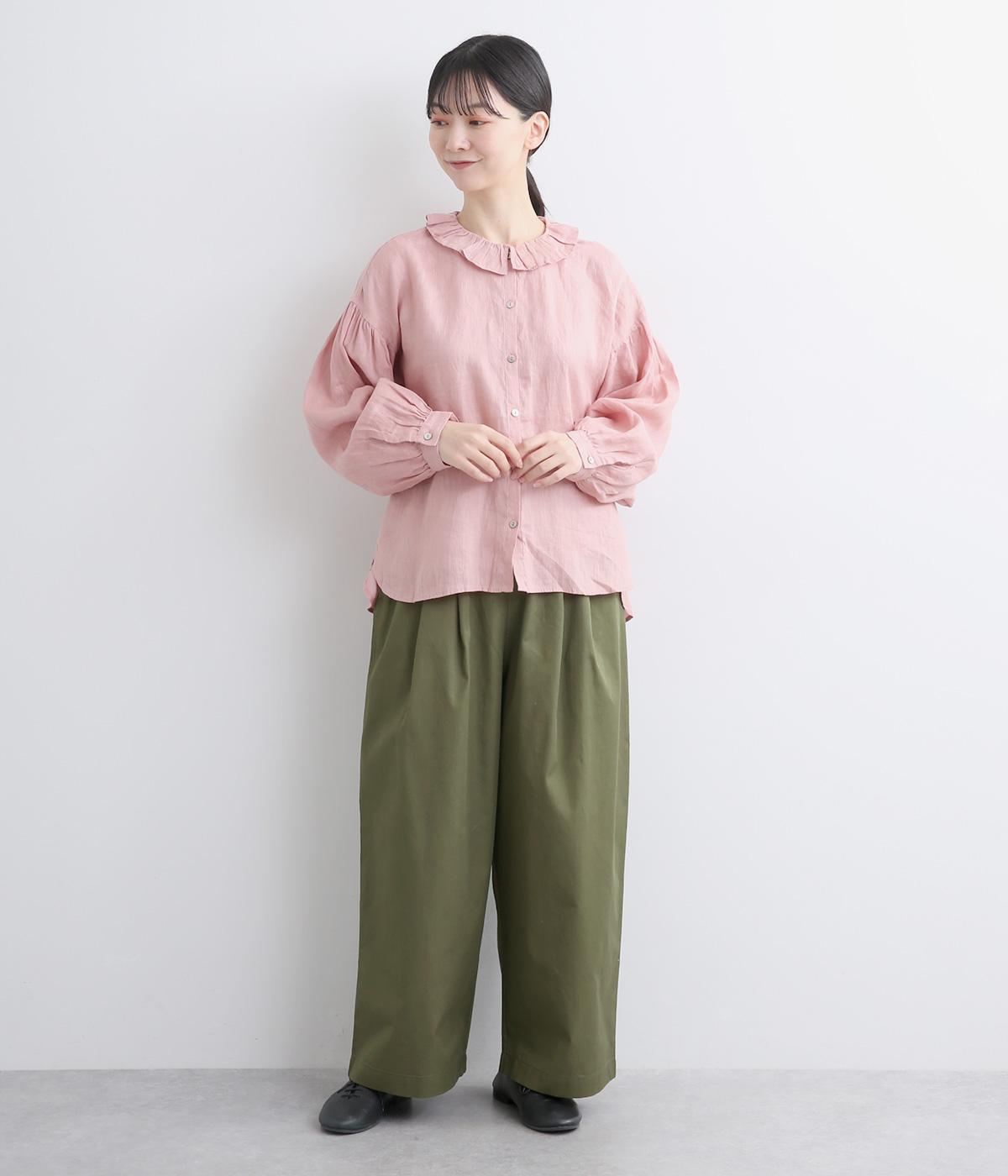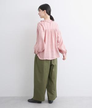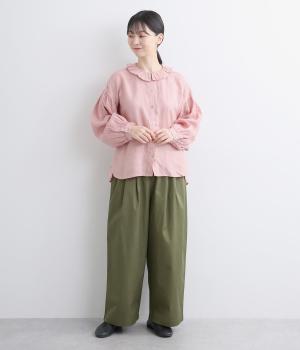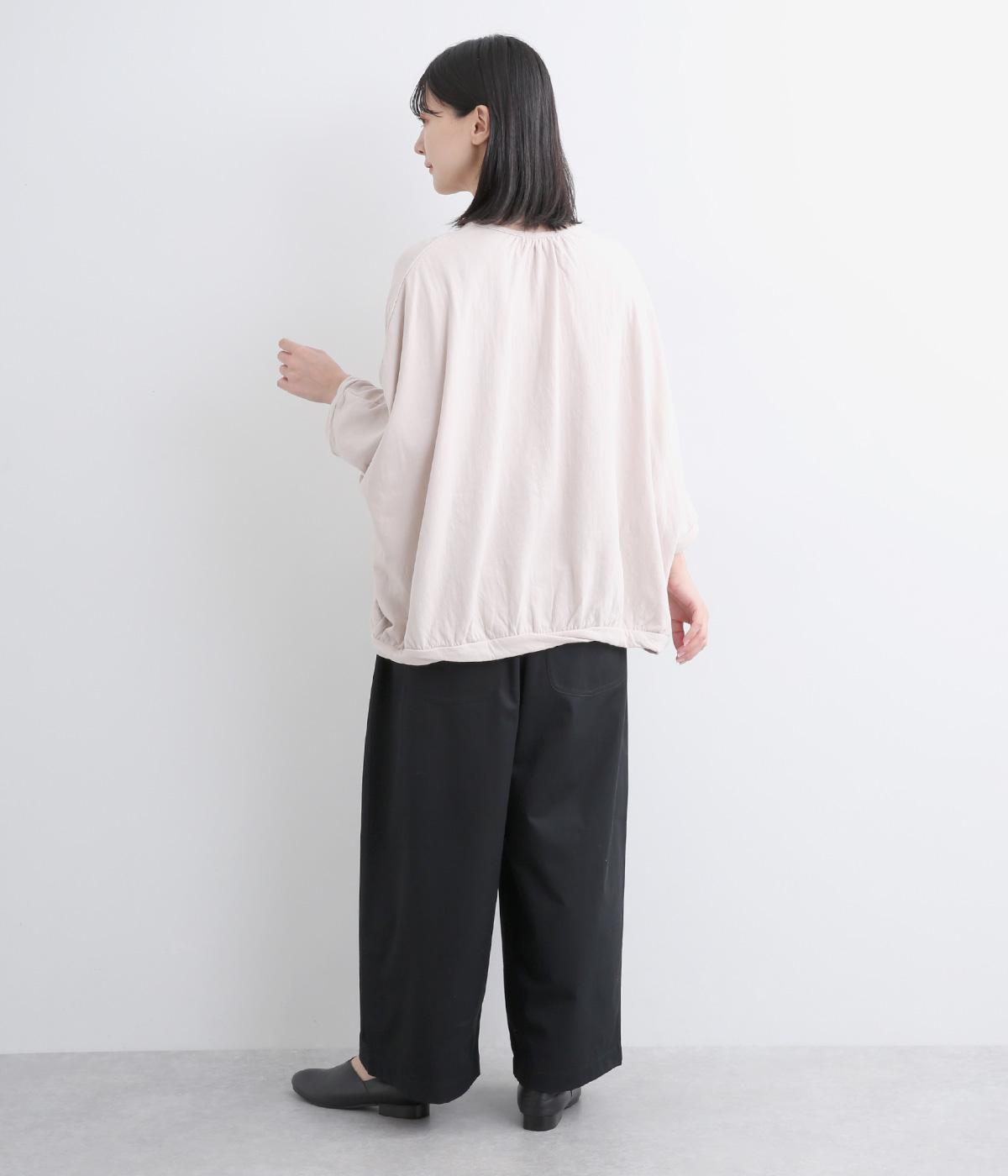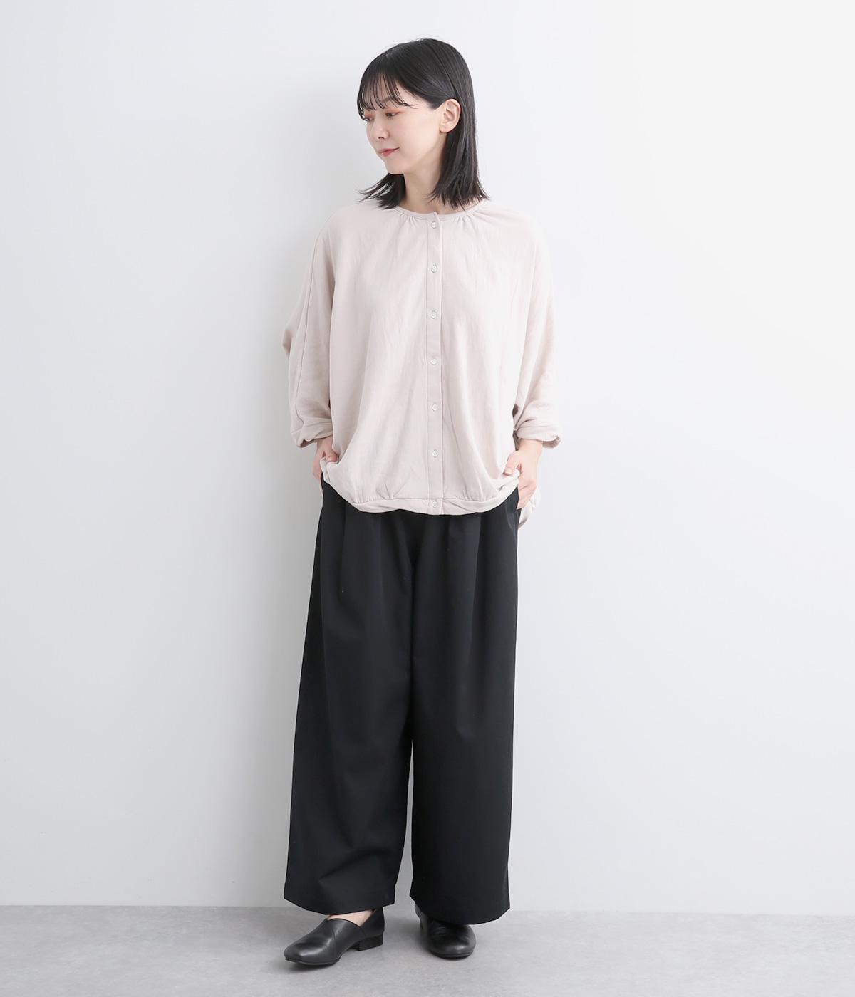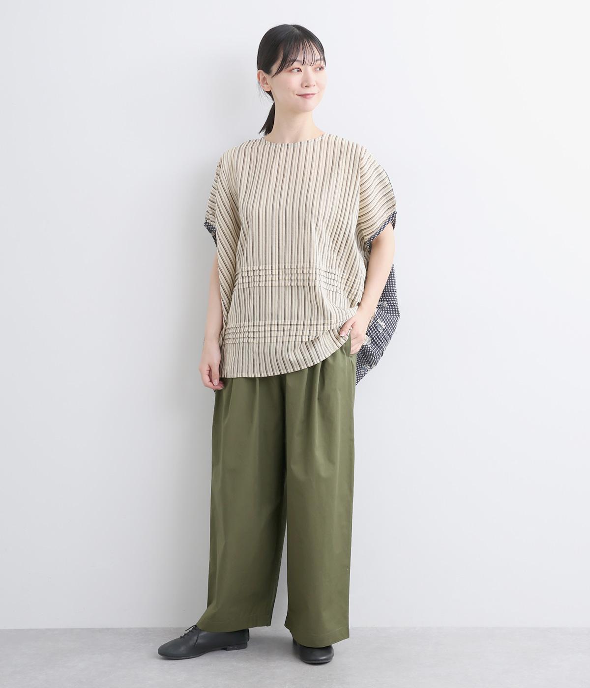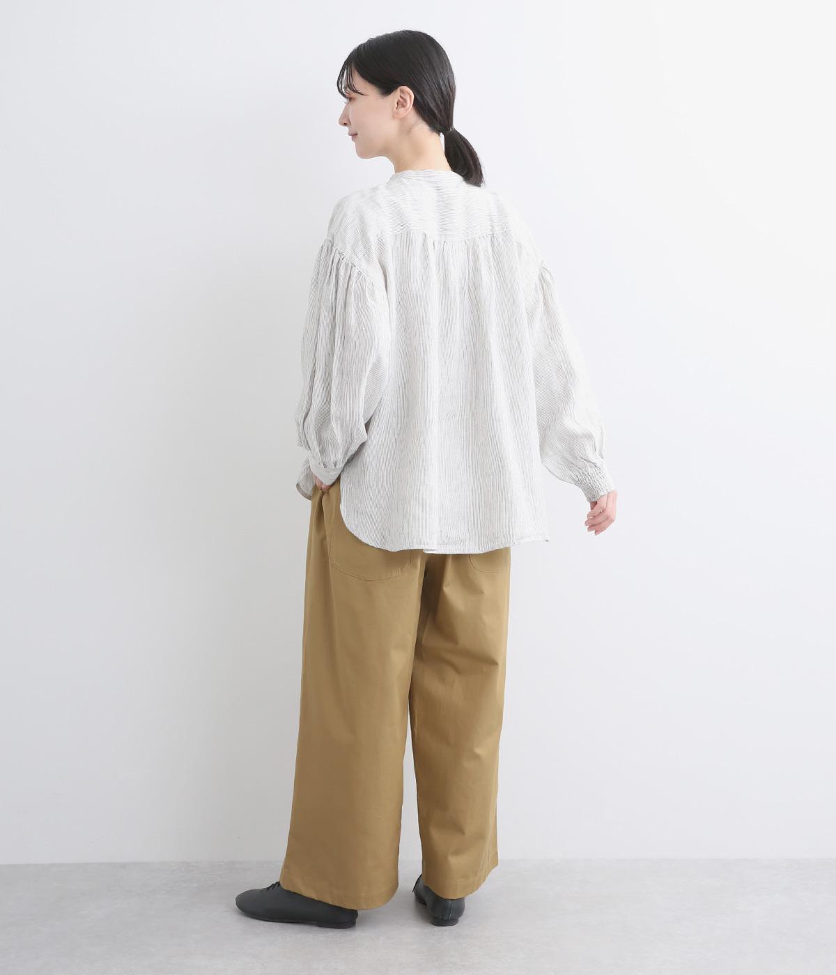 タックを入れたワイドシルエットはストレートラインですっきりと仕上げました。ウエストは後ろにゴムを入れてフィット感をもたせ、前ベルトでトップスインもきれいに決まります。内紐を通しているので微調整も可能。