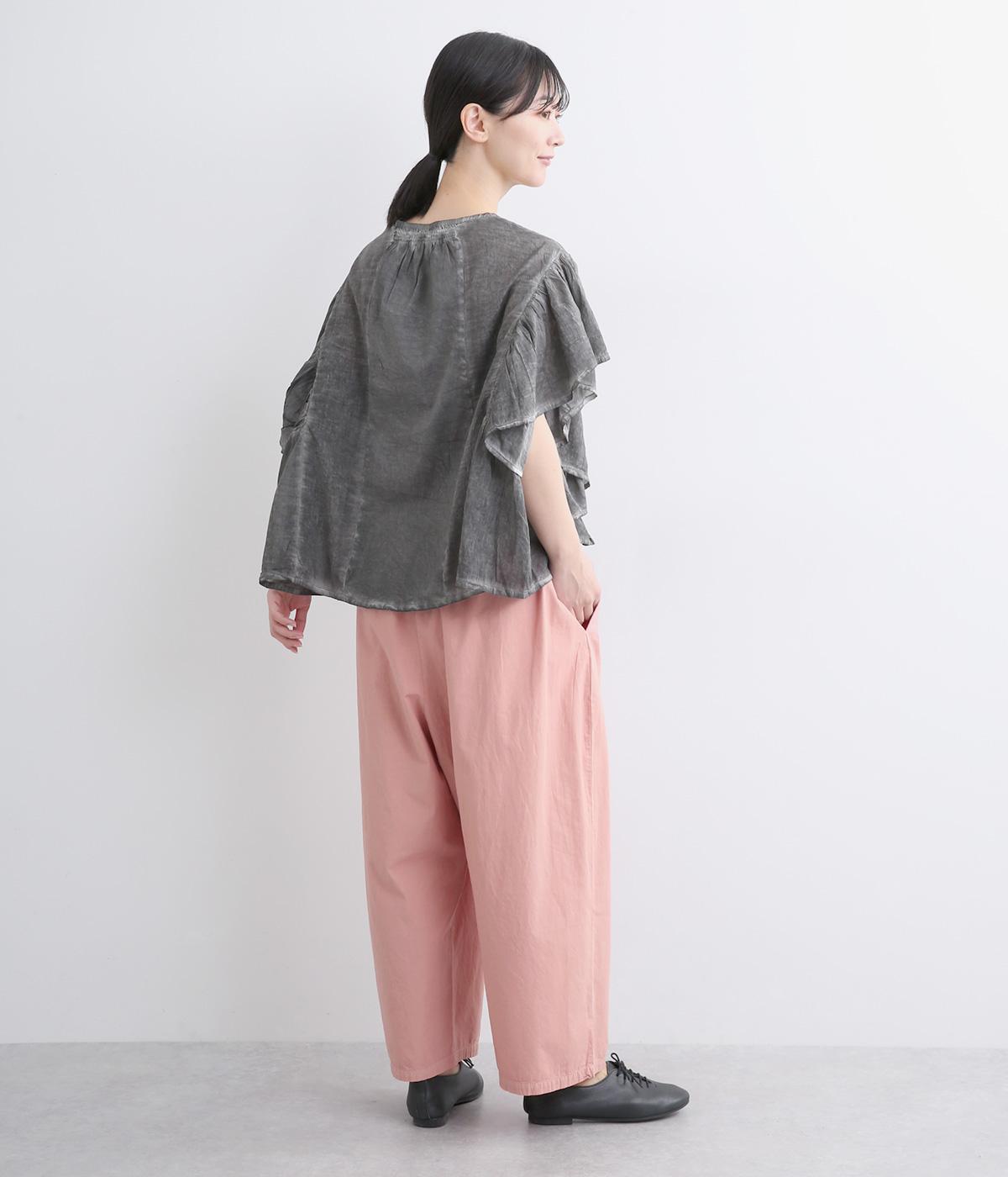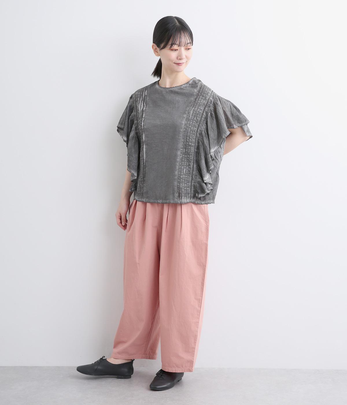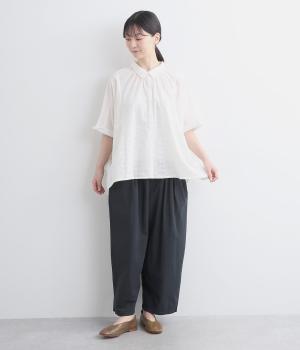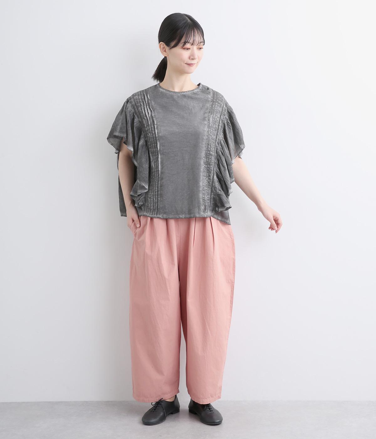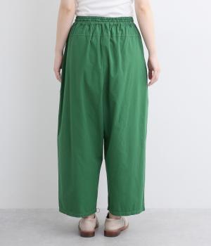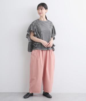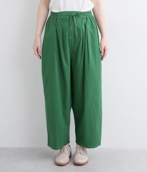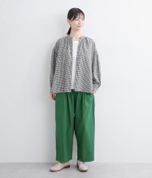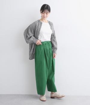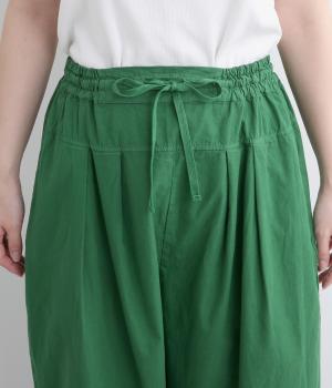 切り替えを入れてウエストから腰にかけてすっきり見せ、下はタックを入れて適度にゆとりを持たせました。ウエストはゴム入りのリラックス仕様で、アウトの調整紐はデザインポイントにも。軽やかな素材でラフにロールアップするのも◎。
