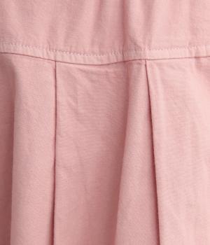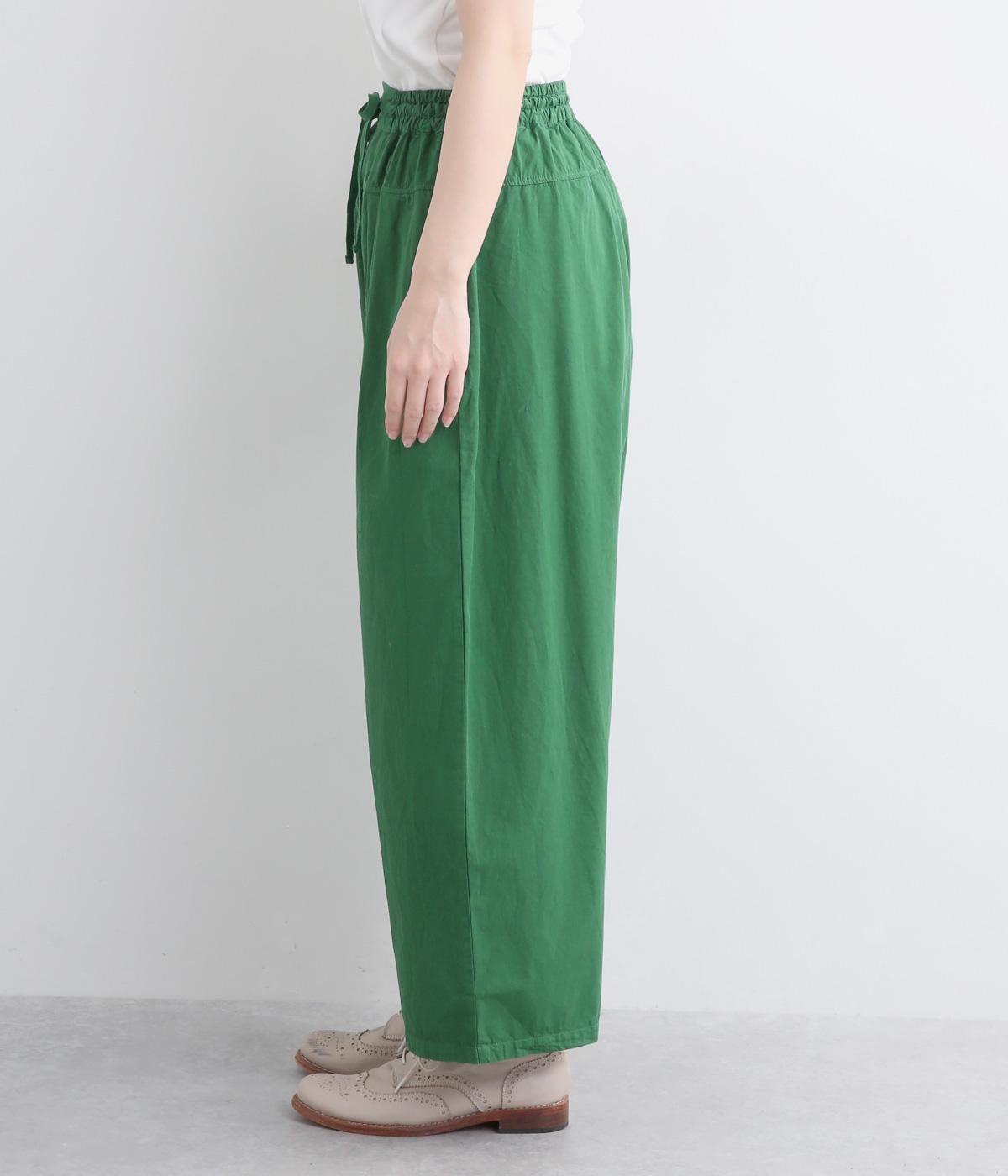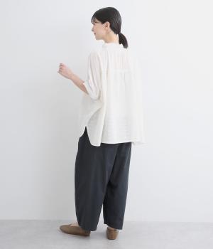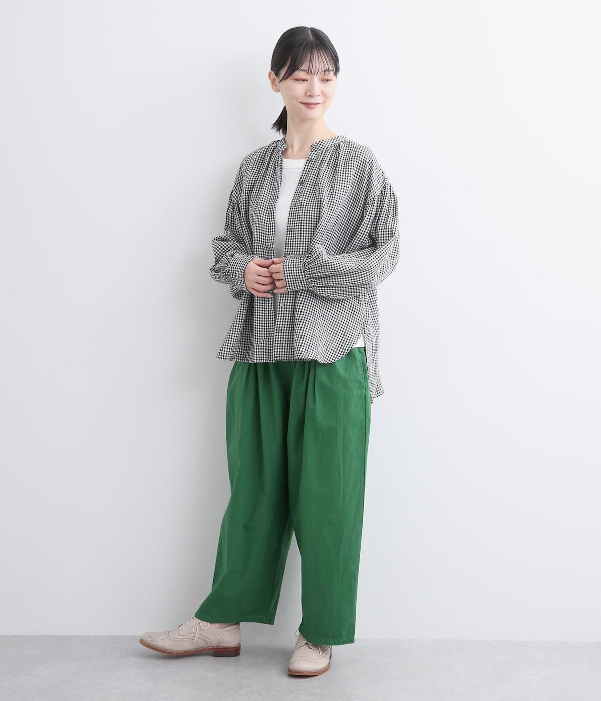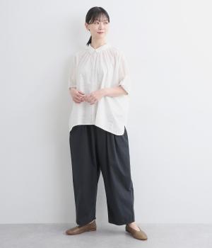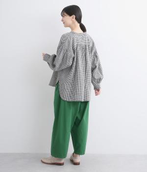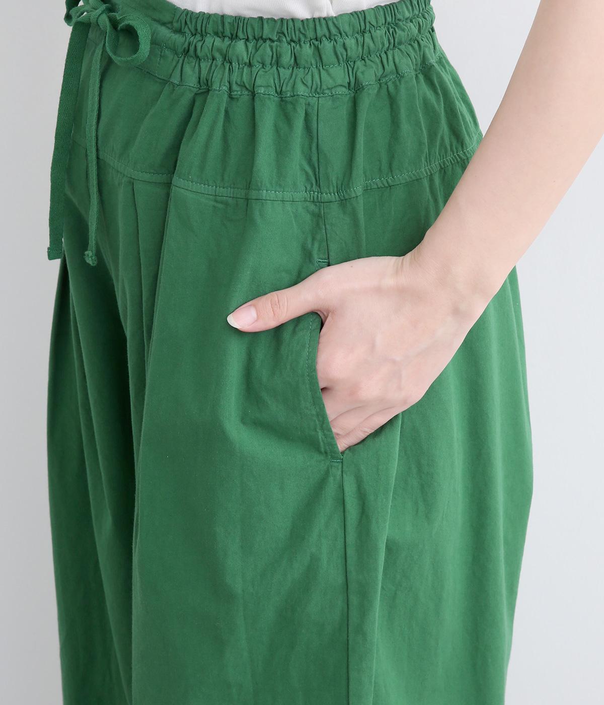 切り替えを入れてウエストから腰にかけてすっきり見せ、下はタックを入れて適度にゆとりを持たせました。ウエストはゴム入りのリラックス仕様で、アウトの調整紐はデザインポイントにも。軽やかな素材でラフにロールアップするのも◎。