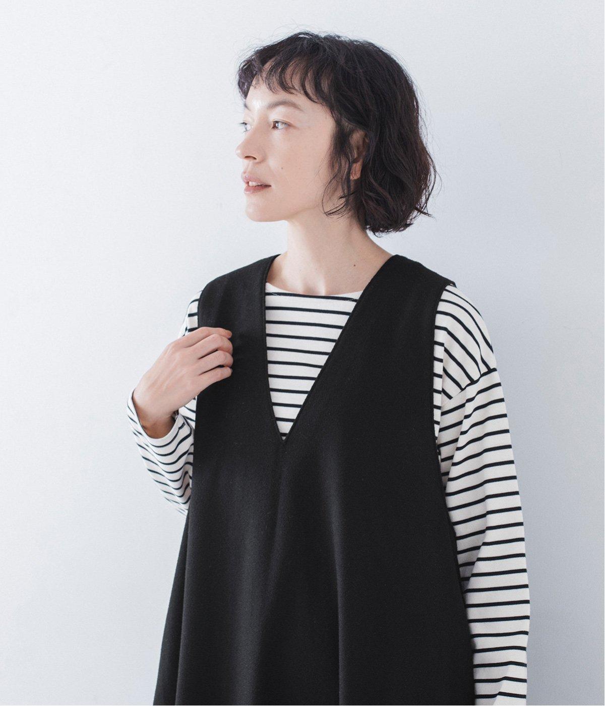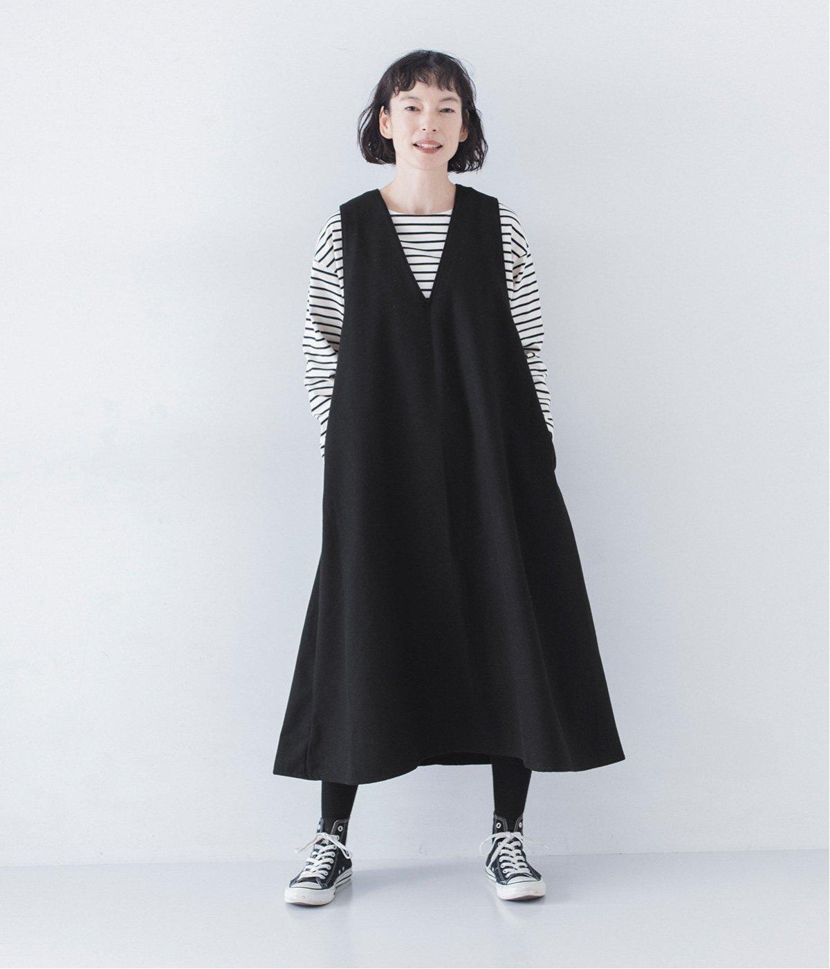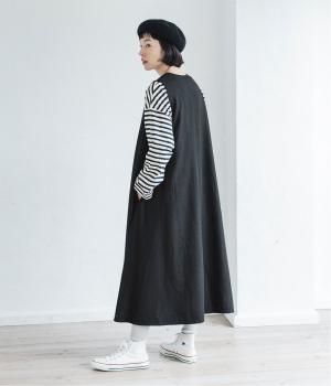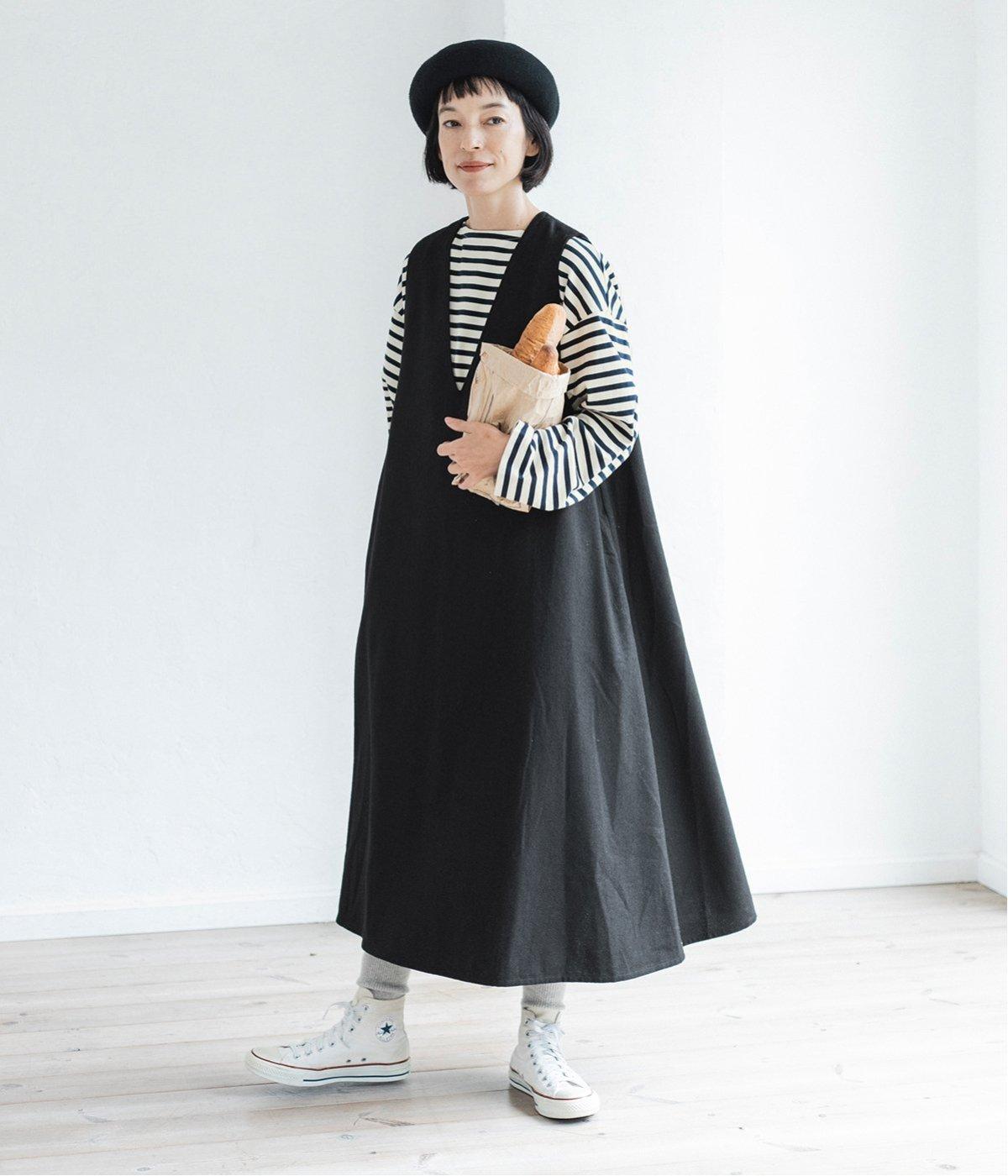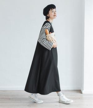 ボーダーカットソーとスニーカーを合わせたカジュアルコーデも<ブラック>のジャンパースカートが引き締め役に。落ち感と美しいドレープが立体的なシルエットを描きます。