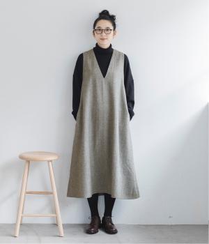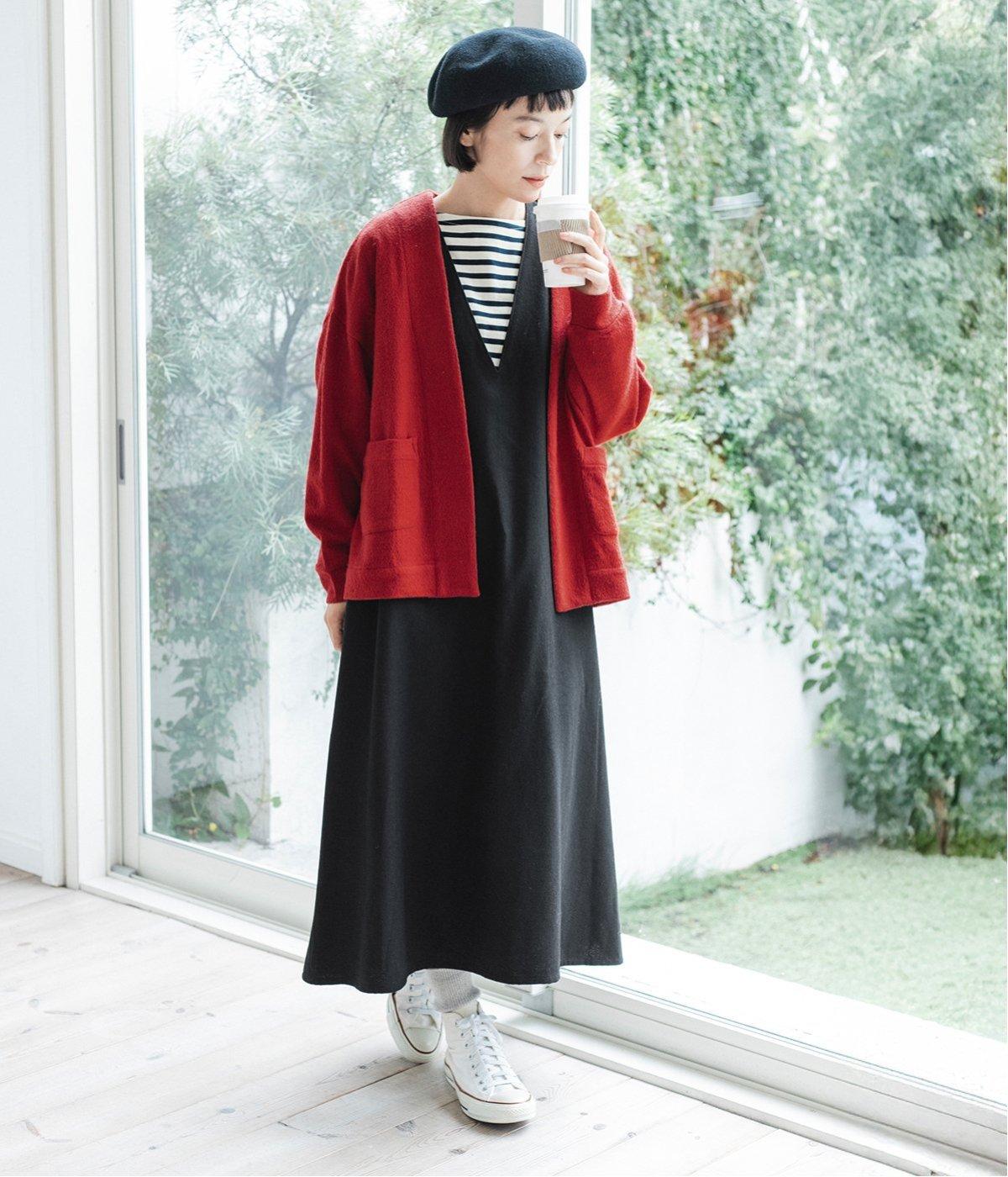 レッドのカーディガンを差し色にした、鮮度たっぷりのスタイリング。シックな着こなしから、カジュアルまで幅広く対応できるジャンパースカートは、ワードローブにあると重宝します。