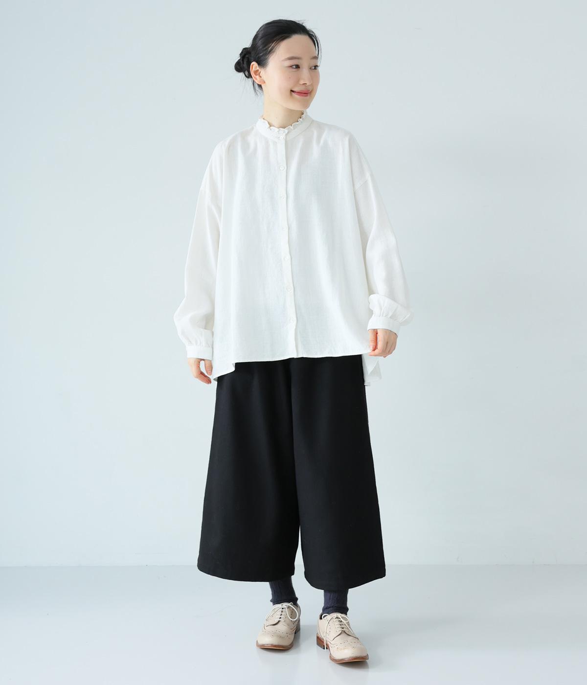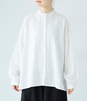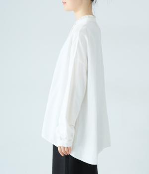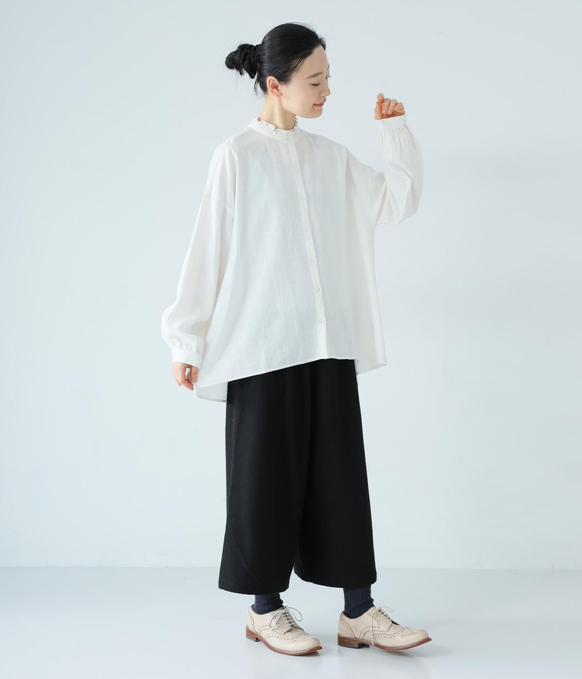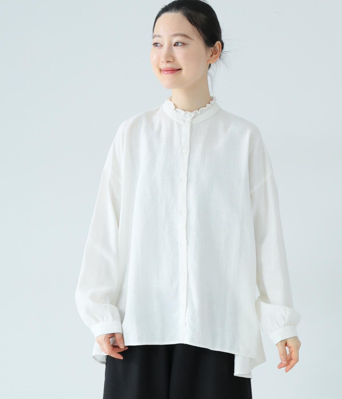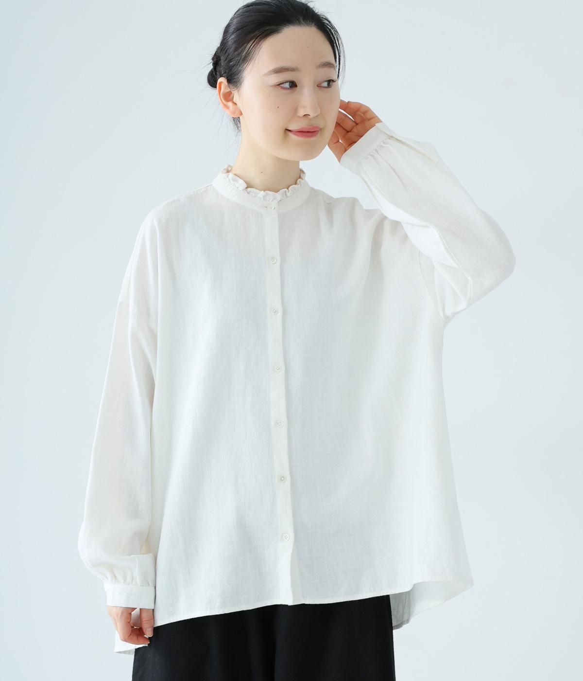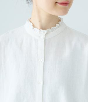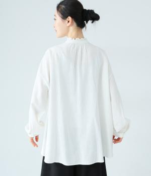 華やかすぎない繊細なフリルカラーが、顔まわりをやさしく彩るブラウス。一枚ではもちろん、カーディガンやニットとも重ねやすいデザインです。前後差のある着丈は、ヒップラインを自然にカバーし、着こなしに抜け感をあたえます。