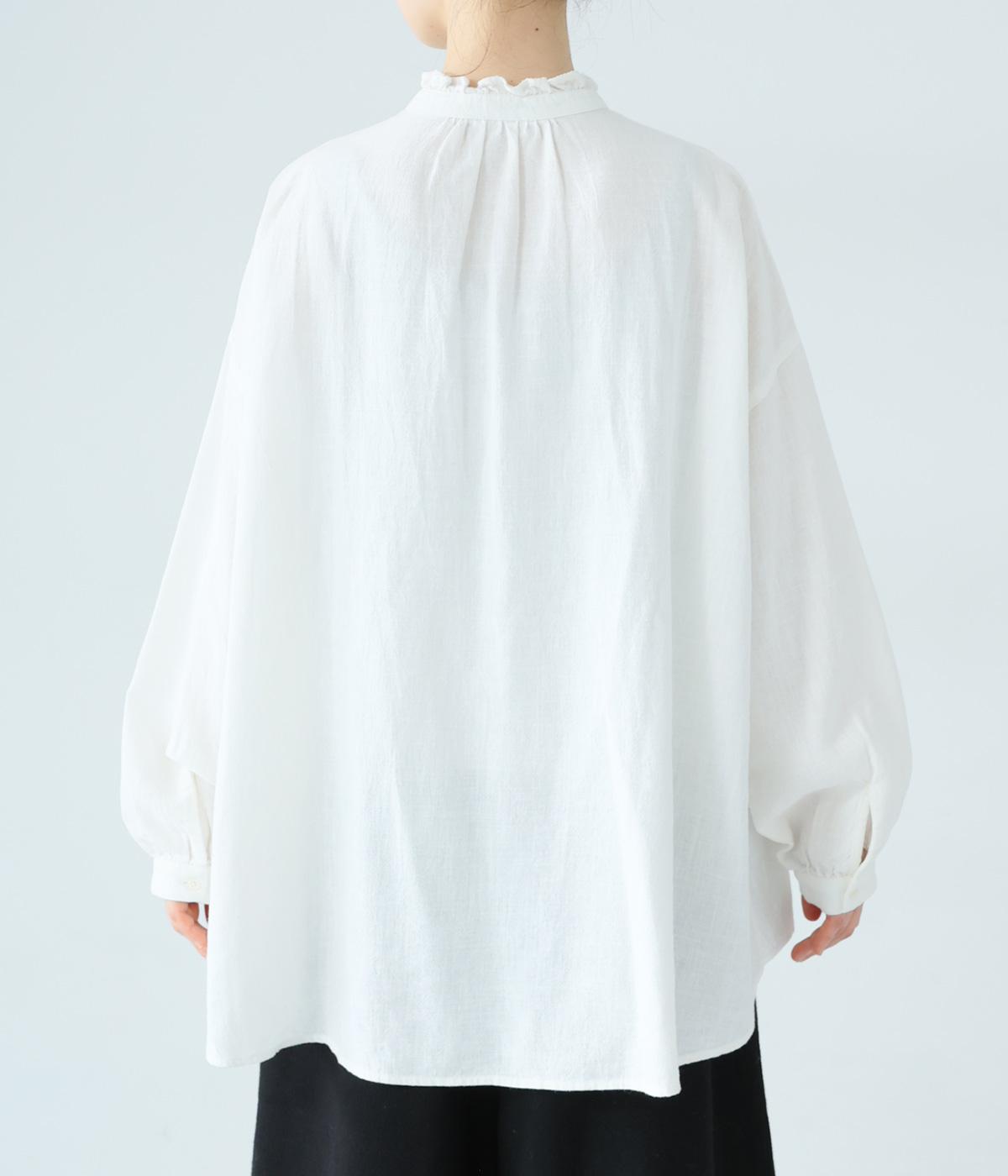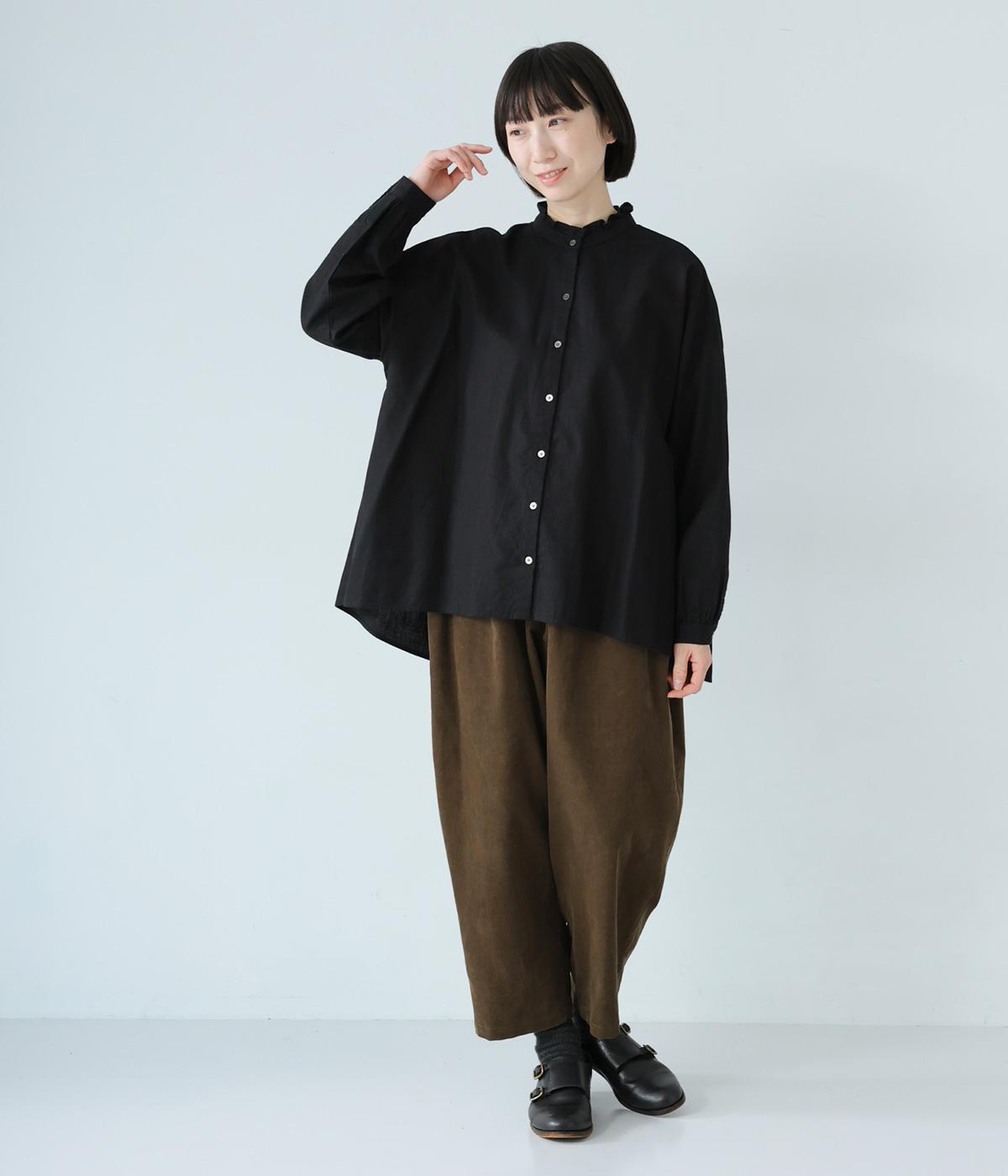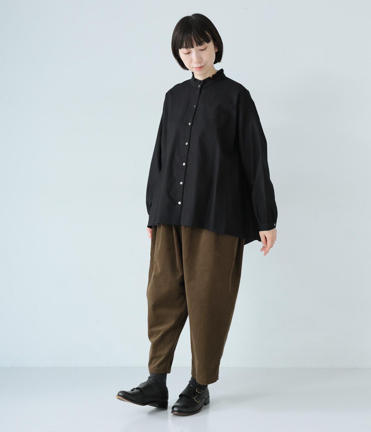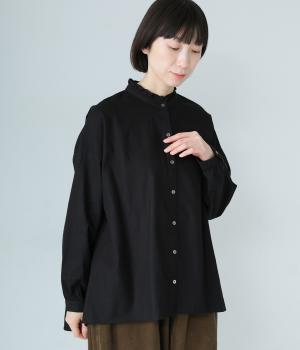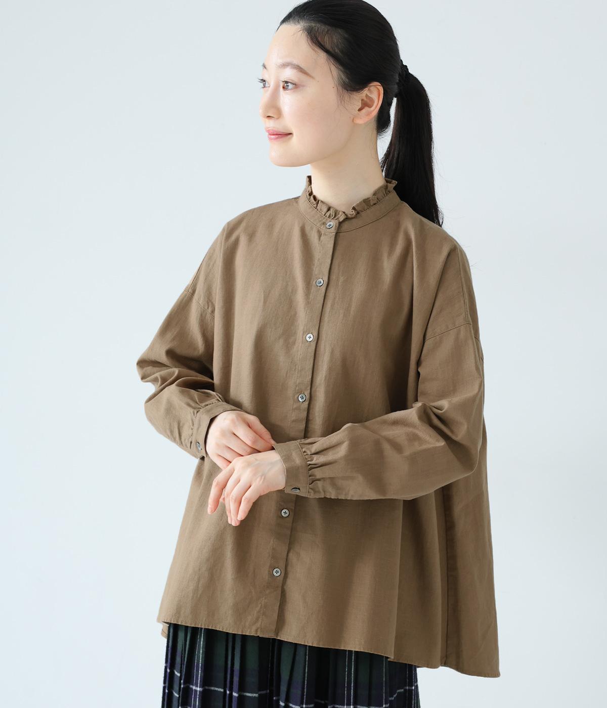 華やかすぎない繊細なフリルカラーが、顔まわりをやさしく彩るブラウス。一枚ではもちろん、カーディガンやニットとも重ねやすいデザインです。前後差のある着丈は、ヒップラインを自然にカバーし、着こなしに抜け感をあたえます。