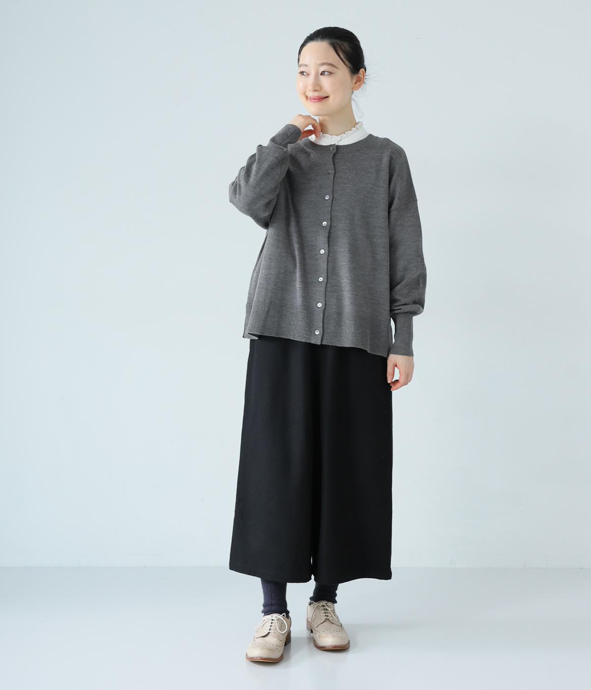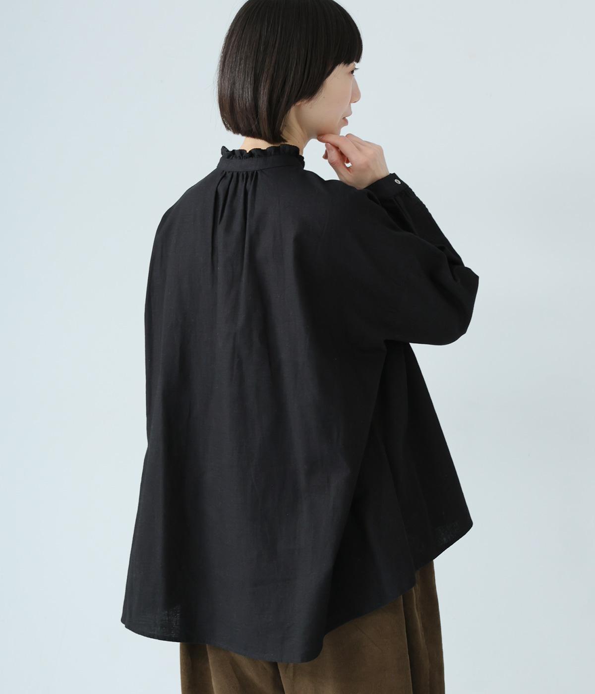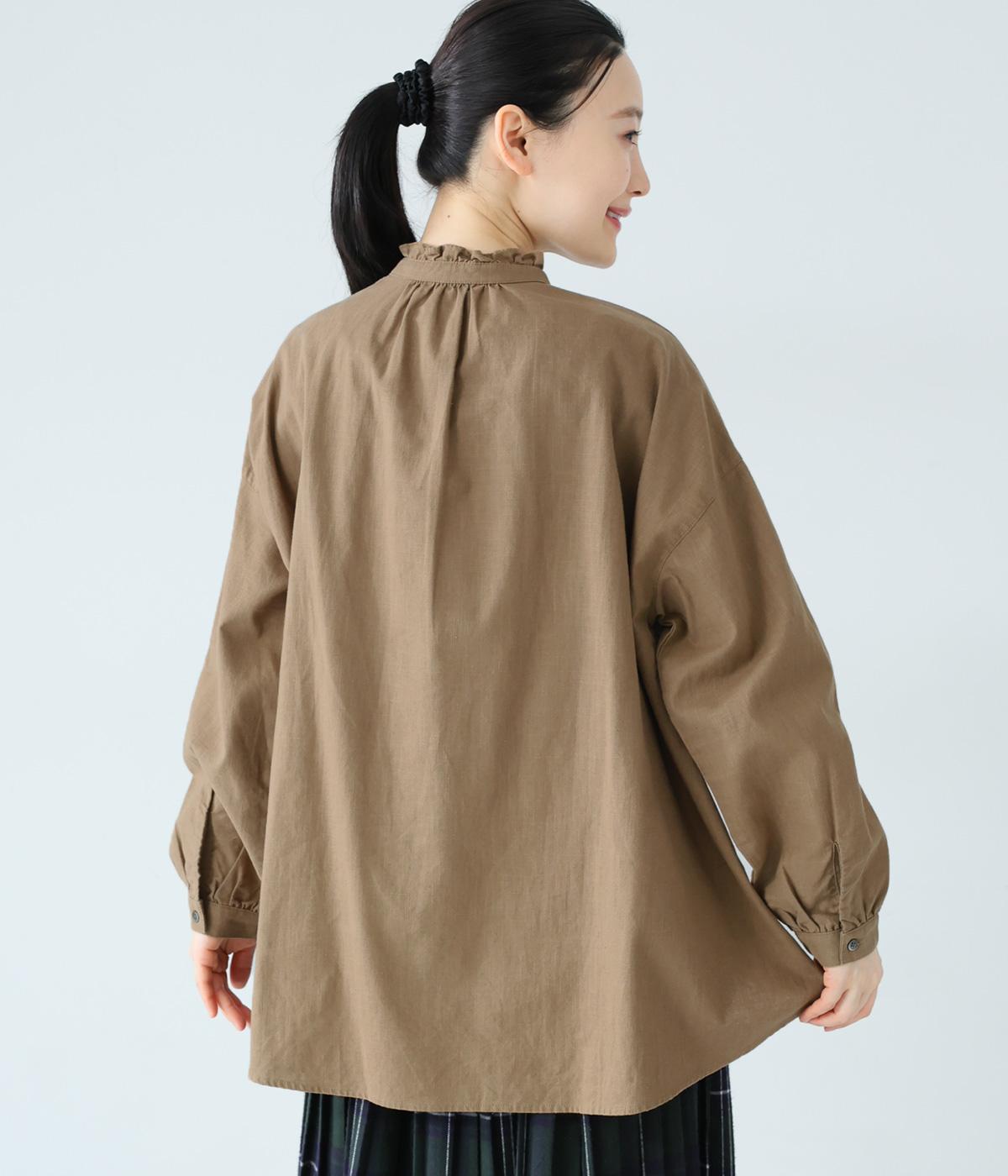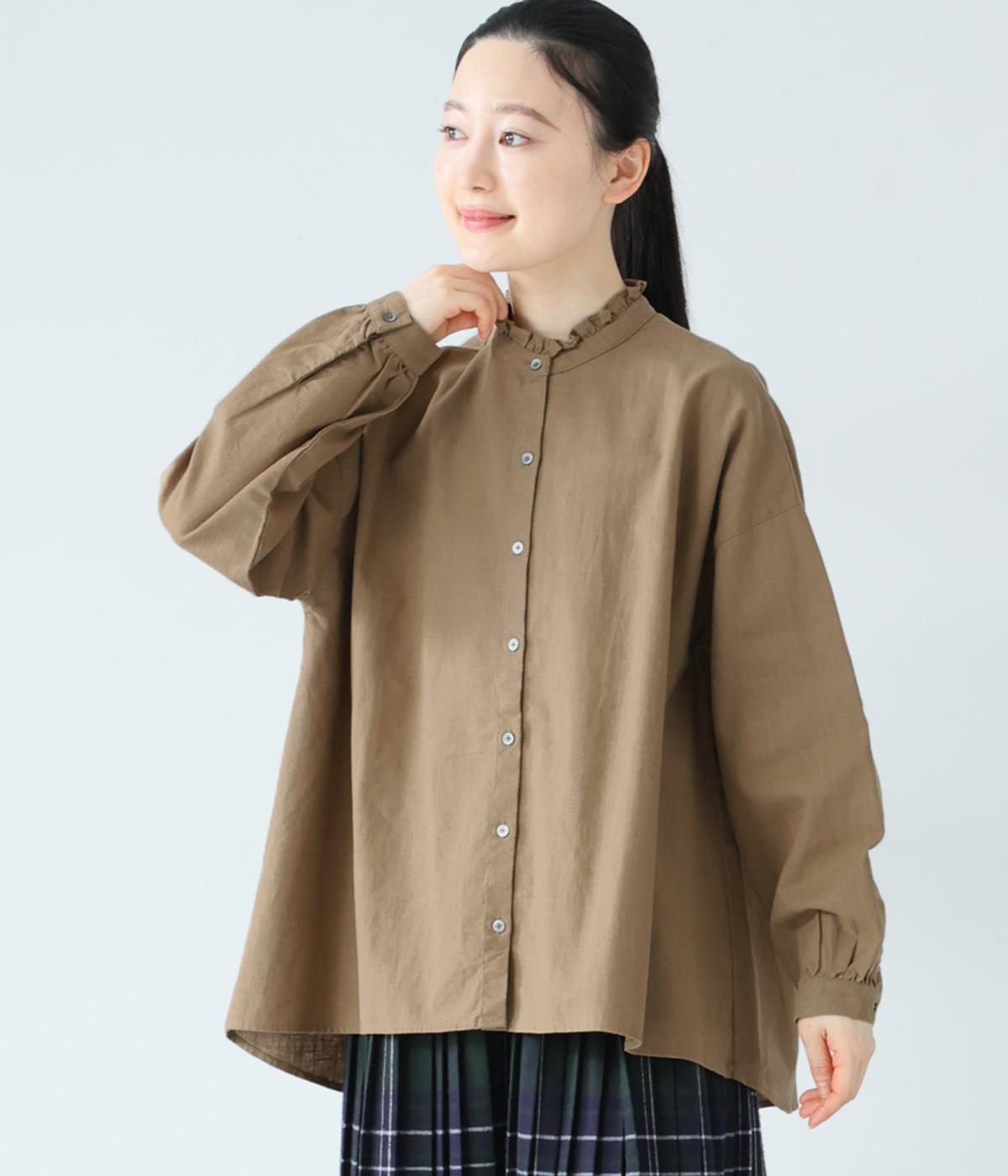華やかすぎない繊細なフリルカラーが、顔まわりをやさしく彩るブラウス。一枚ではもちろん、カーディガンやニットとも重ねやすいデザインです。前後差のある着丈は、ヒップラインを自然にカバーし、着こなしに抜け感をあたえます。